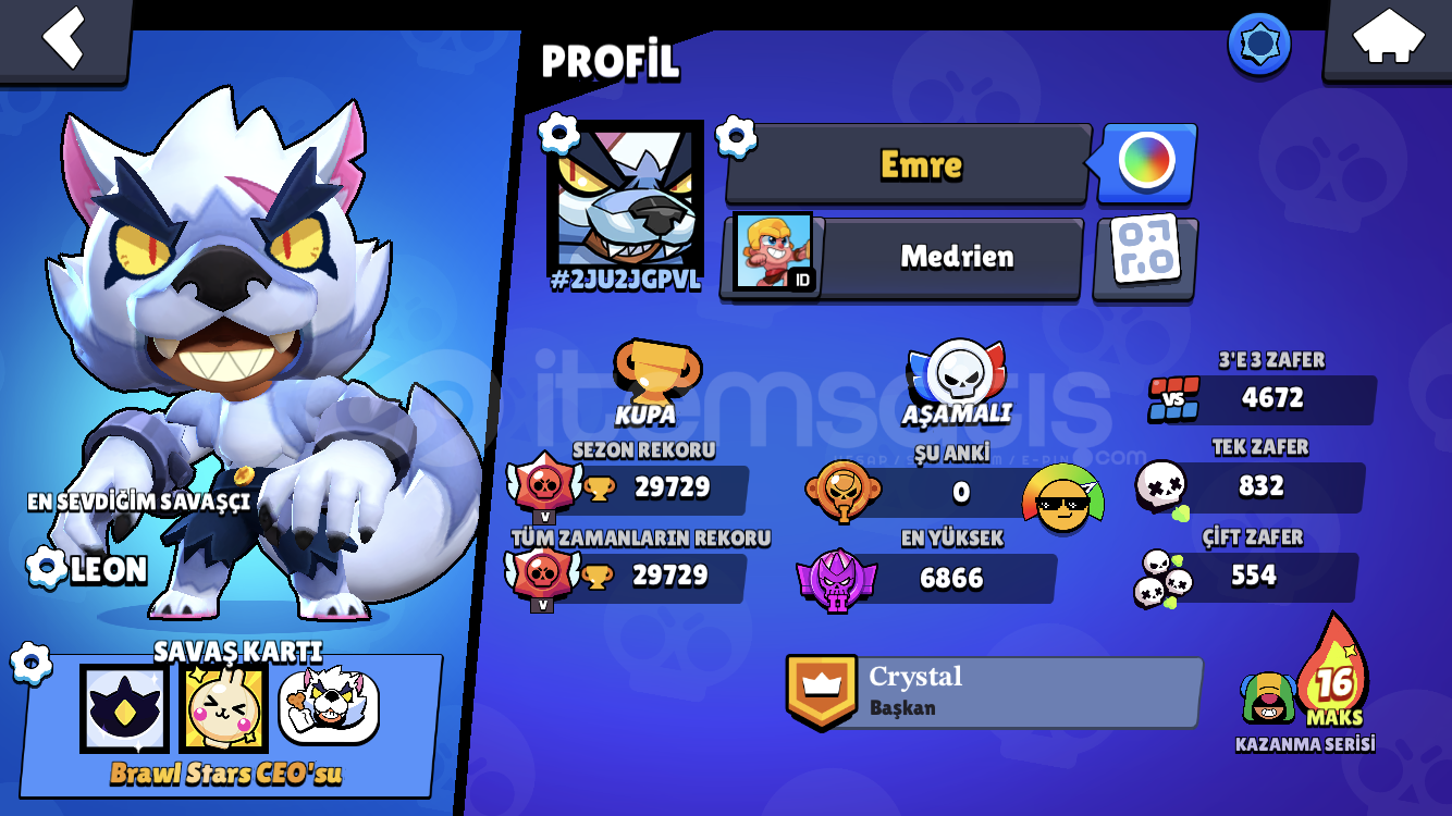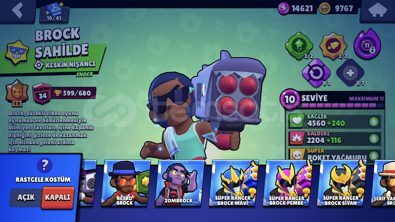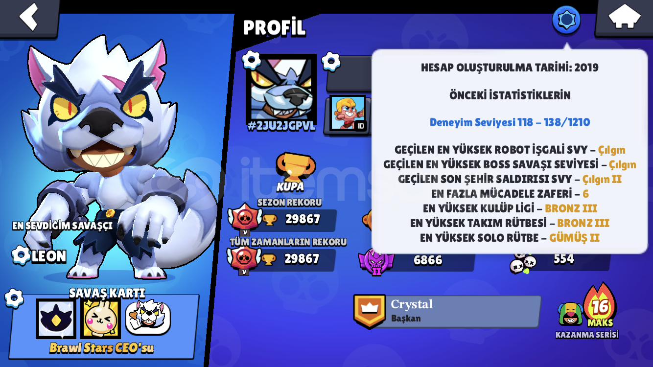 AÇIKLAMA* 32.000 Kupa (FOTOĞRAFLAR ESKİ)* 68 Karakter (2-3 DAHA FAZLA OLABİLİR)* 112 Adet Kostüm (Çoğu 79 Taş Üzeri)* 2019 Hesap Oluşturma TarihiBOL BOL MARKETTE SATILMAYAN KOSTÜMLER VARDIR* Ricochet (+Kırmızı Ricochet)* Kırmızı Ejderha Jessie* Korsan Poco* Kaptan Carl* Kötü Taraf Carl* Beyaz Kurt Adam Leon* Barbar Kral Bull* Retro Brock* Sandy Jessie* Dünya Kupası Jessie* Bay Yenge&...
