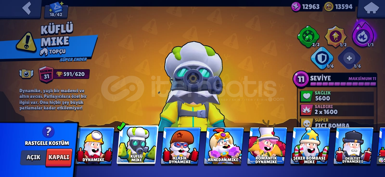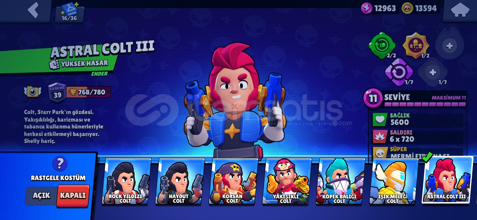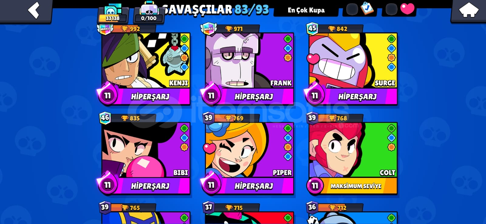 hesapta;-2 brawl pass alınmıştır-83 karakter vardır42 ender45 süper ender62 destansı4 gizemli4 efsanevi3 hiperşarj skin bulunmaktadır-dilerseniz hesap ismini ücretsiz değiştirebilirsiniz-2020 hesabıdır-hesaba toplamda 600 tl civarı para yatırılmıştır-238 koleksiyon rozeti bulunmaktadır-mail olarak teslim edilecektir dilerseniz sonradan maili değiştirebilirsiniz alıcısı...