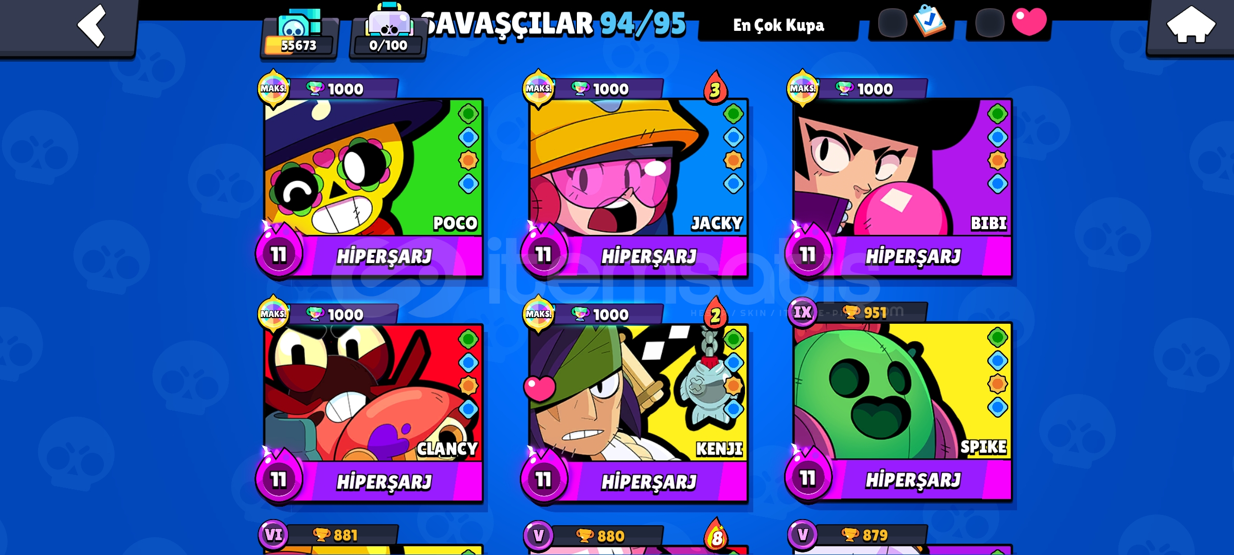 Hesap 55k kupadir önceden efsanevi olmuş48 tane hipersarj karakter var 8-10 tane Max karakter var kalan karakterlerde 10-9-8-7 level en düşük seviyeli karakter bile 7 level onceden asamalida efsanevi olmuş (8800 puan )aşamalıdaki brawl passta açık 94/95 karakter Hipersarj kostümlü kenji Thor bibi Meka crow meka mortis gibi efsanevi kostümler Var Satürn şöhreti III 1-2k kredi olursa ismini bilmiyorum ama atlıyo...