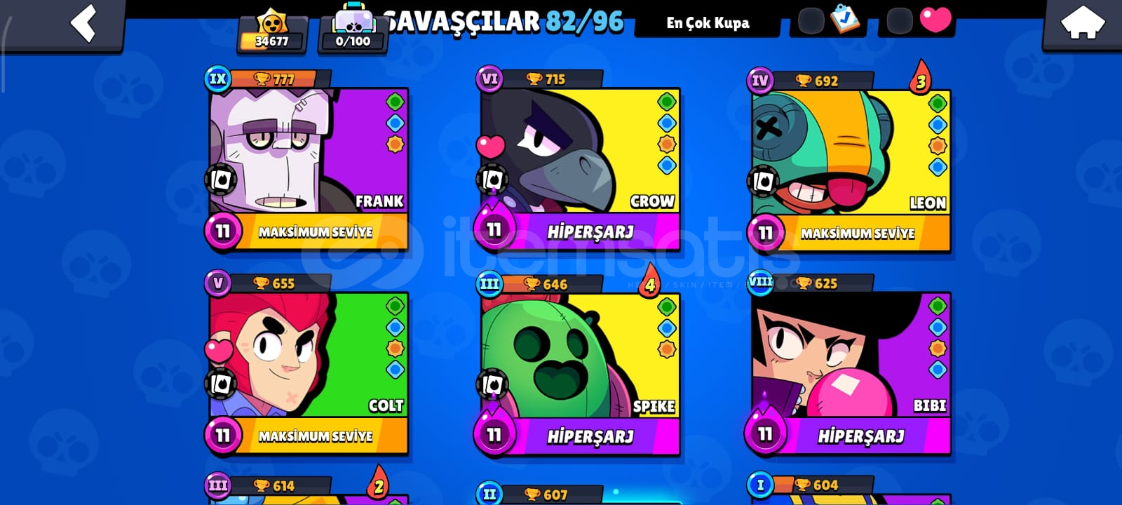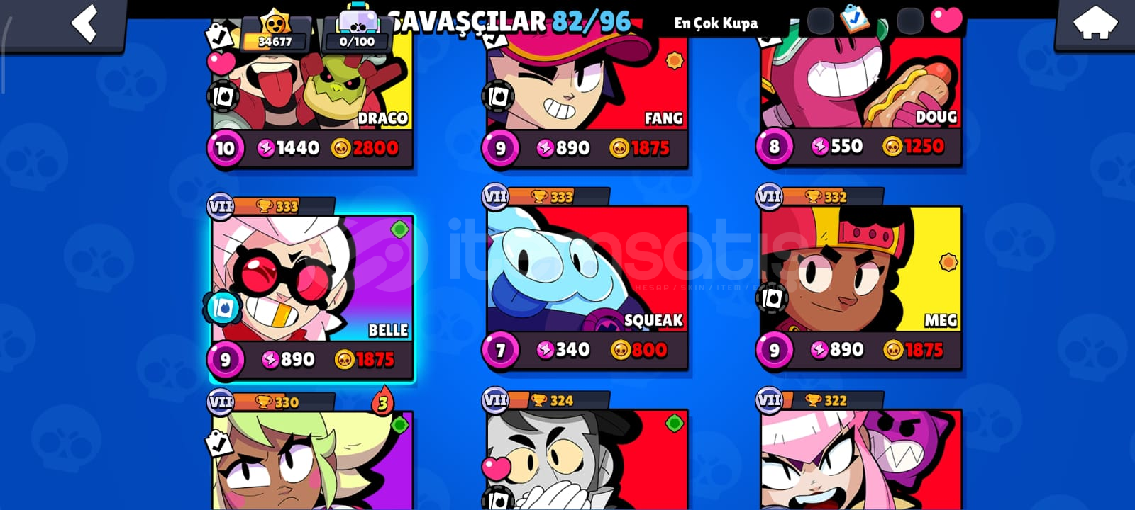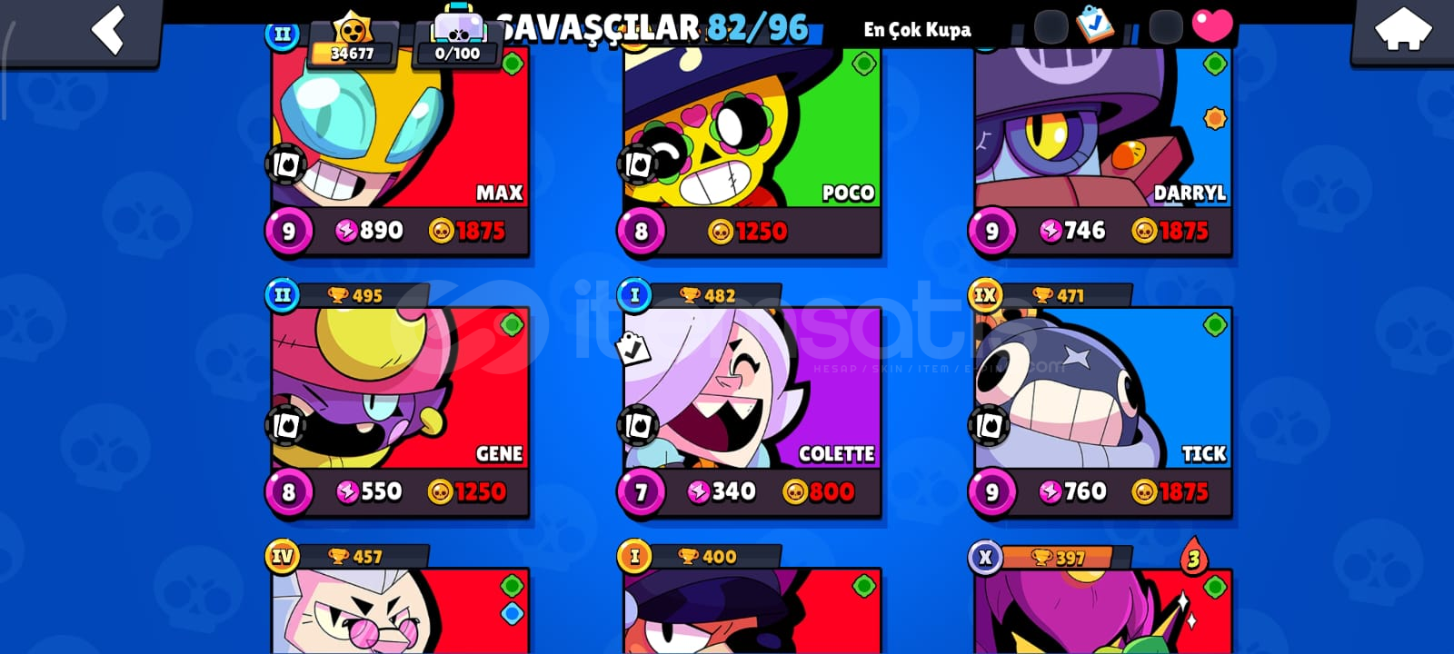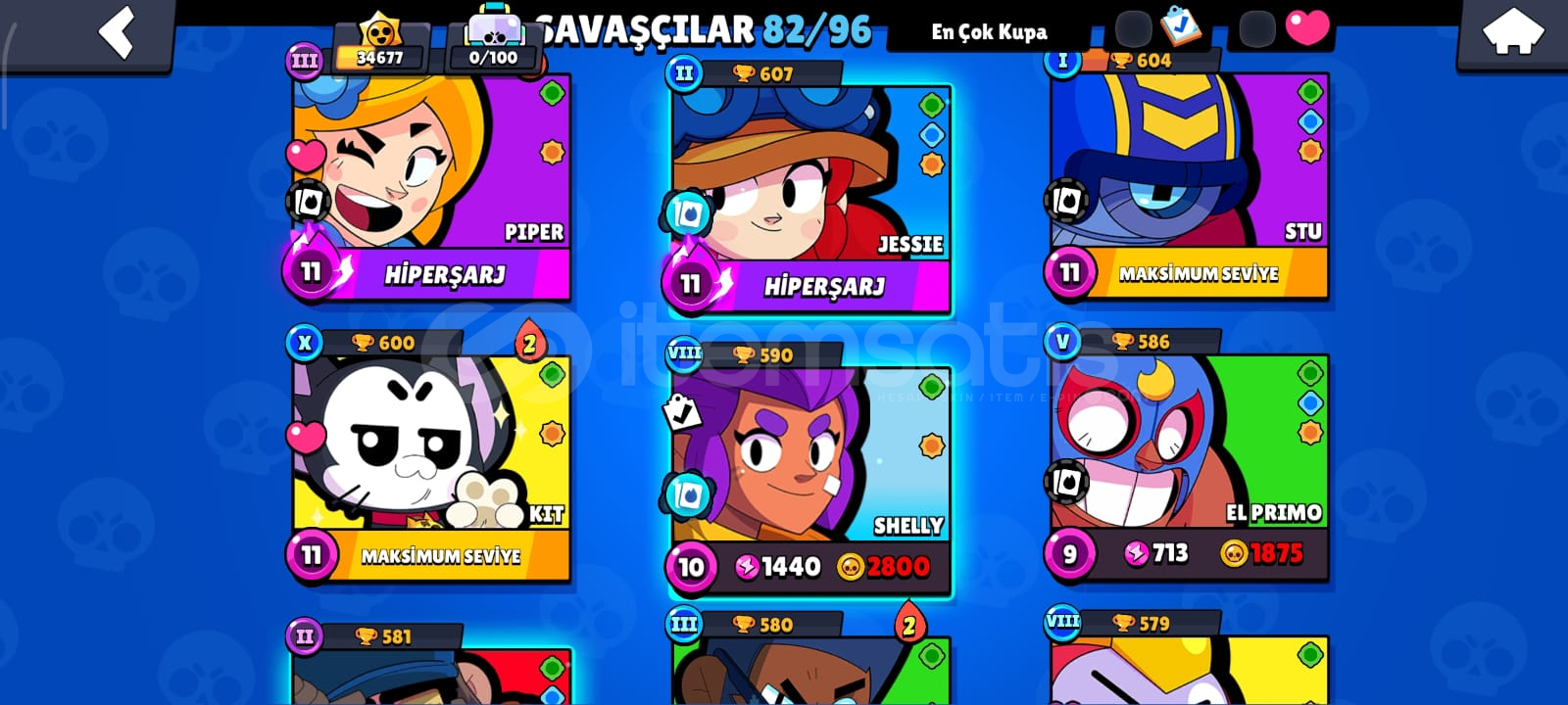 🎮 HESAP ÖZELLİKLERİToplam Kupa: 34686Açık Karakter Sayısı: 82Efsanevi / Gizemli / Destansı / Süper Ender / Ender Karakterler:Efsanevi: (DRACO,KIT,CORDELİUS,SURGE,MEG,LEON,CROW,SPİKE)Gizemli: (JUJU,MOE,CLANCY,LILY,MELODIE,MICO,CHARLIE,CHUCK,DOUG,WILLOW,R-T,GRAY,JANET,EVE,FANG,BUZZ,RUFFS,LOU,SQUEAK,BYRON,SPROUT,MR.P,MAX,GENE,TARA,MORTIS)Destansı: (MEEPLE,SHADE,BERRY,ANGELO,LARRY İLE LAWRIE,PEARL,HANK,MAISIE,MANDY,SAM,LOLA,A...