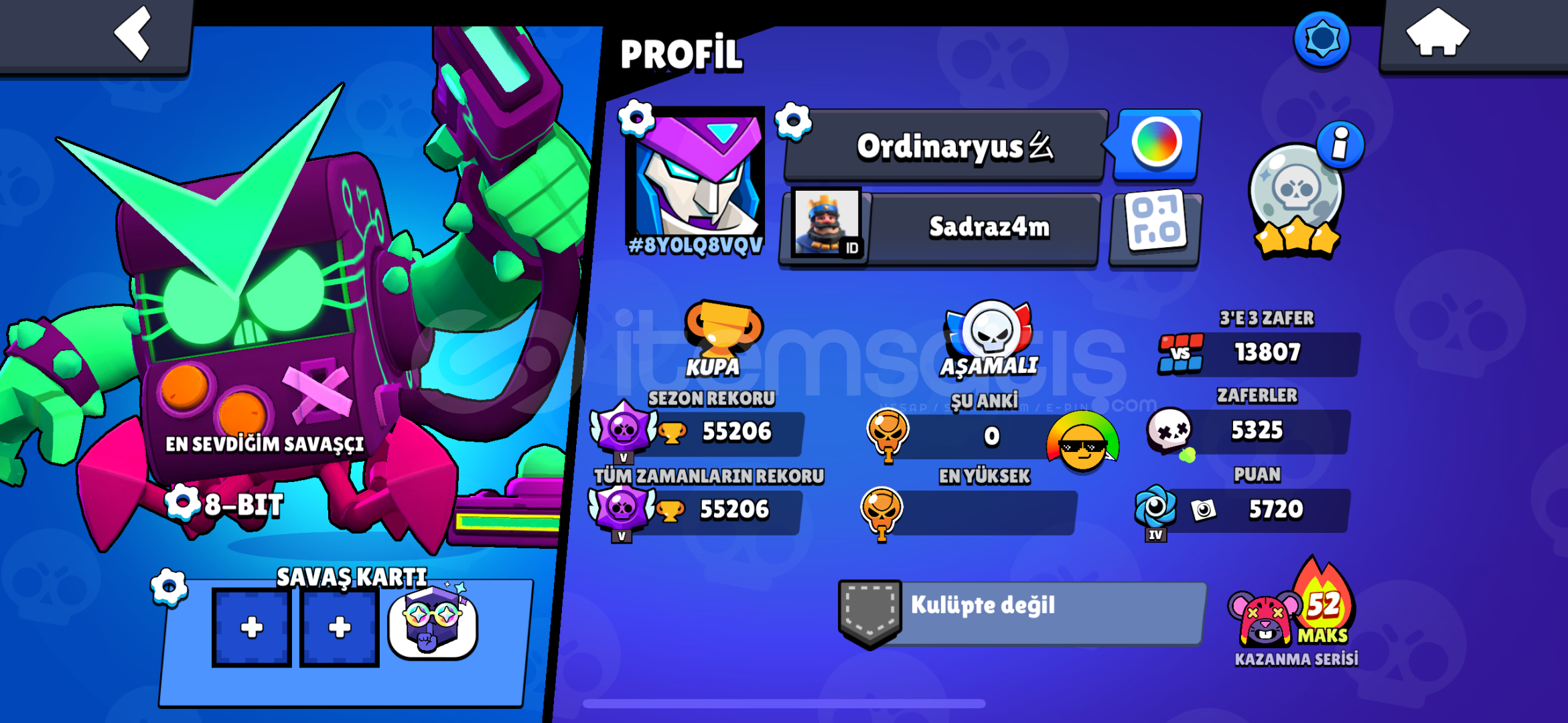 Hesap Uzun Süredir Kasılmamaktadır İçinde 220 Taş 30Bin mücevher ve 45 bin altın bulunmaktadır oynanmadığı için birikti Siz İstediğiniz gibi harcayıp isim değişebilirsiniz 35 Rütbe rozeti vardır 13k 3v3 ve birsürü rozet vardır 190-200 arası skin bulunmaktadır karakterlerin kupaları düşük ama ranklar maks seviye bol skinle kolay kasılabilir oyna...