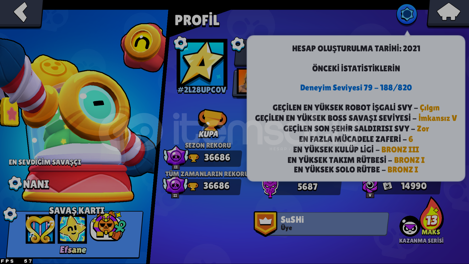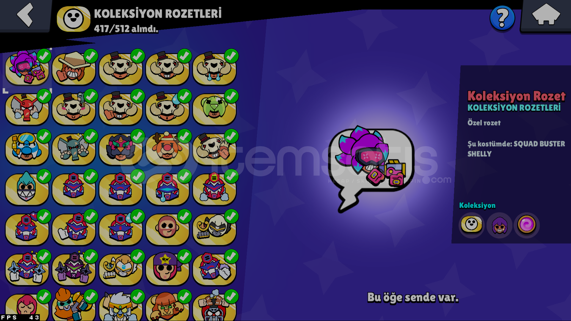 hesapta 125 sıradan 27 ender 8 destansı 417 koleksiyon rozet vardır(koleksiyon rozetler arasında exclusive olanlarıda vardır)