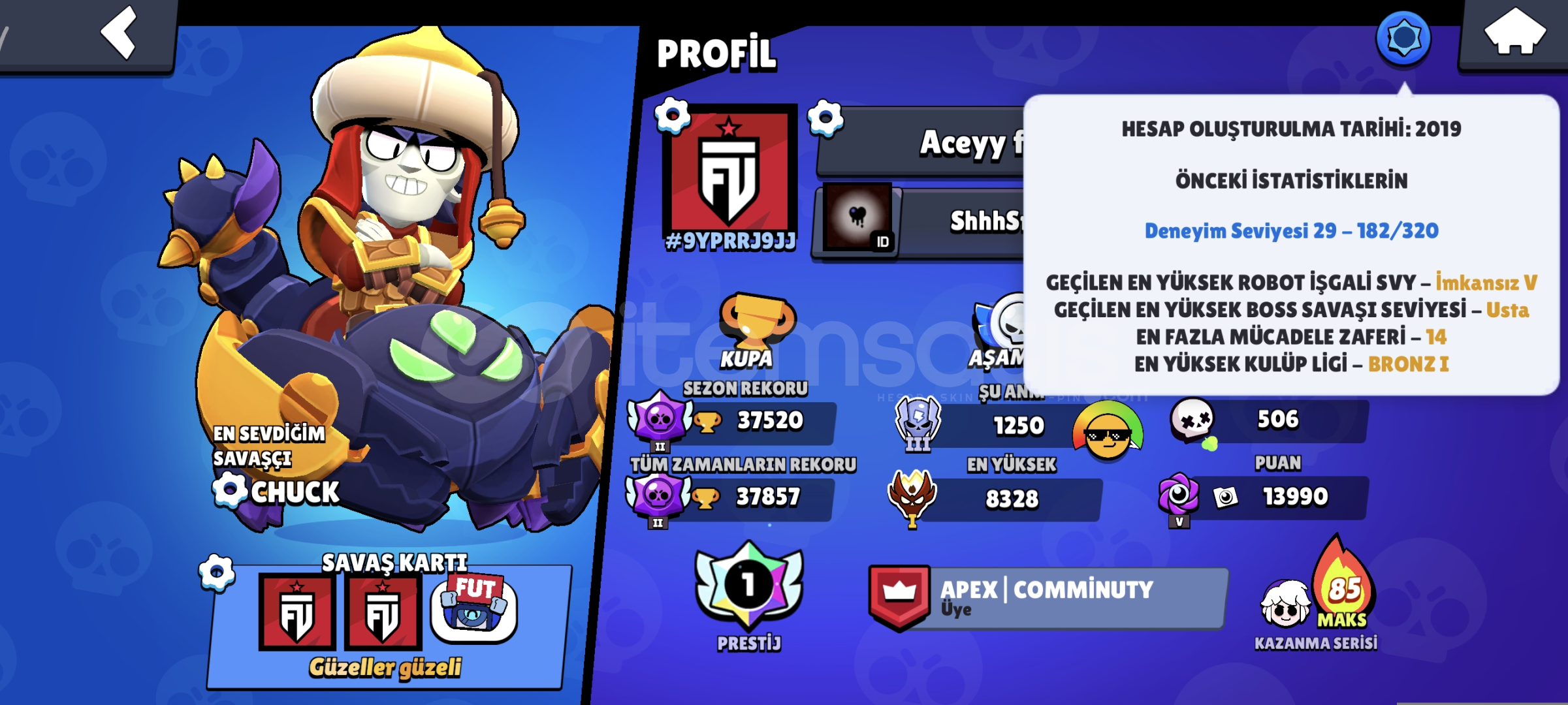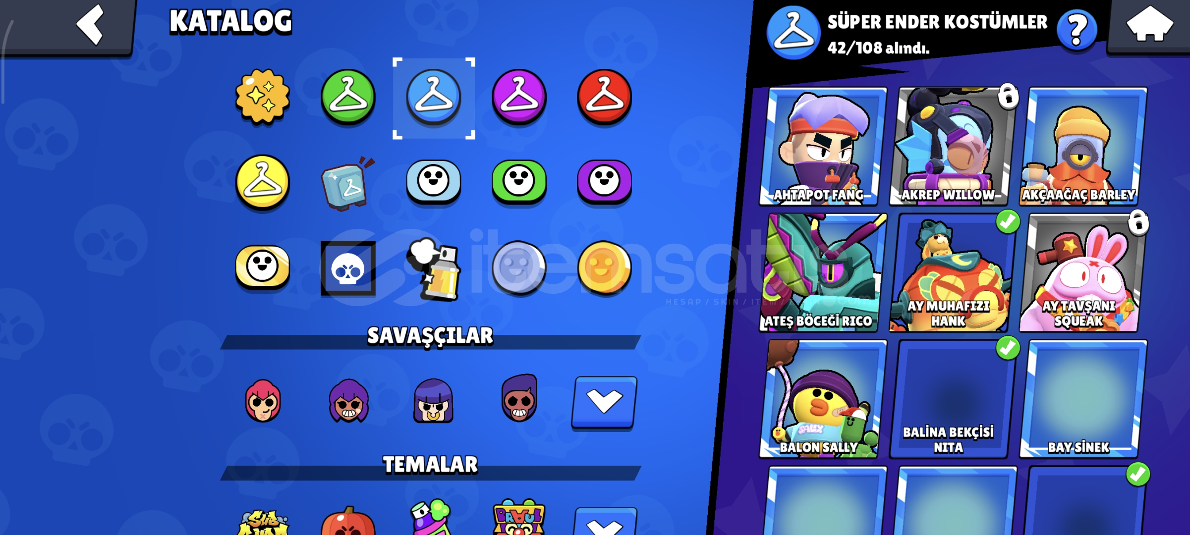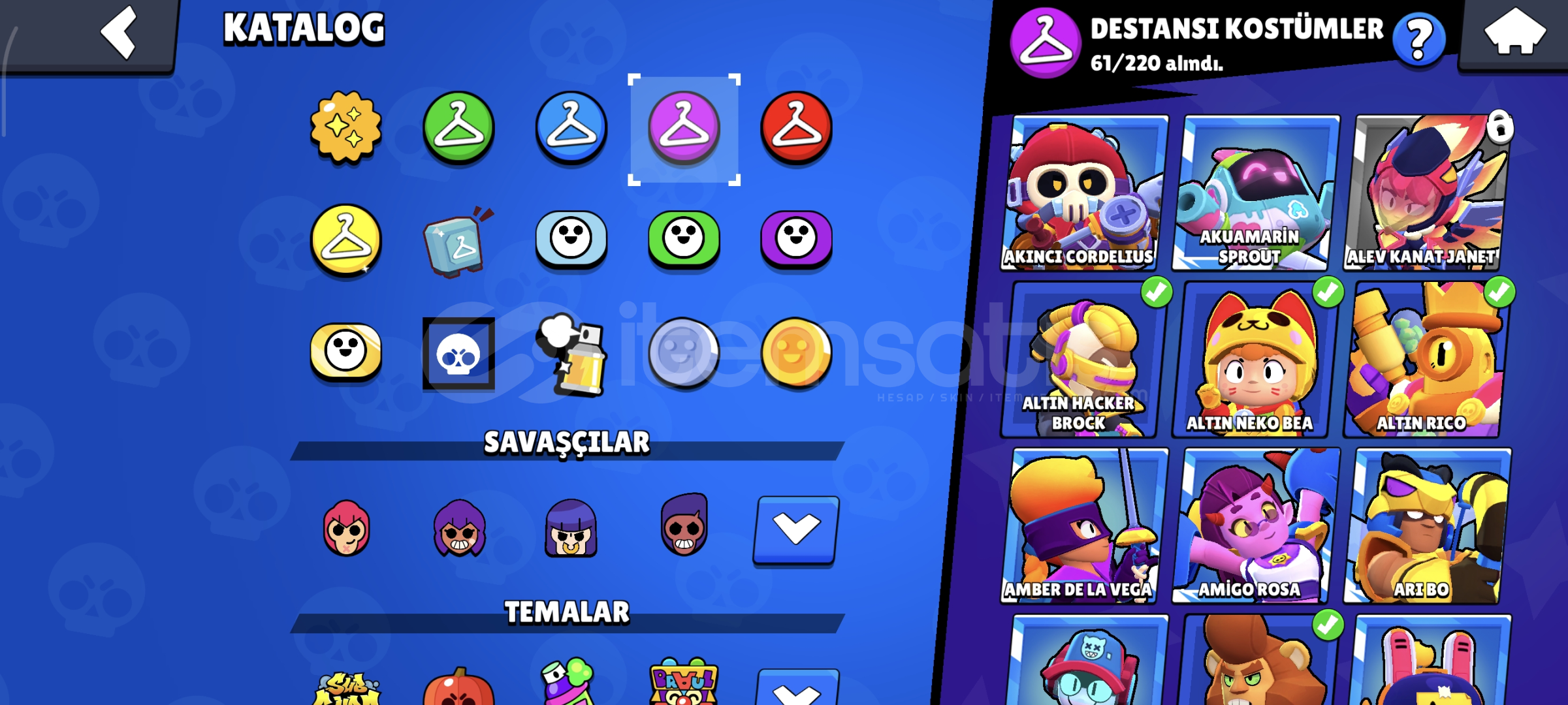 175 kostüm vardır. 74 karakterli Hesap master şuan güncel 552 elmas vardır. 120 elmasa nick değiştiriliyor. hesap koruması gmail değiştirilir. 2019 hesabı 16 tane 11 seviye içinde 13 Tane hipersarj vardır. 308 tane koleksiyon rozet vardır. Oyuncu simgeleri 191 spreyler 108 3 tane bp plus açılmıştır. 8500 kupalık cr hesabıda verilir. 3v3 önem veriyorsanız 5582 arkadaşlı...
