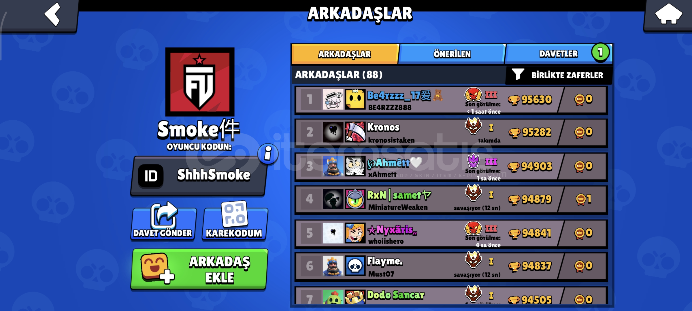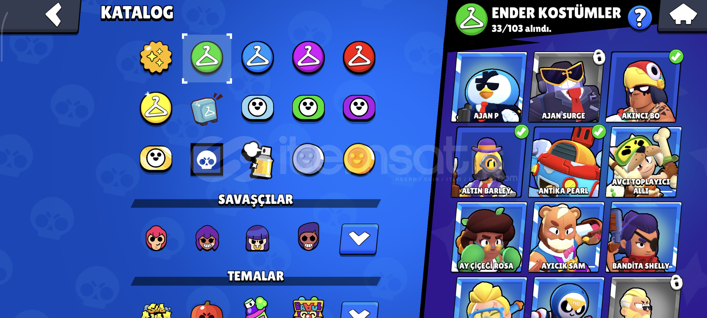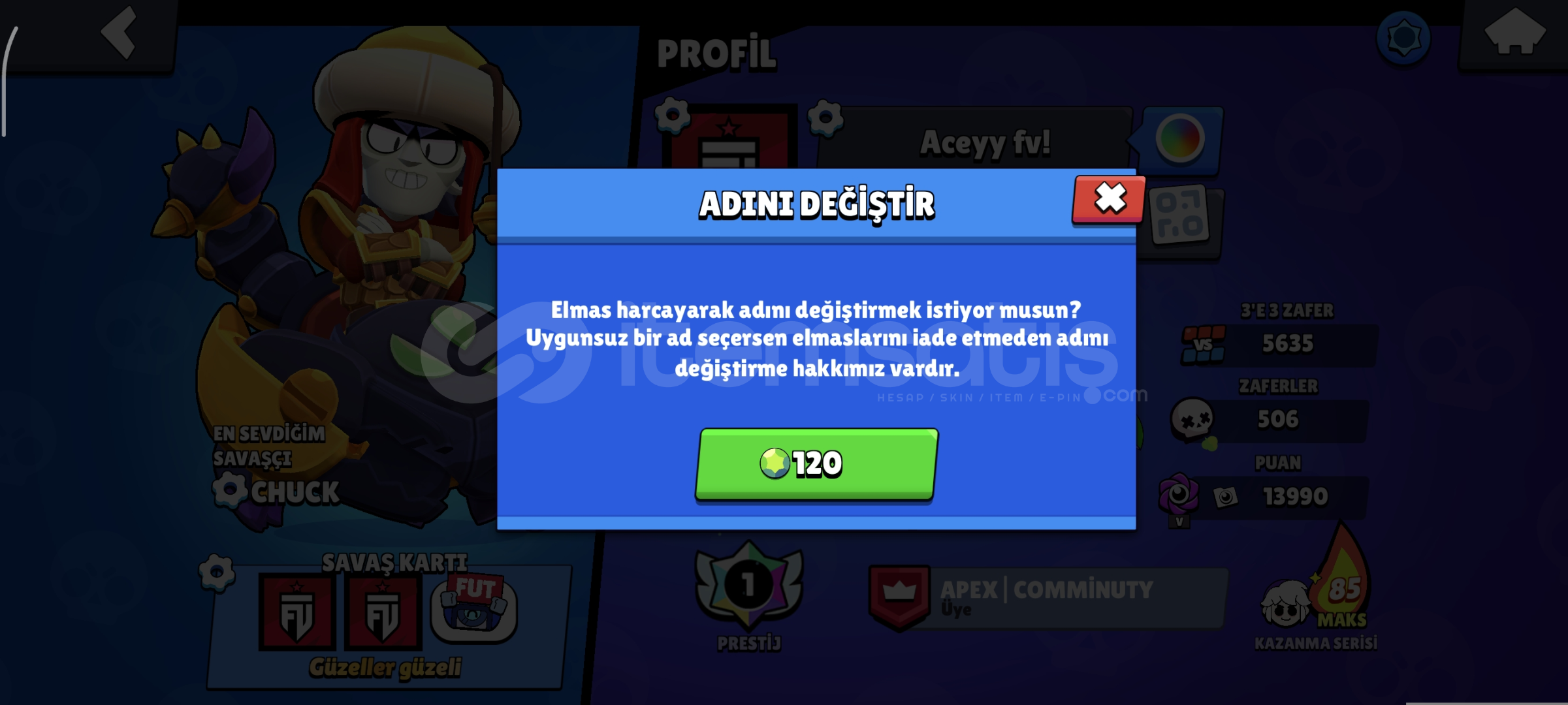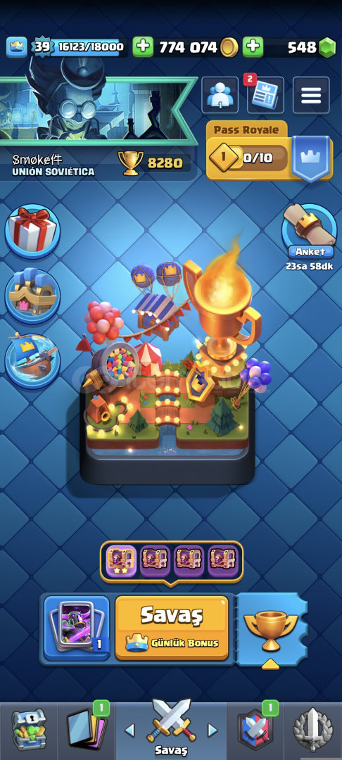 175 kostüm vardır. 74 karakterli Hesap master şuan güncel 552 elmas vardır. 120 elmasa nick değiştiriliyor. hesap koruması gmail değiştirilir. 2019 hesabı 16 tane 11 seviye içinde 13 Tane hipersarj vardır. 308 tane koleksiyon rozet vardır. Oyuncu simgeleri 191 spreyler 108 3 tane bp plus açılmıştır. 8500 kupalık cr hesabıda verilir. 3v3 önem veriyorsanız 5582 arkadaşlı...