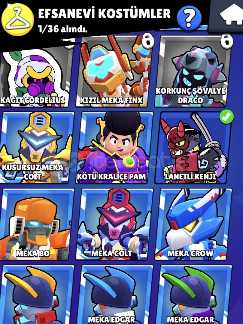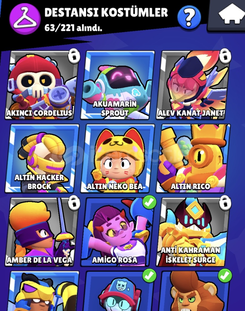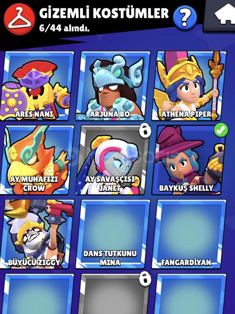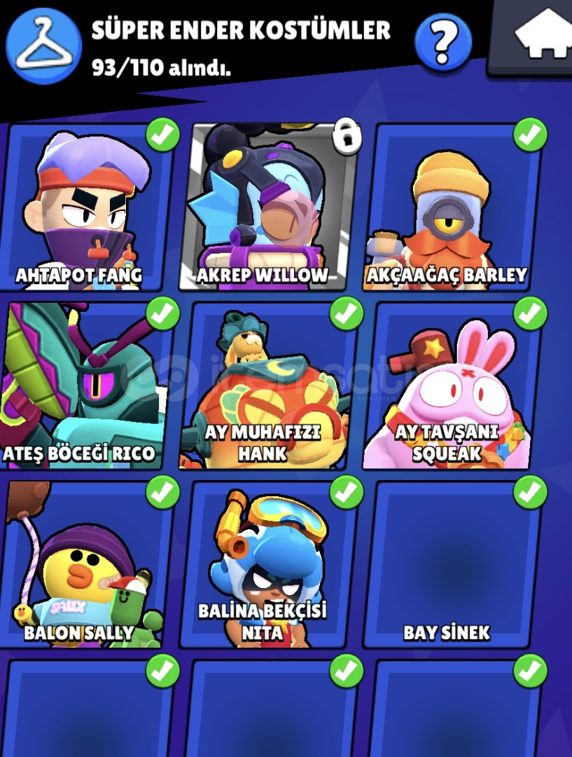 Hesapda1 Brawl pass açılmışdır69 Ender kostüm93 Süper ender kostüm63 Destansı kostüm6 Gizemli kostüm1 Efsanevi kostüm6 Hiperşarjlı kostümolmak üzere toplam 238 kostüm vardır76 altı karakter vardır16 tane hiperşarjı açık karakter vardır21 tane 11 seviye karakter varHesap satın alındıkdan sonra sorumluluk alıcıya aitdirMouse satın almaya &cc...