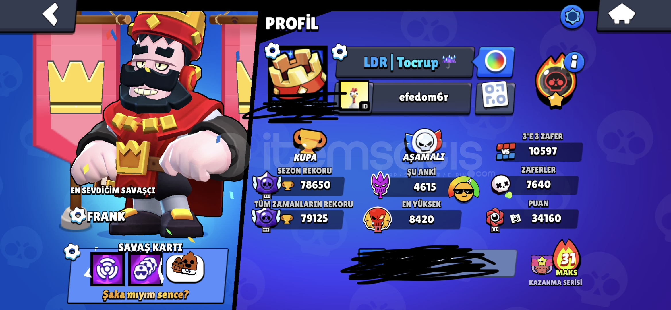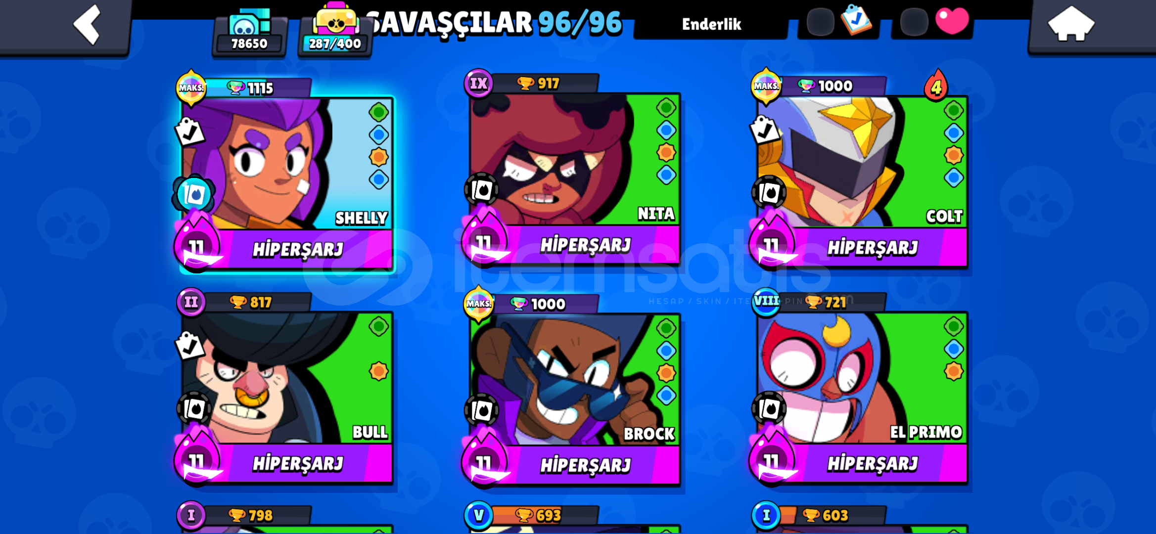 -Hesap Nerdeyse 80K Kupadır -Hesapta 96 Karakter Mevcut -Bunlardan 83 Tanesi Max Yalnızca 13 Tanesi Max Değildir -2 Sezon Pro Pas Alınmıştır ve Fullenmiştir -Bir Çok Kez de Brawl Pas Plus Alınmıştır -Hesapta Toplam 24 Unvan Bulunmaktadır -Şuanki Brawl Pas Plus Açıktır -Göktaşı 1 Şöhretindedir -204 Günlük Giriş Serisi Vardır...