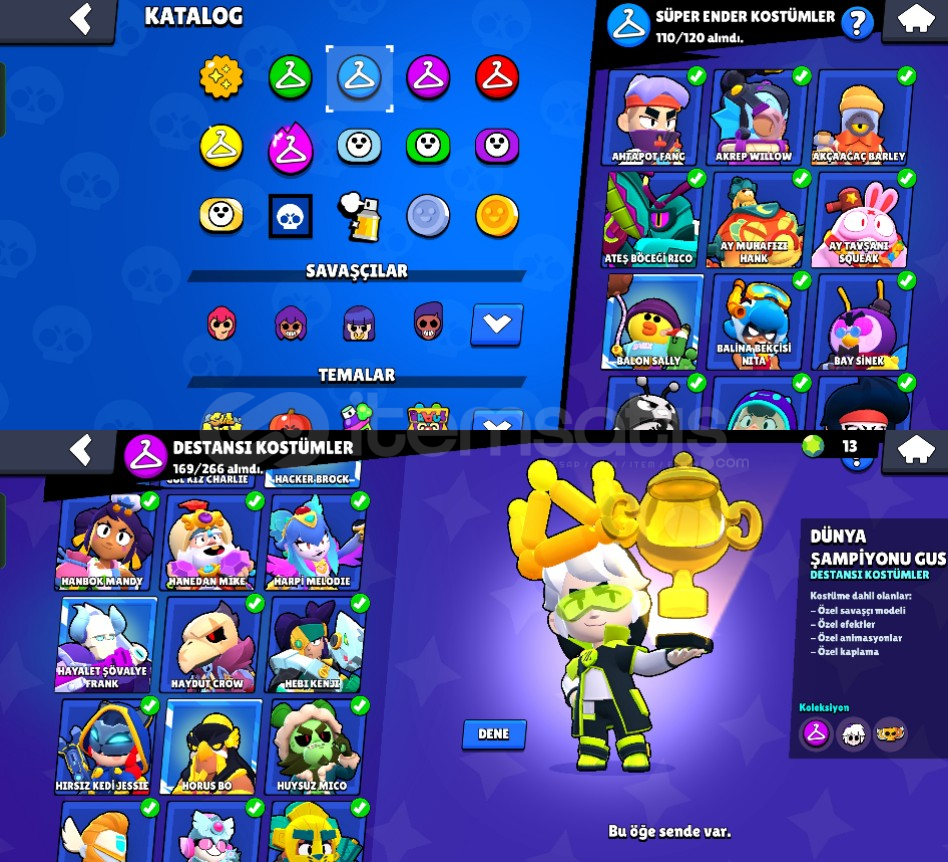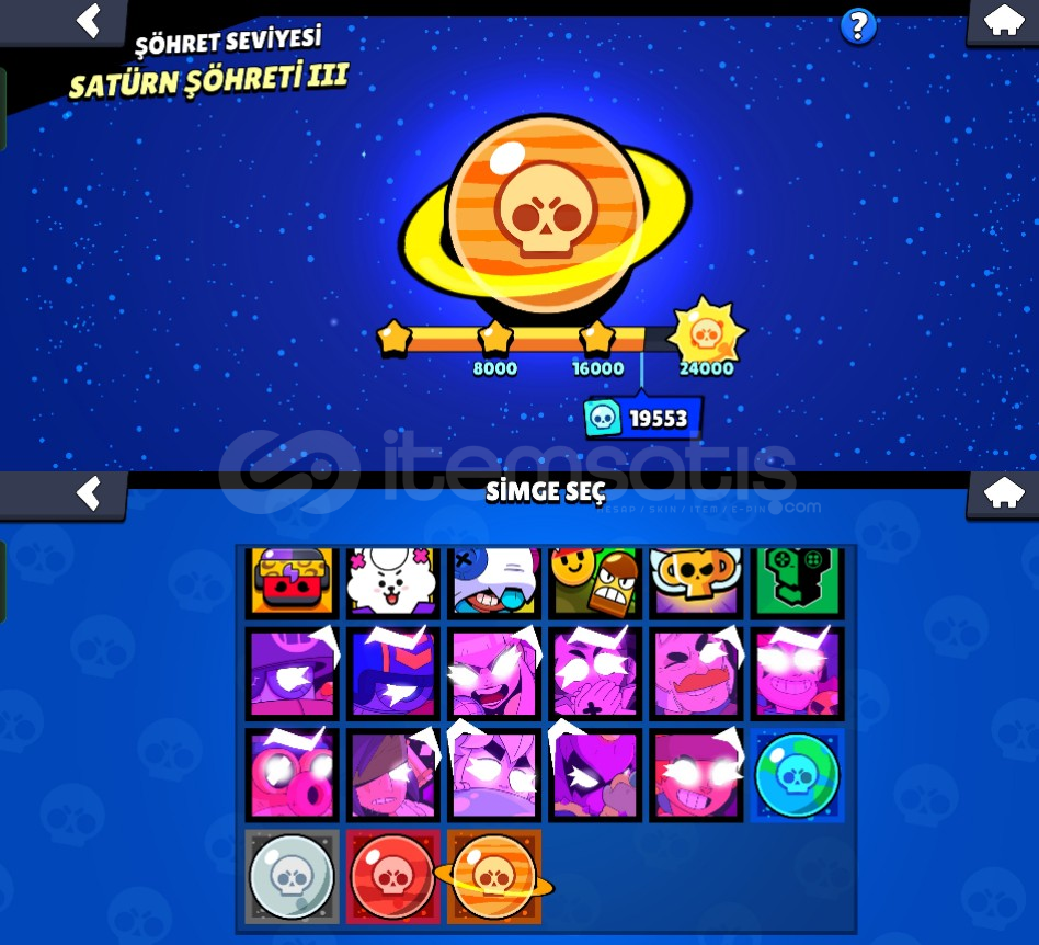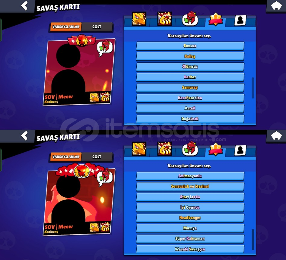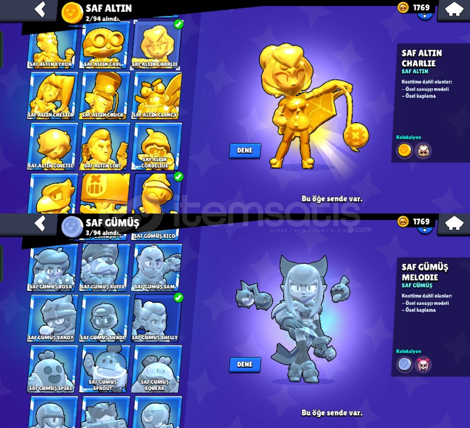 İsim değiştirme 60 elmas istemektedir.Hesapta 58 tane 11 seviye karakter vardır ve bunların 54 tanesinde hiperşarj vardır.11 hiperşarj paketi alınmıştır.(1639 elmas)Colt pro pass alınmıştır.(1000₺)Toplam 29 ünvan vardır bunların 12 tanesi pâss plus ünvanıdır.(2400₺)Spike matcherino pin vardır.(350₺)Aynı supercell idye bağlı 8177 kupa ...