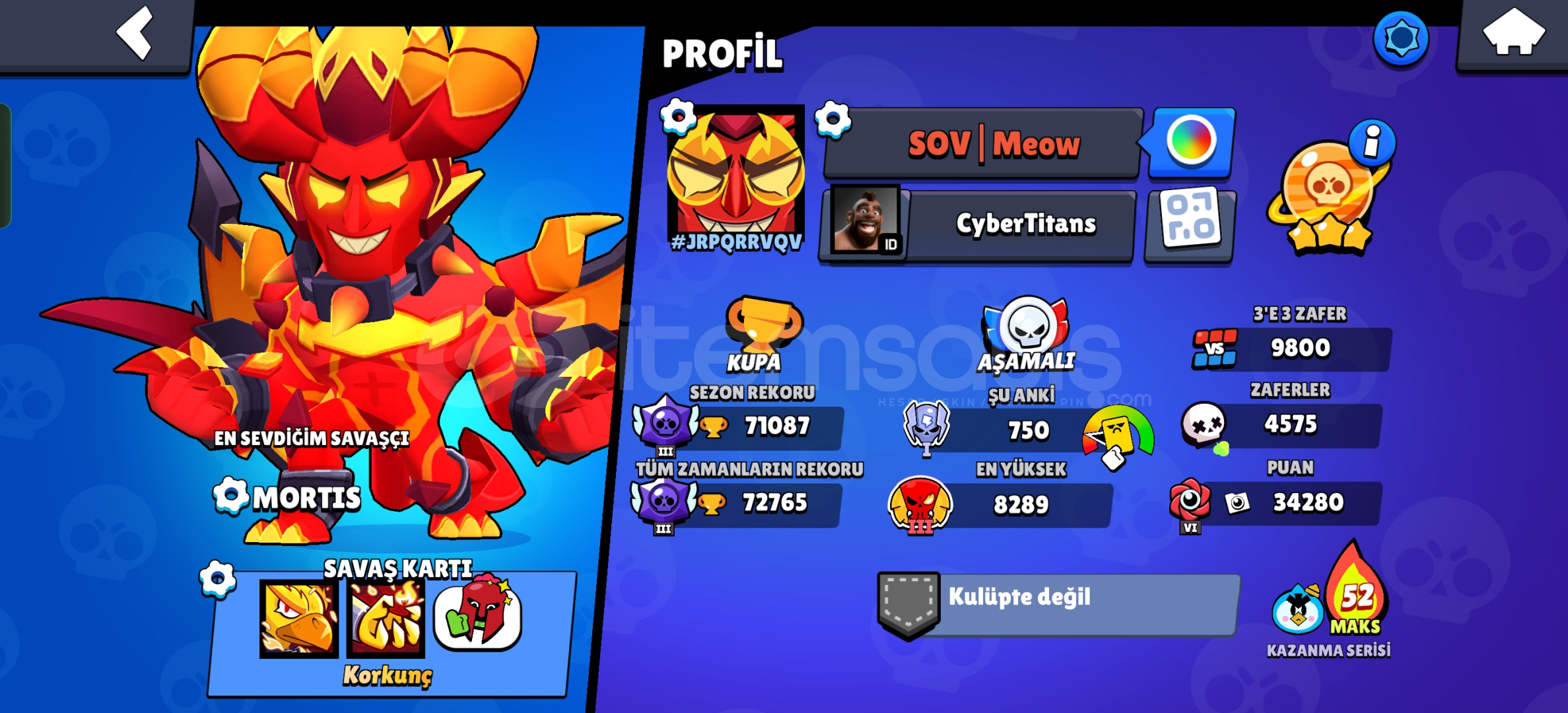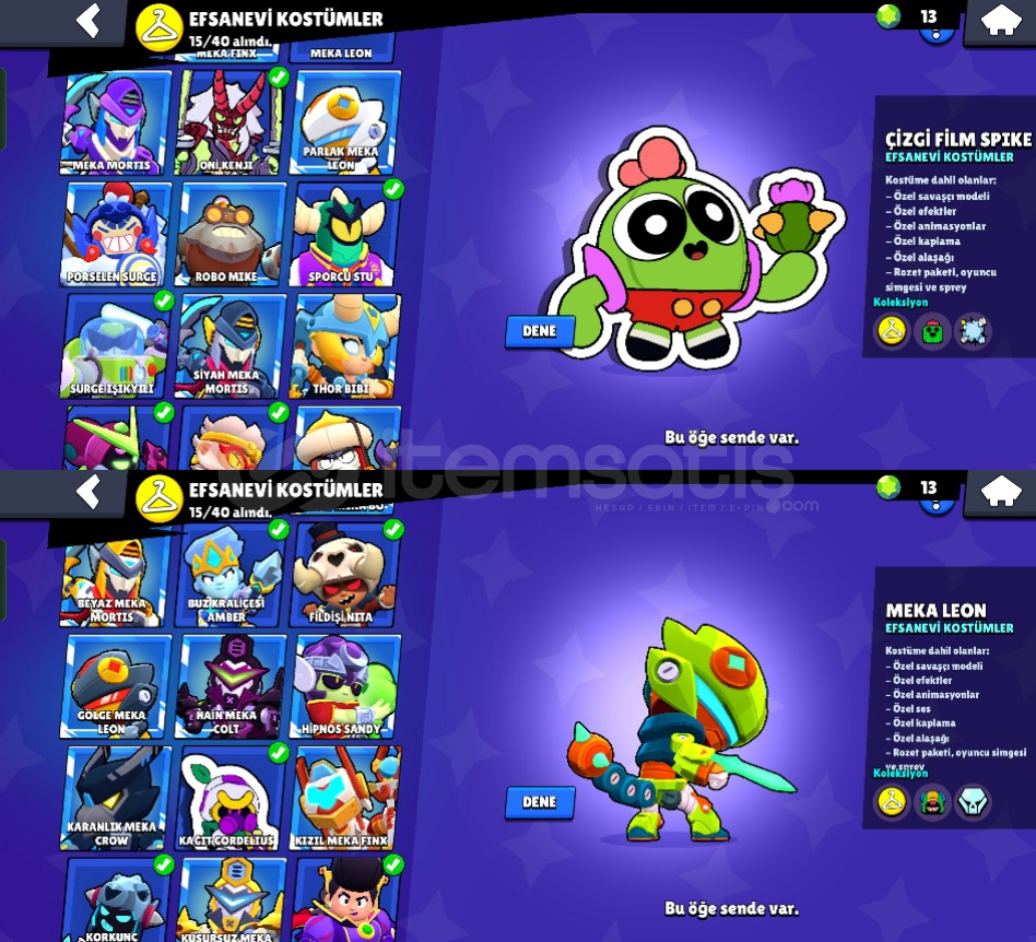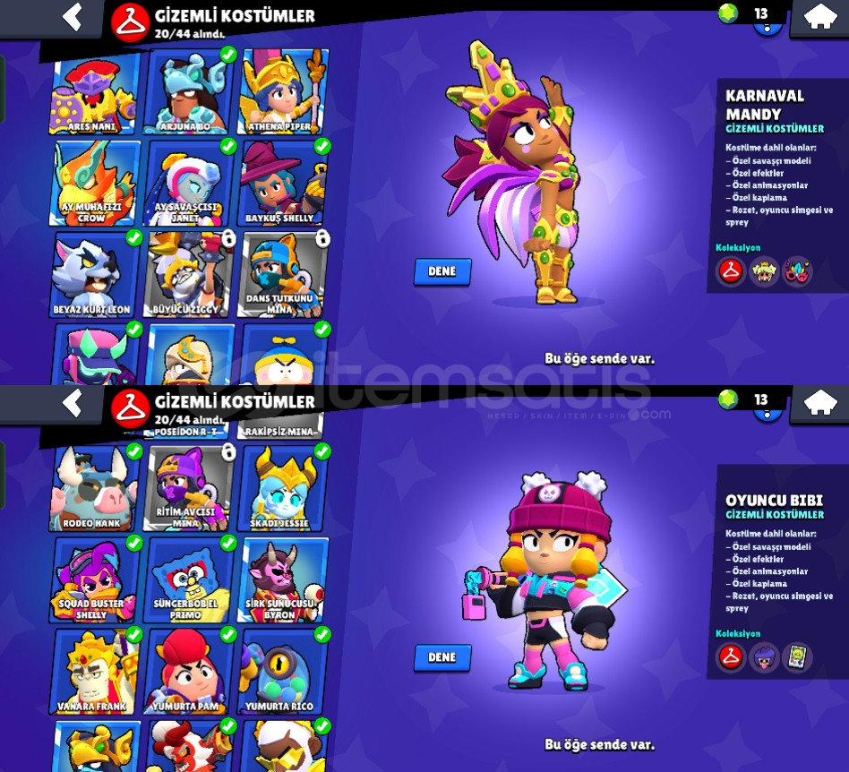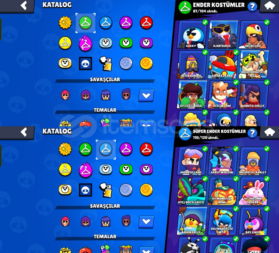 İsim değiştirme 60 elmas istemektedir.Hesapta 58 tane 11 seviye karakter vardır ve bunların 54 tanesinde hiperşarj vardır.11 hiperşarj paketi alınmıştır.(1639 elmas)Colt pro pass alınmıştır.(1000₺)Toplam 29 ünvan vardır bunların 12 tanesi pâss plus ünvanıdır.(2400₺)Spike matcherino pin vardır.(350₺)Aynı supercell idye bağlı 8177 kupa ...