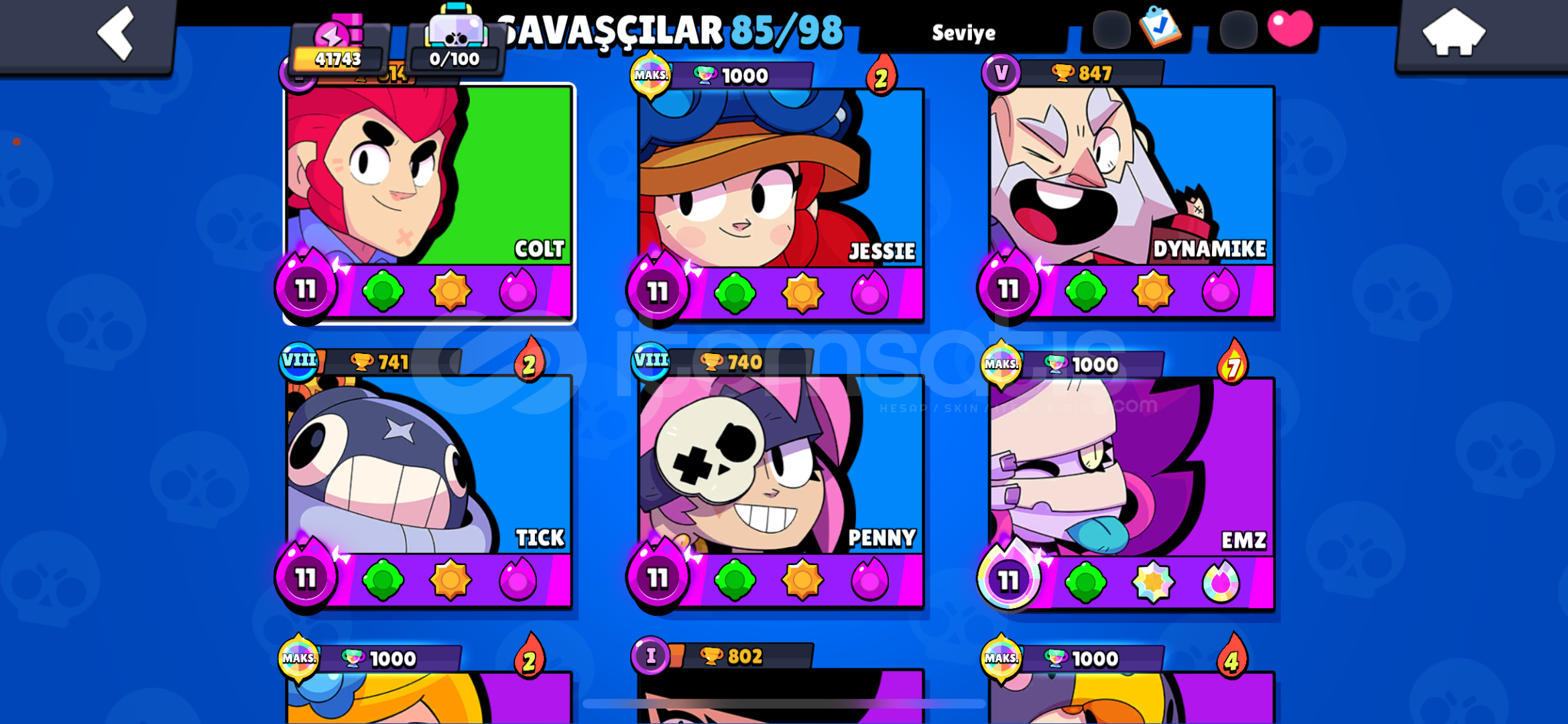 3 adet hipersarj kostüm 5 adet efsanevi kostüm 3 adet gizemli kostüm 80 adet destansı kostüm78 süper ender 84 ender efsanevi karakterler full kaze mevcut 3 kez 3 kez plus acıldı 25000 altın 20000 mucevher 46 elmasdirekt teslim degerli kostumler var piper lola gibi karakterlerin neredeyse ful kostumu altın piper var 21 adet 11 seviye hipersarj karakter