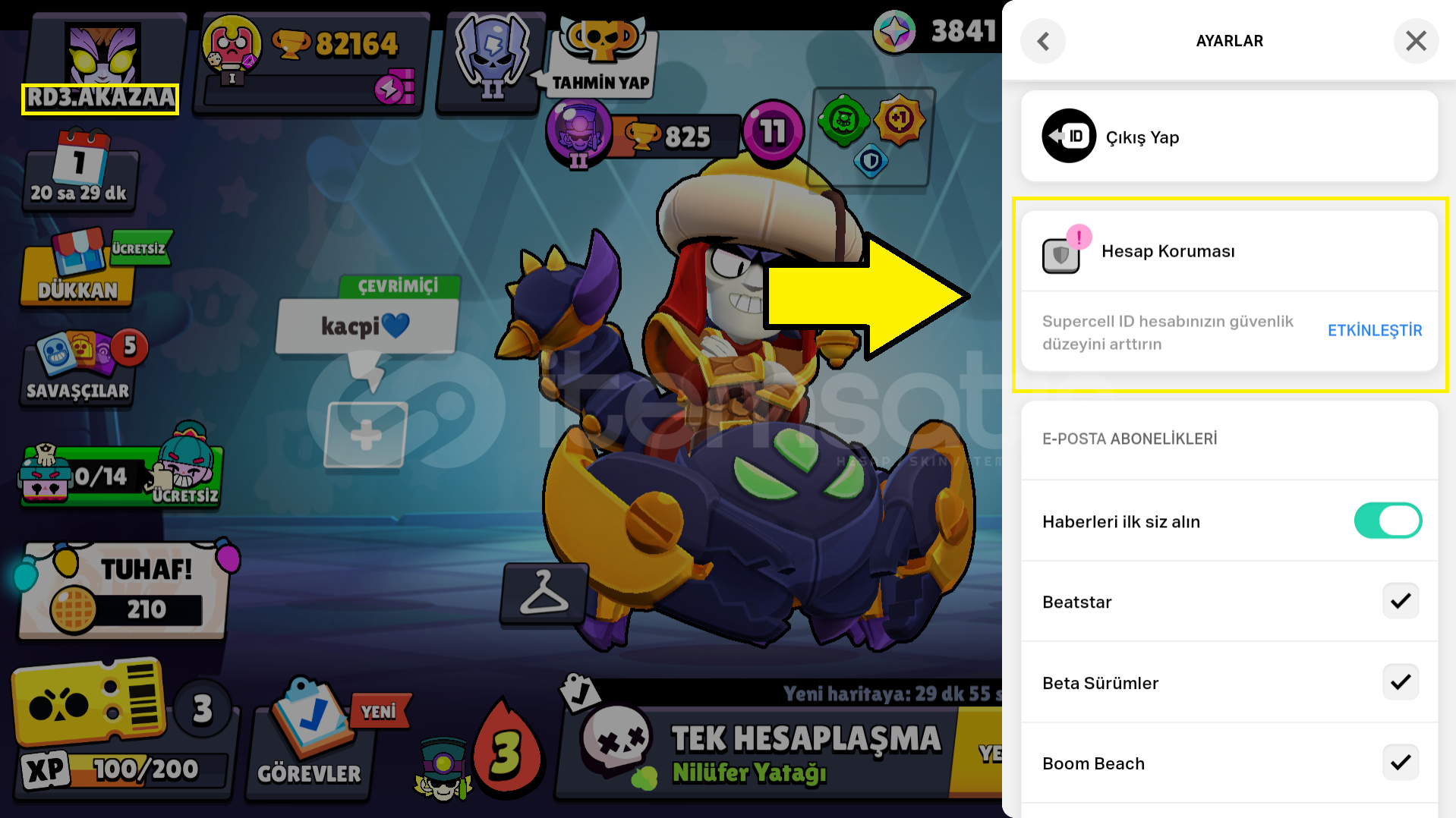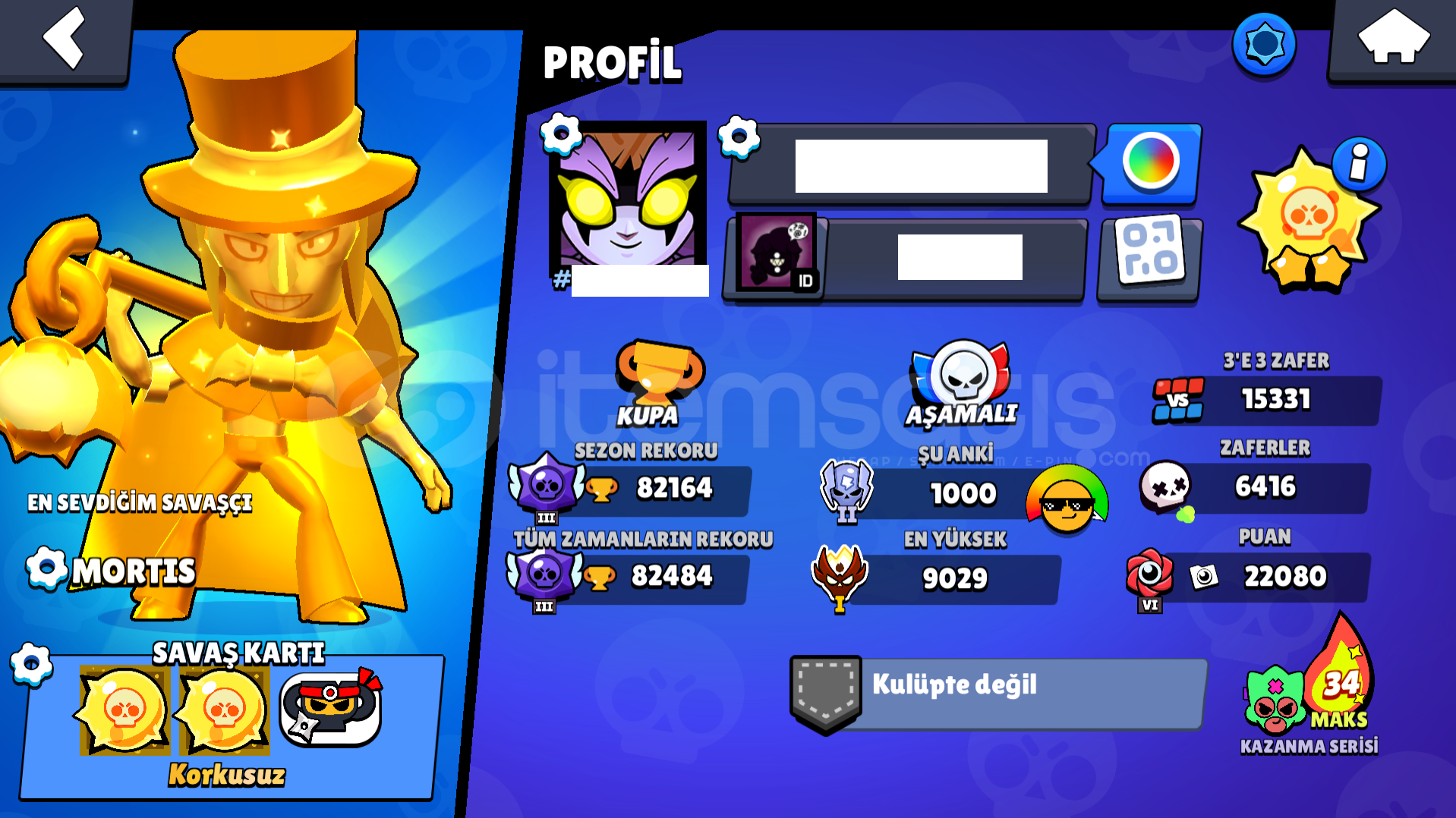Genel Bilgiler 📝Hesap ilk sahibinden satıştadır; al-sat hesabı değildir. Kendi emeklerimle kasılmıştır. Hesap koruması daha önceden hiç eklenmemiştir; Hesaba ilk eklenebilecek telefon numarası yeni sahibinin olacaktır.Deneyim seviyesi: 223Kupa: 82.164En Yüksek Aşamalı: 9.029 (Master)3v3 Zafer: 15.331Mücadele Zaferi: 15/15Kayıt Seviyesi: 22.080&#...