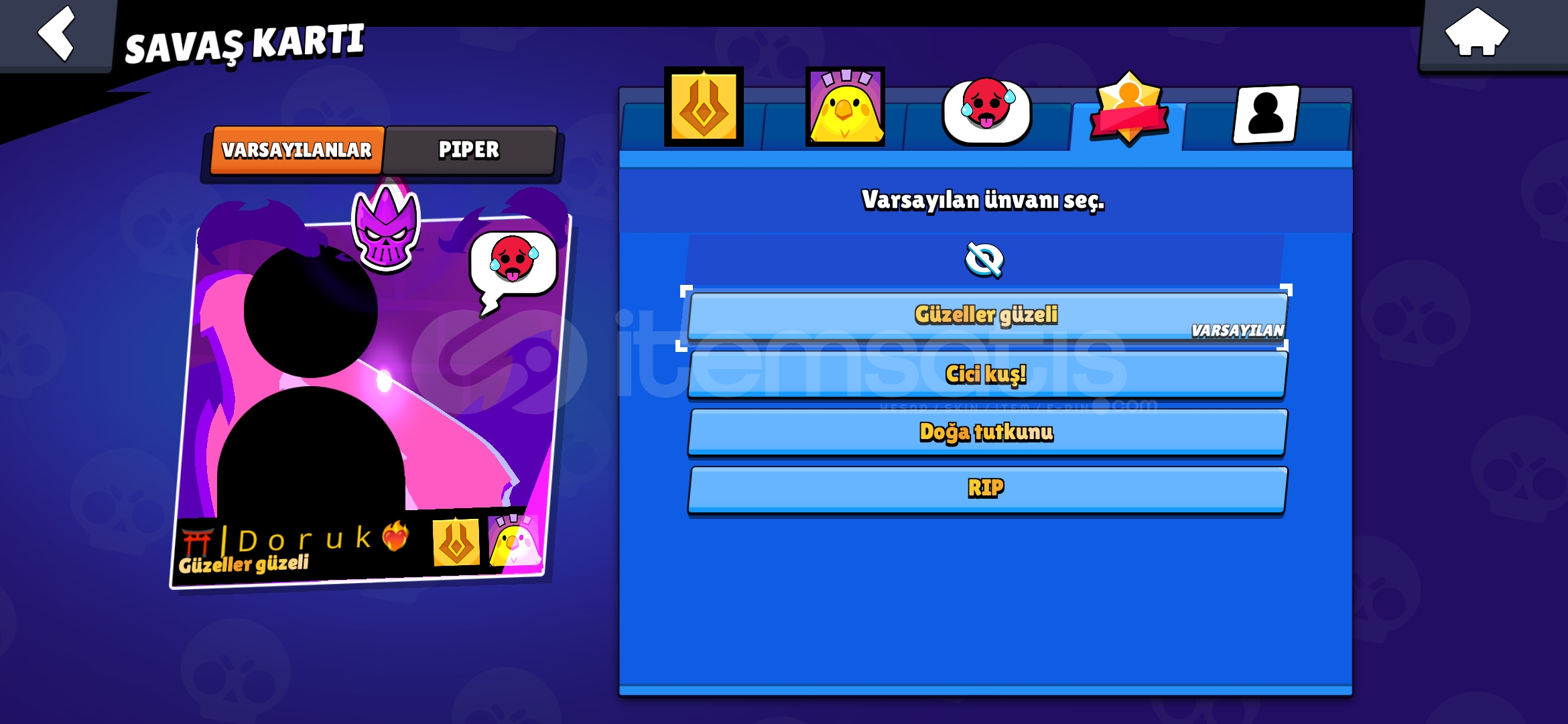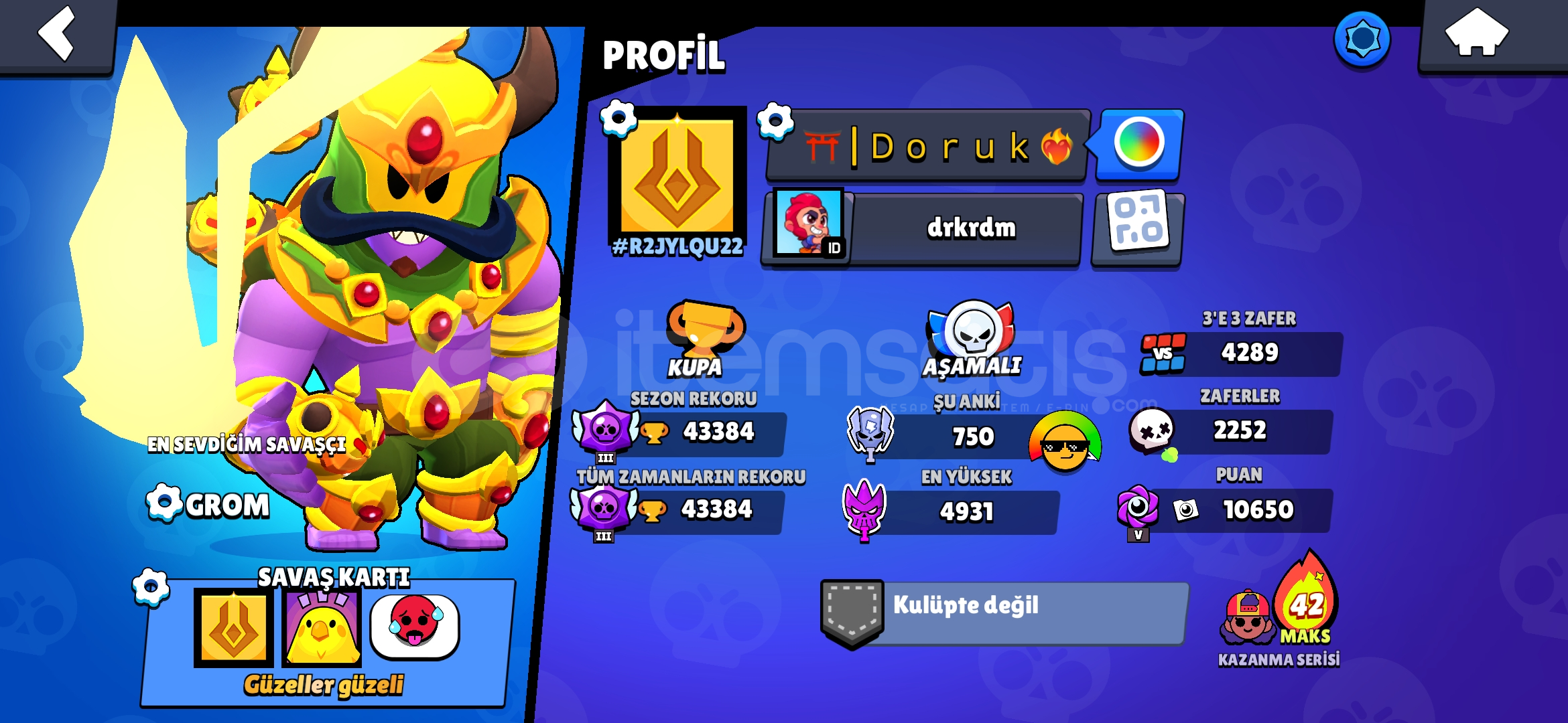43bin kupada 3 tane gizemli 2 efsanevi 1 tanede hipersarj skinli 3 tanede ünvanı olan hesap+suan 60 elmas var(arkadaslar heabın yeni olduğuna ve ismin rasgele olduğuna bakmayın daha yeniyim buralarda ilk defa hesabı satmak için olusturdum dolandırıcı fln değilim item satıstan baska bisey alcam bayadır oynamadığım için satıyom)