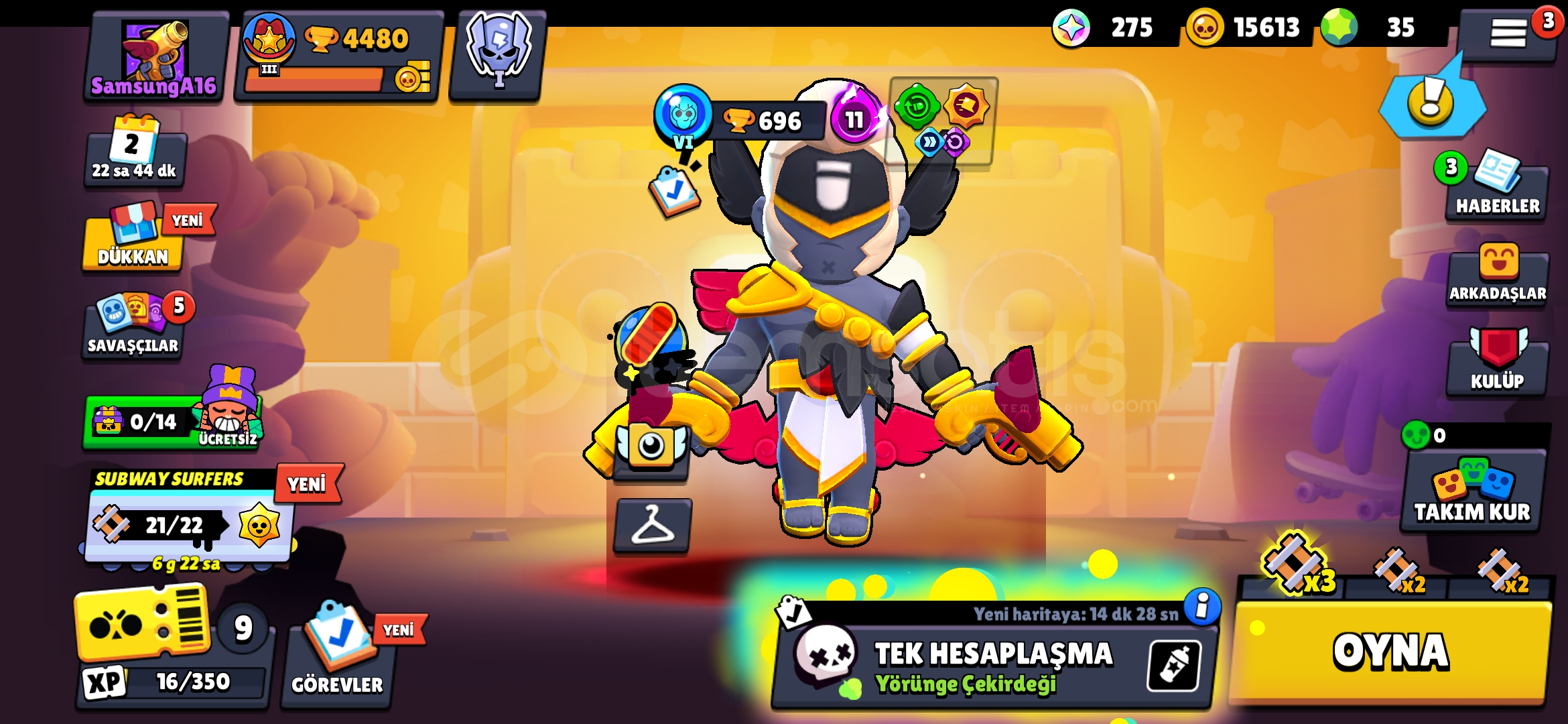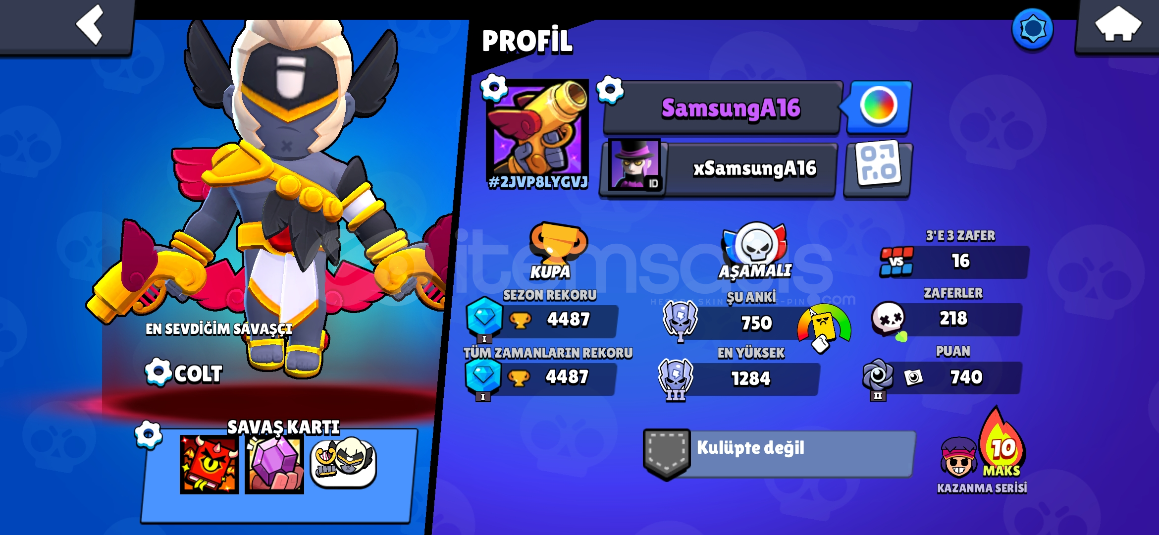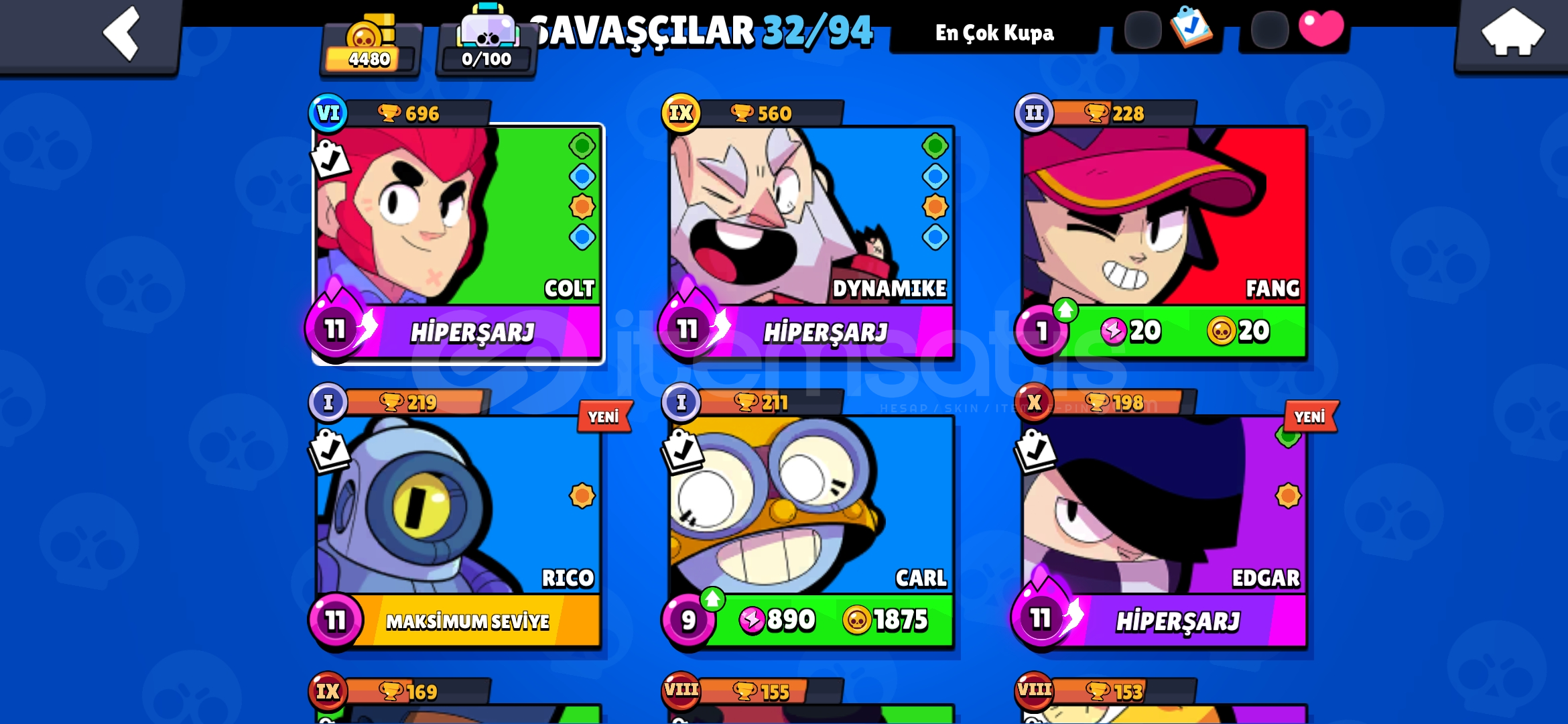 ●4487 kupa🏆●32 karakter✨️●35 elmas🟢●15613 altın🟡●275 mücevher🟣●Hesapta bulunan kostümler:●kara melek colt ●yakışıklı colt ●ahtapot fang ●ikinci kaptan fang ●hanedan mike ●ateş böceği rico ●kırmızı ceketli rico ●sultan carl ●goblin carl ●hızlı silahşor edgar ●kara melek ed...