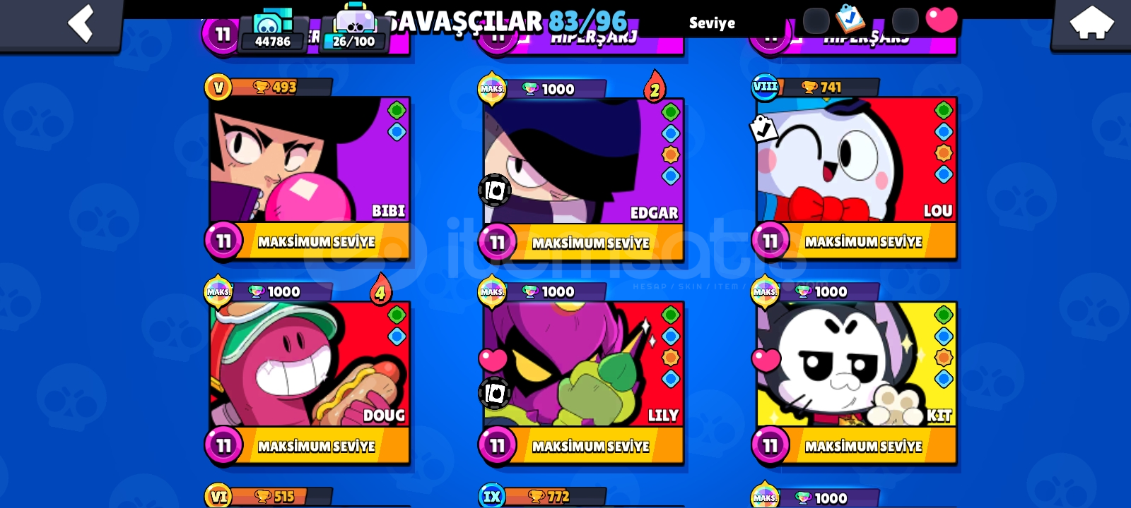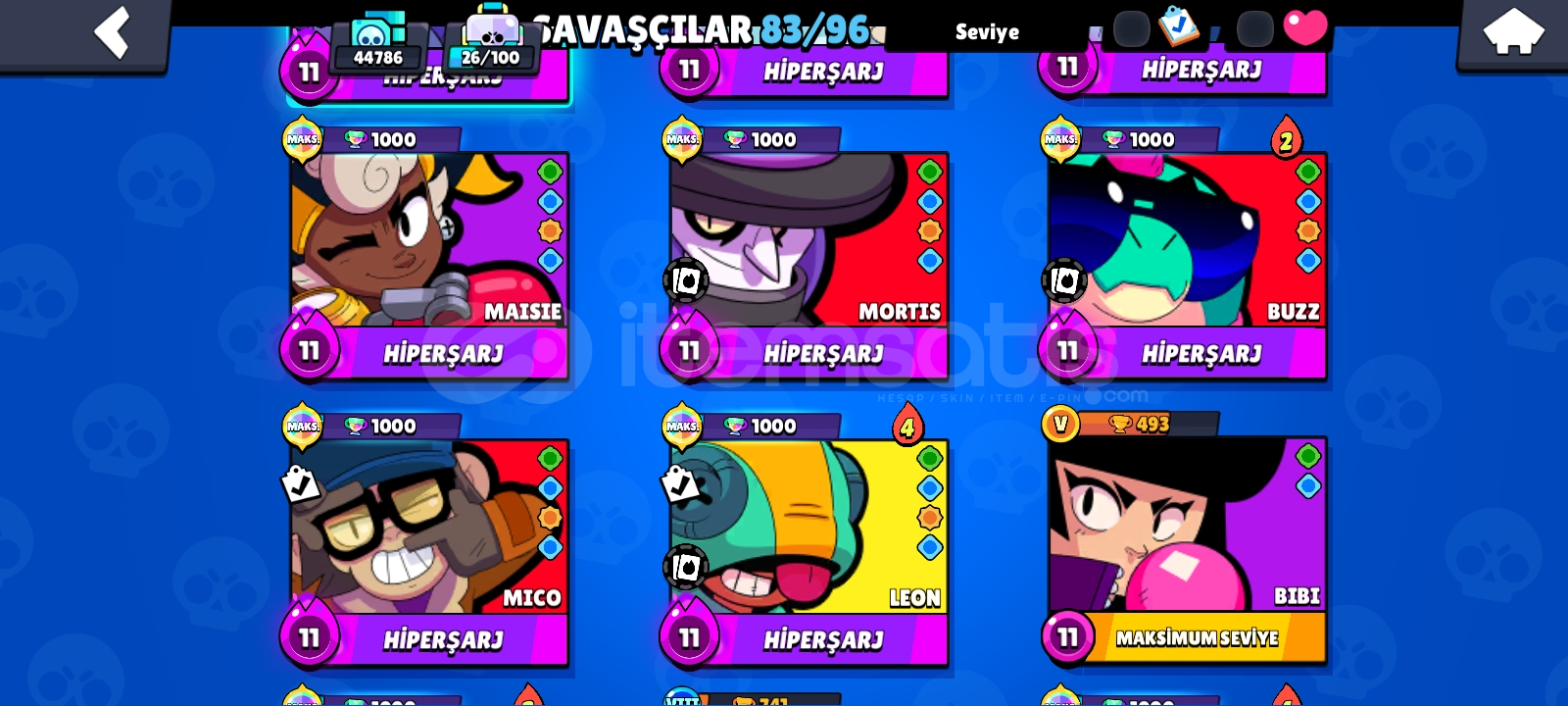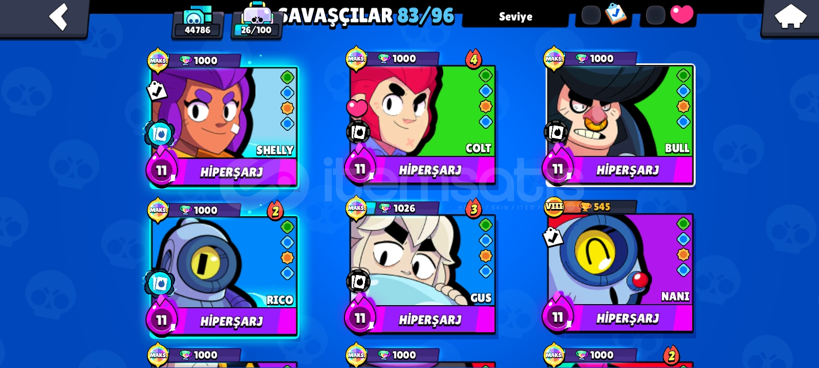45 BİN KUPA⚡8 ÖZEL ÜNVAN BULUNUYOR 83 KARAKTER MEVCUT⚡18 MAX 12 HİPERŞARJ KARAKTER 63 ELMAS VE 5000 MÜCEVHER VAR⚡