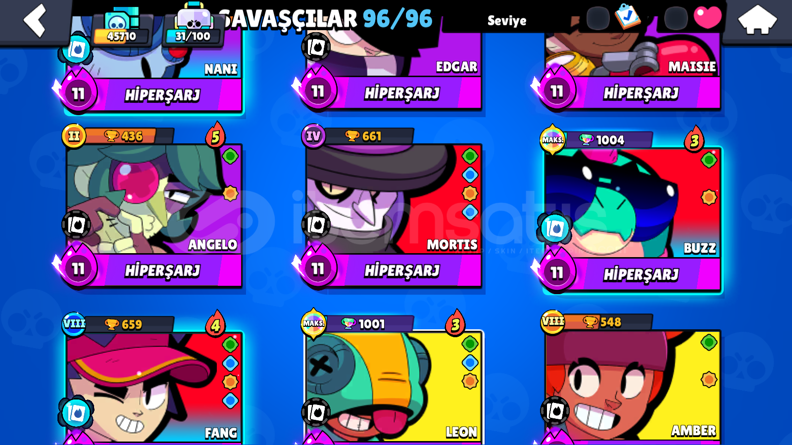 Hesap ID: #2VYURCP13 Hiperşarjlı, Toplam 17 Maksimum Seviye72 Ender Skin66 Süper Ender Skin54 Destansı Skin6 Gizemli Skin1 Efsanevi Skin2 Hiperşarj SkinMail ve şifre olarak teslim edilecektir. Aldıktan sonra şifreyi değişiniz.Hesapta sizden başka kimse bulunmaz, bulunamaz. Otomatik teslimattır. Soru sormadan direkt alabilirsiniz.