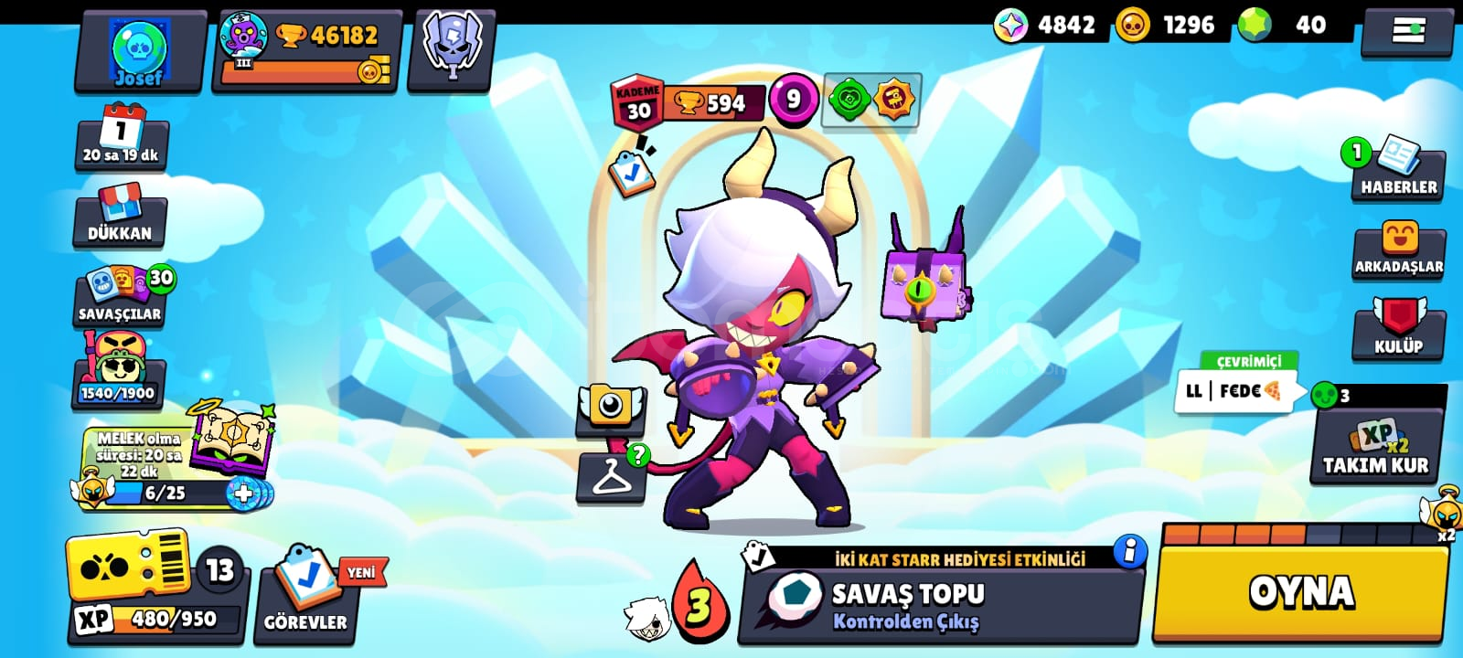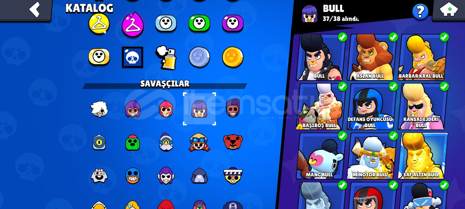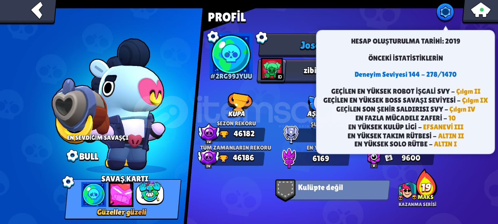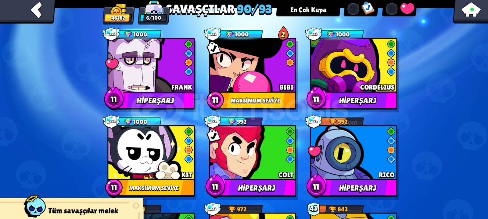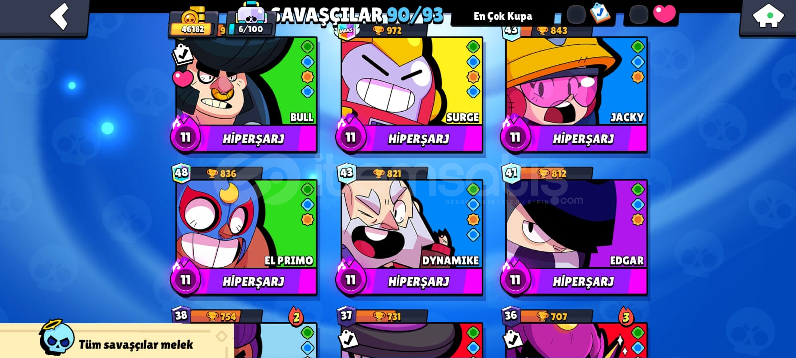 46182 kupa33 hiper toplam19 tane kullanılabilir hiperşarj23 tane max karakter 8 tane 1k karakter 10 tane brawl pa ss (1 tanesi eski collet pa ssi) 4 efsanevi skin3 gizemli skin1 tane hiper skin 49 süper ender 62 ender skin 1 gümüş skin348/433 tane koleksiyon rozetiay şöhreti90/93 karakter kayıt seviyesi 5. lvl4 karakter ünvanı 9 tane pass ünvanı254/571 oyuncu simgesisurge hiper teklifi satın al...