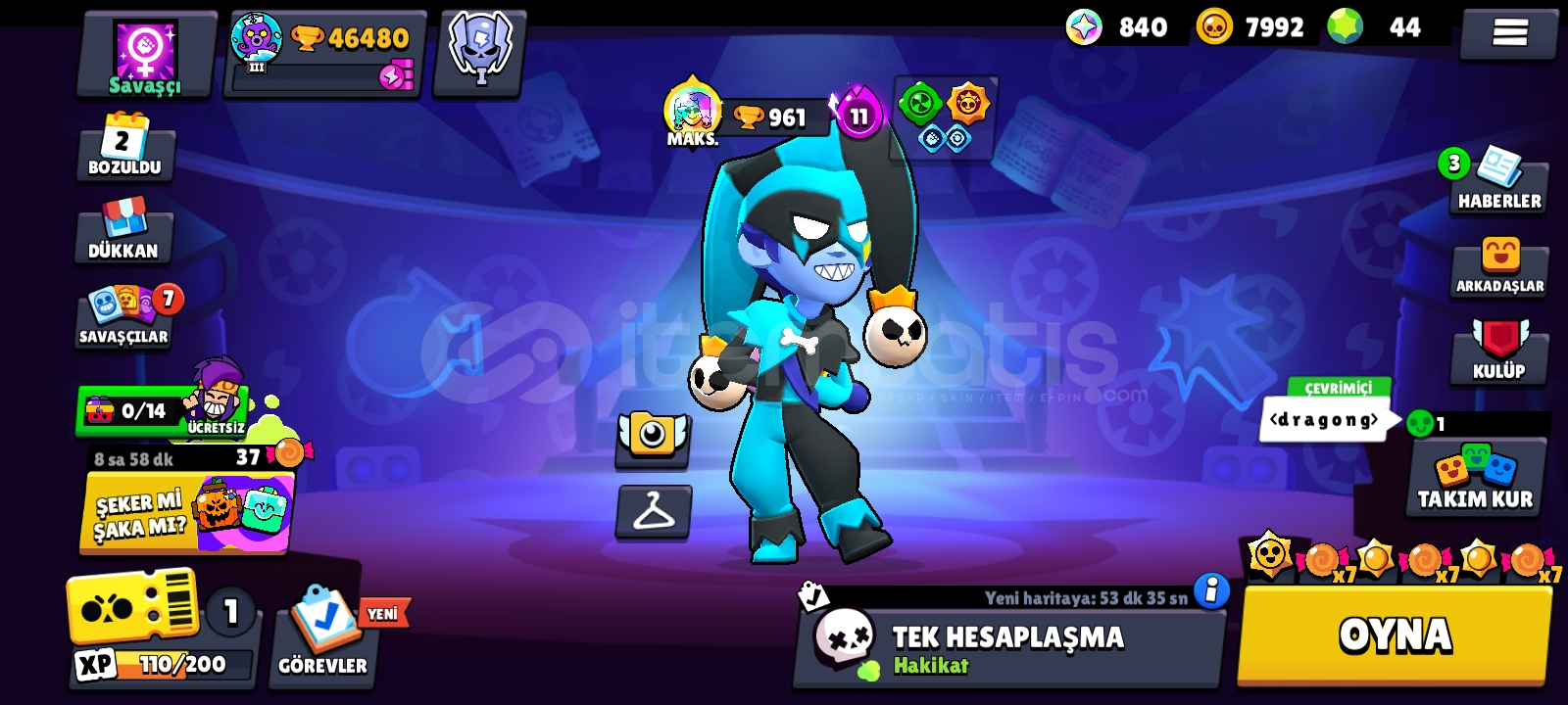 46k kupalı 30 dan fazla 11 level karakter 15 den fazlası hiperli bol kostümlü 2 adet brawl passlı 5 yıllık temiz he...
