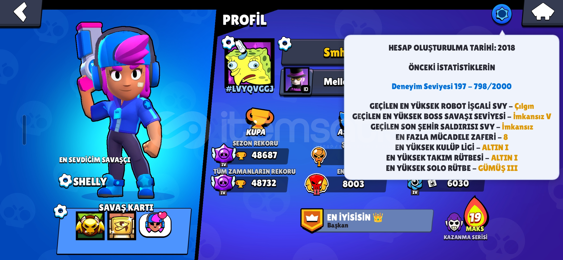 90 karakterli 48.732 kupalı 2018 hesabı oyunun en nadir kostümü olan yıldız shely li hesap(fotoğraflardaki shely)2 hiperşarj, 1 efsanevi, 2 gizemli kostüm ve çoğu karakterde kostüm bulunuyor. 100 lerce pin(emoji) bulunur. 25 kişilik kulüp başkanı (üye sayısı değişebilir). Alıcısına hayırlı olsun. GÜVENİLİRLİKTEN ŞÜPHE ETMEYİNİZ. (Hesap Türkiye sunuculudur)