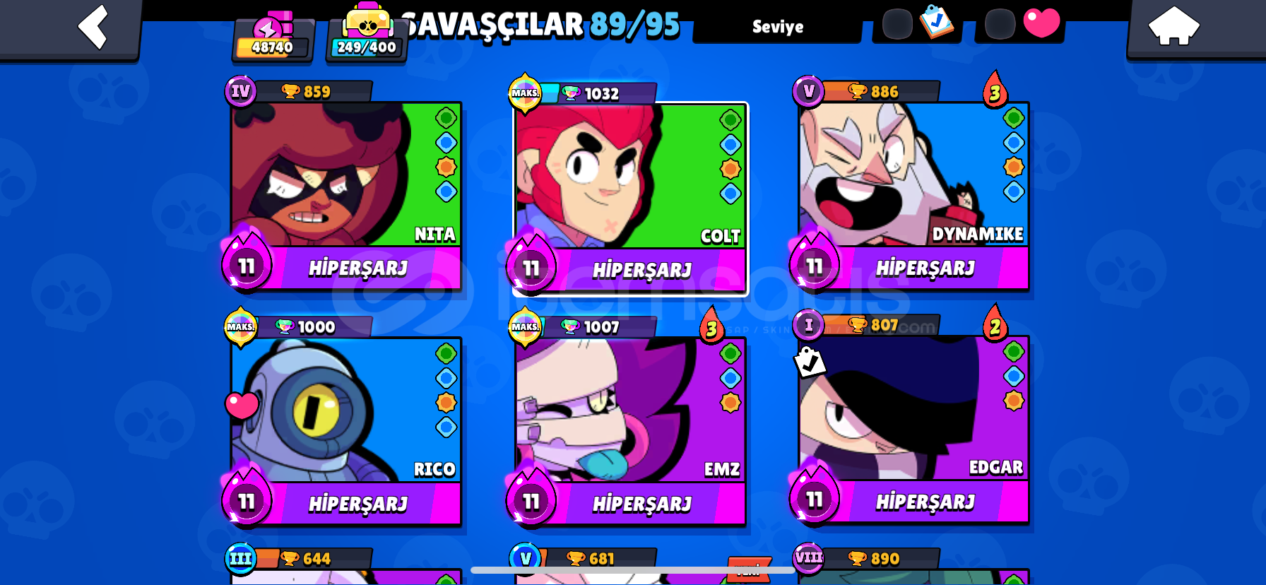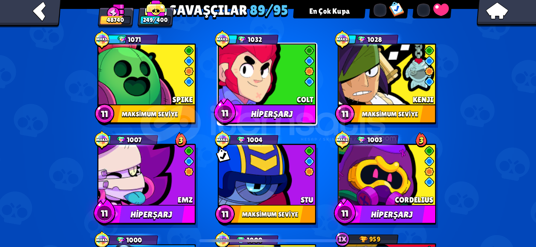 Hesapta 180 den fazla kostum vardır 89 karakter mevcut hpersarzlı ve Max karakterler baya vardır