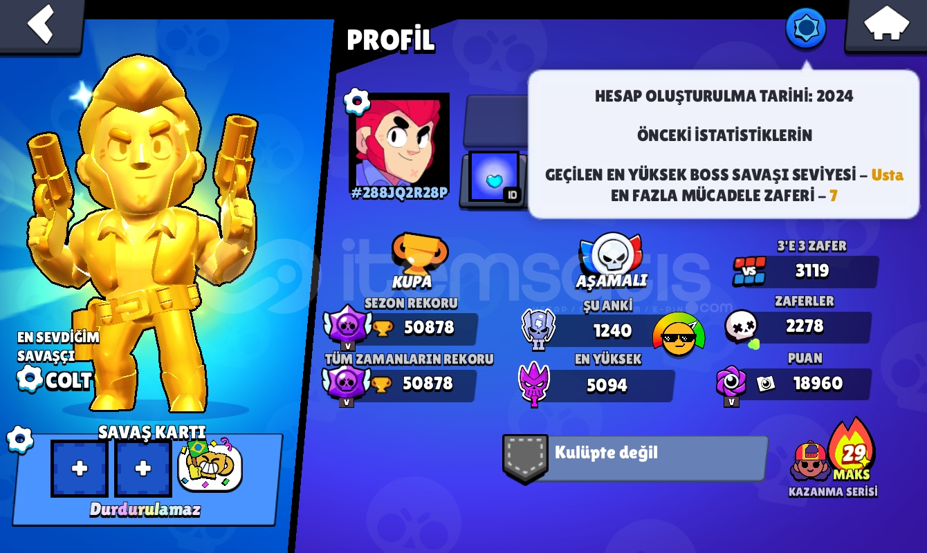 🔹 Güncel Kupa:50.878🔹 3v3:3119🔹 Karakter Sayısı:88🔹 11 Seviye Sayısı:16🔹 Hiperşarj Sayısı 36🔹 Ünvan Sayısı (Bp\Ustalık):14🔹Pro pas acıldı🔹 Ekstralar:🧥 Kostüm Sayıları 🟢 Ender:58🔵 Süper Ender:70🟣 Destansı:67🔴Gizemli:8🟡:Efsanevi8