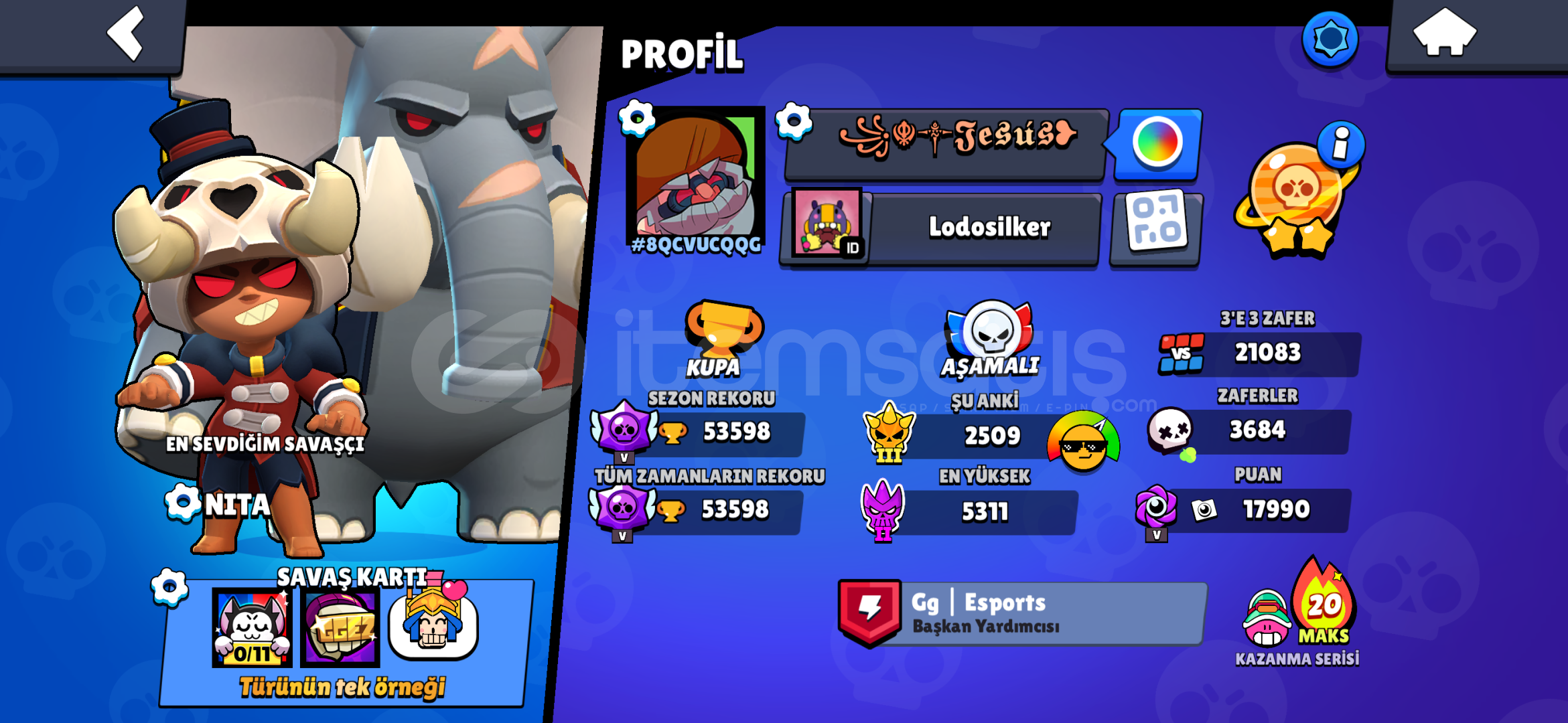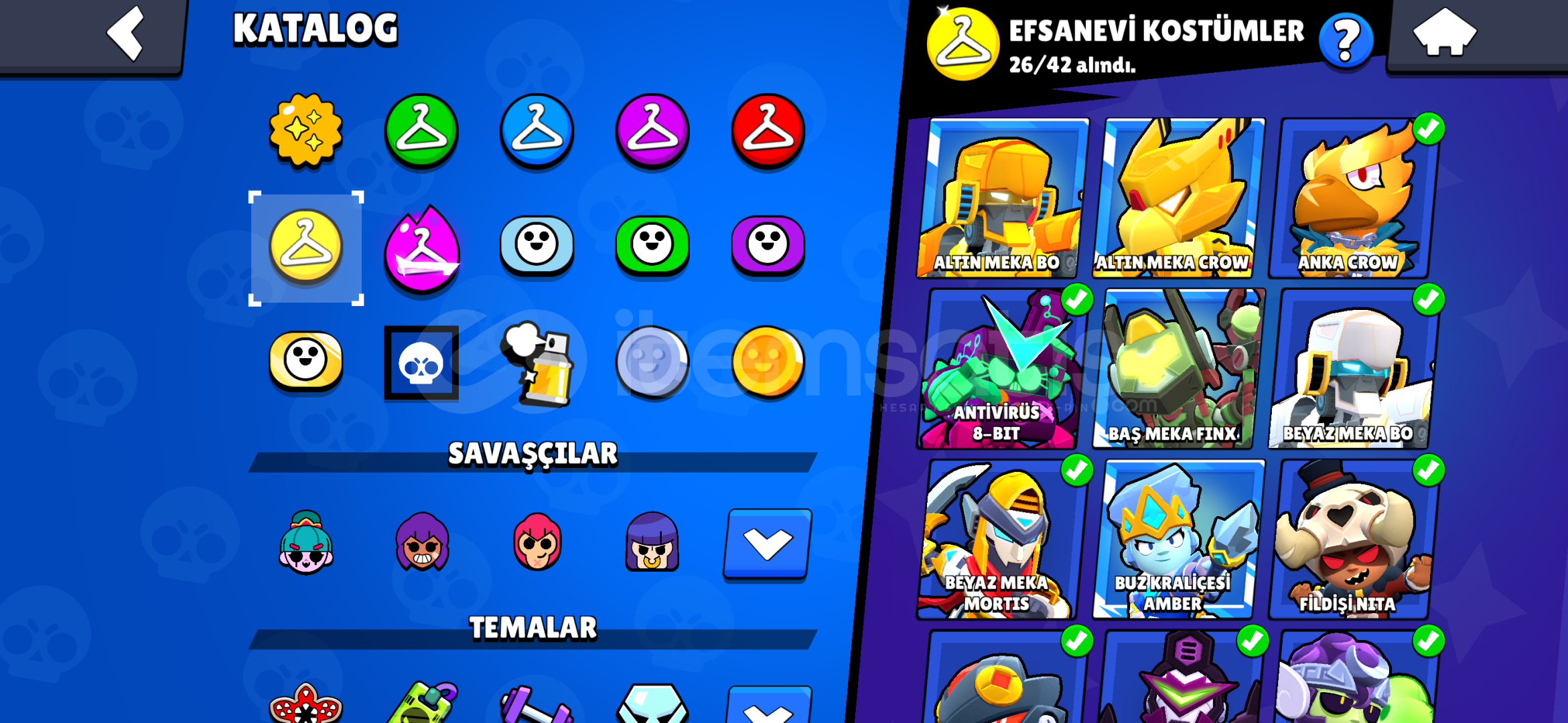 Hesabın içinde 12hiperşarj kostümü26 efsanevi kostüm31 gizemli kostüm140 destansı kostüm40tane hiperşarjlı karakter11 tane max karakter ve karakterletin hepsi açıktırNadir eski brawl pass kostümleride vardırpazarlık yapılır
