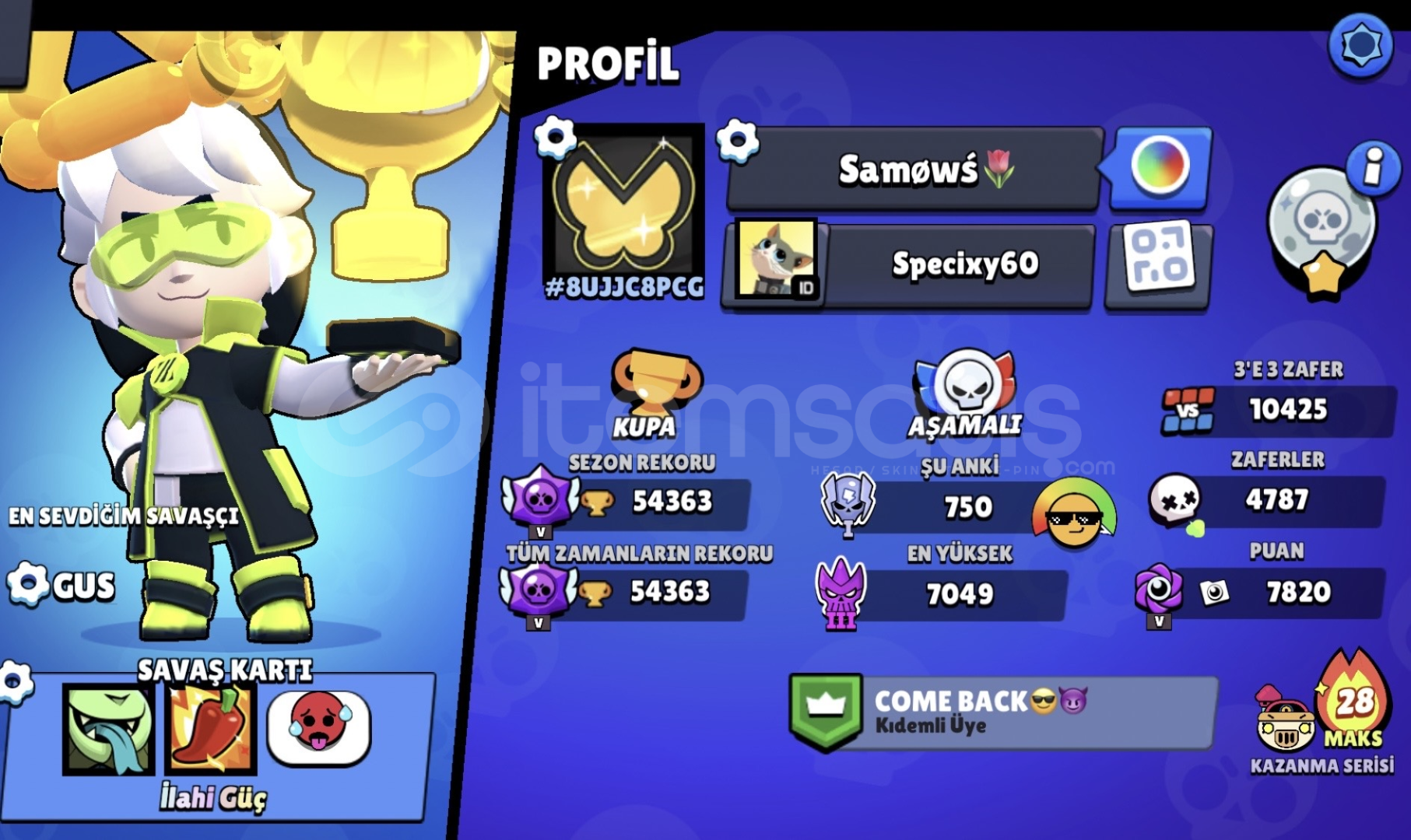HESAP 54 BİN’DİR193 KOSTÜM VARDIR10.000 3v3 VARDIRE-POSTA VE TELEFON DEĞİŞİYOR93 KARAKTER VARDIRŞUANKİ FİYAT 2 GÜN GEÇERLİDİR30.000 GÜÇ PUANI VARDIR30 ELMAS 3000 ALTIN VARDIR 8 SEVİYEDEN DÜŞÜK KARAKTER YOKTUR15 KARAKTER 11 SEVİYEDE