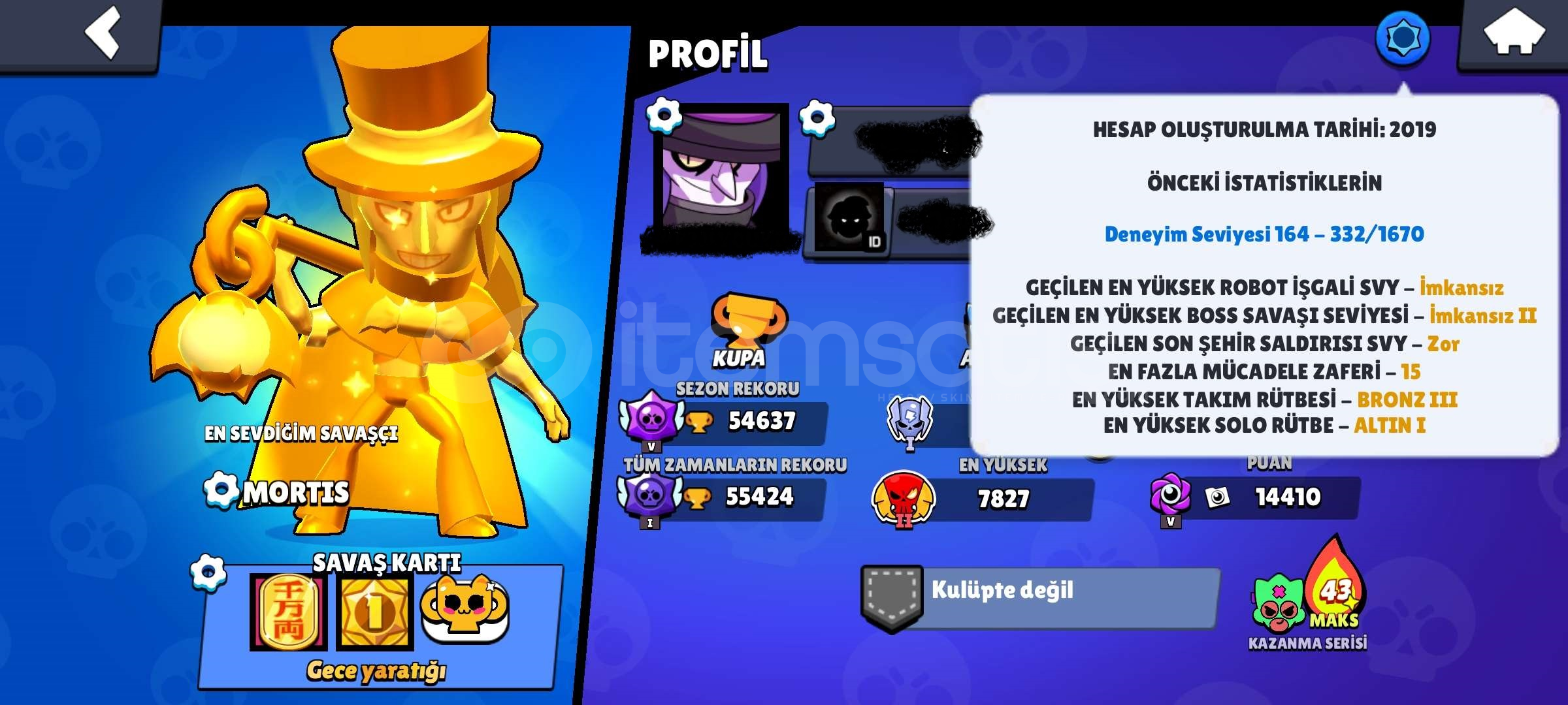 Hesapta 54000 Kupa 95 Karakter 35 Adet 11 Seviye karakter vardır, 20 ye yakın 1000 kupa üstü karakter vardır ve bir çok kostüm(birkaç kez BP Plus açılmıştır ve Coltun Pro passi açılmıştır.) ve özel pin(kupa pinleri) mevcut. Hesap supercell ID bağlı, güvenli şekilde devredilecektir.