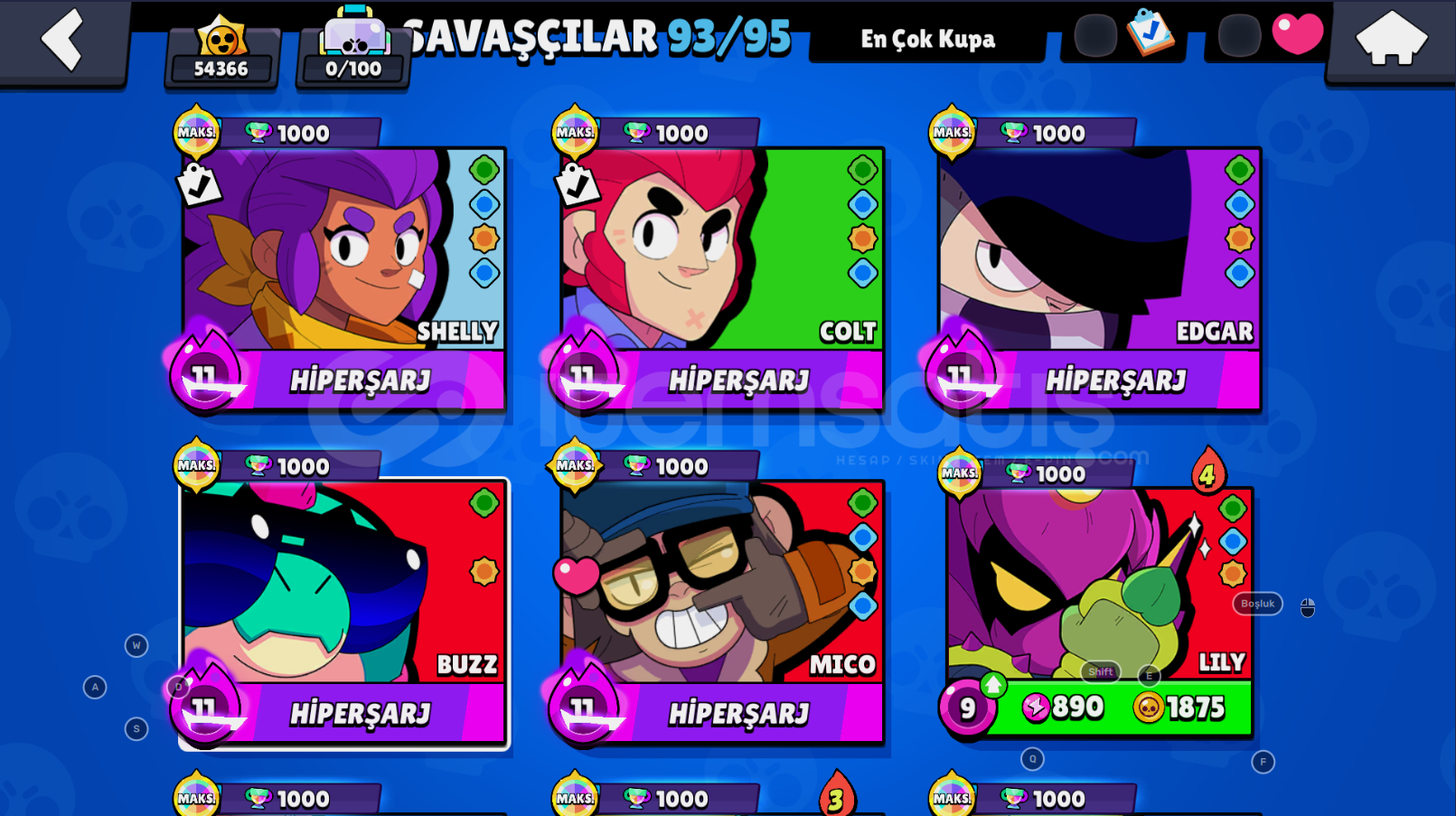 Hesap İçeriği;Hesapta 93 Karakter Bulunmaktadır. 29 Karakterde Hiperşarj Açıktır. 33 Karakterde Maximum Seviyededir.5 Brawlpp Açılmıştır. 6122 3e3 Zafer Vardır, 26 Bin Güç Puanı Vardır.64 Ender Kostüm , 76 Süper Ender Kostüm , 82 Destansı Kostüm , 7 Gizemli Kostüm , 4 Efsanevi Kostüm , 6 Hiperşarj Kostümü İle Birlikte Toplamda 239 Skin Bulunmakt...