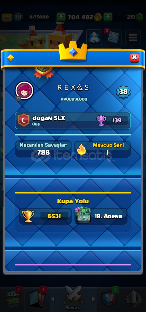 Hesapta Koruma Vardır!!Clash royale hediyeliHesap 57404 Kupadır.93 Karakteri Açıktır Yeni Gelenler Açılmamıştır.46 Karakter Hiperli Ve Maxtır.Geriye Kalanlar 10,9 Ve Altı Şeklinde seviyededir.Gizemli Skinler:Ares NaniAy Savaşcısı JanetFanggardiyanRodeo hankSirk sunucusu byronZeus brockSquad buster shellyEfsanevi Skinler:Antivirüs 8 bitBuz kraliçesi amberMeka mortisSporcu stuVirüs charlieSurge ...