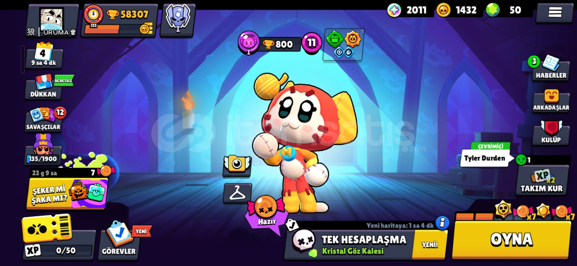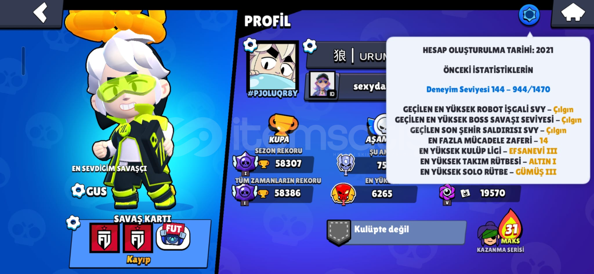 58 300 Kupa94 Karekter40 tane 11 32 tane max11k 3e3 Zafer13 tane Ünvan 9 tanesi karekter ünvanı19570 kayıt puanıMail degişirEfsanevi rank14 en fazla mucadele zaferi74 ender 85 super ender 60 destansı kostum 7 tane gizemli 3 tane efsanevi 5 hiperşarj kostumuBELLİ BİR MİKTAR PAZARLIK YAPILIR