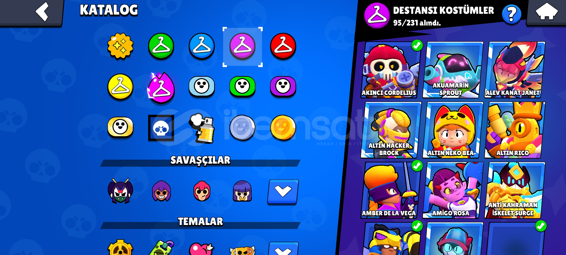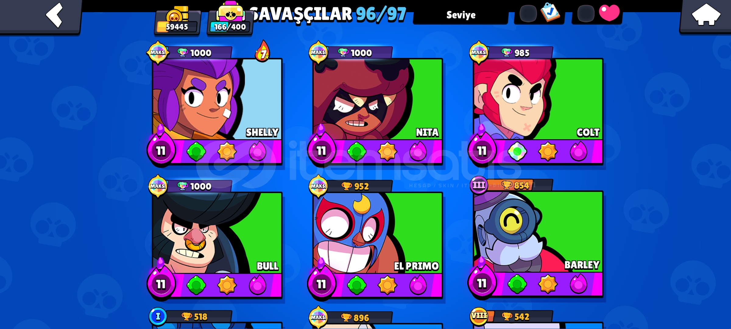 Hesapda 4 sezon brawl pass açıldıFiyatda pazarlık olurAcil satmam lazımHesapda 8 tane saf gümüş kostüm2 tane saf altın kostüm28 etkin hiperşarj36 tane 11 level karakter11 tane daha hiperşarj var ama aktif degil96 karakterMars 2 şöhret