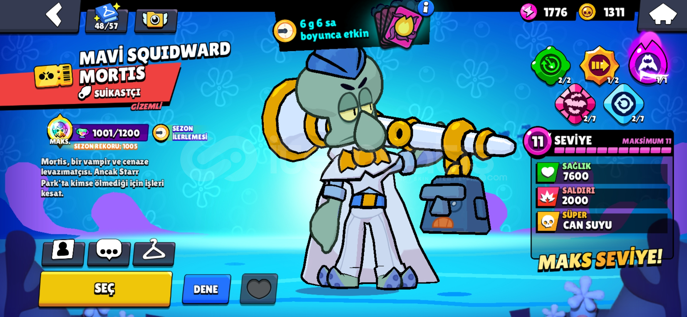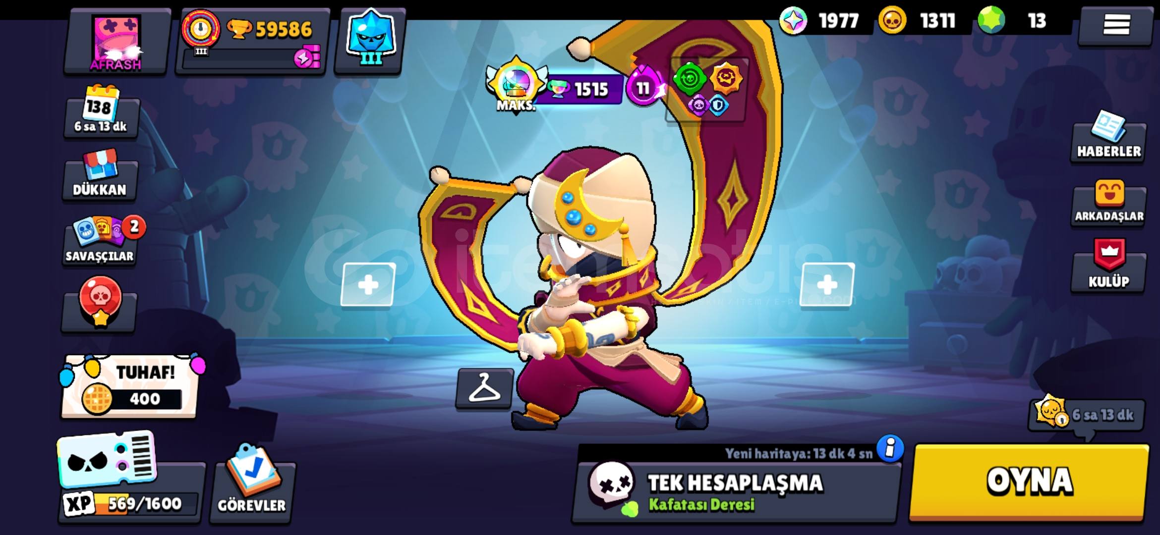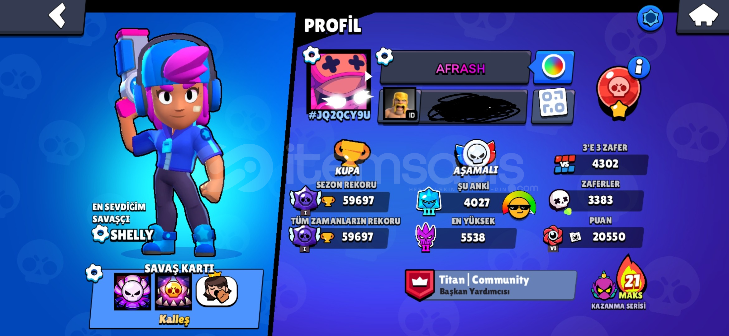 59.600 Kupa (2018'de açılmıştır)Brawl Pess plass ve Pro Pass açıktır.Mars Şöhreti 1 seviyesindedir.97/97 Karakter bulunmaktadır çoğu bin kupa.34 tane 11 seviye + hiperşarj bulunmaktadır.Toplam skin: 335ENDER: 105SÜPER ENDER: 78DESTANSI: 109GİZEMLİ: 24EFSANEVİ: 12HİPERŞARJ: 6Hesaptaki nadir skinler:YILDIZ SHELLYBAYKUŞ SHELLYŞEKERCİ LEONBEYAZ KURT LEONŞEKERCİ SAND...