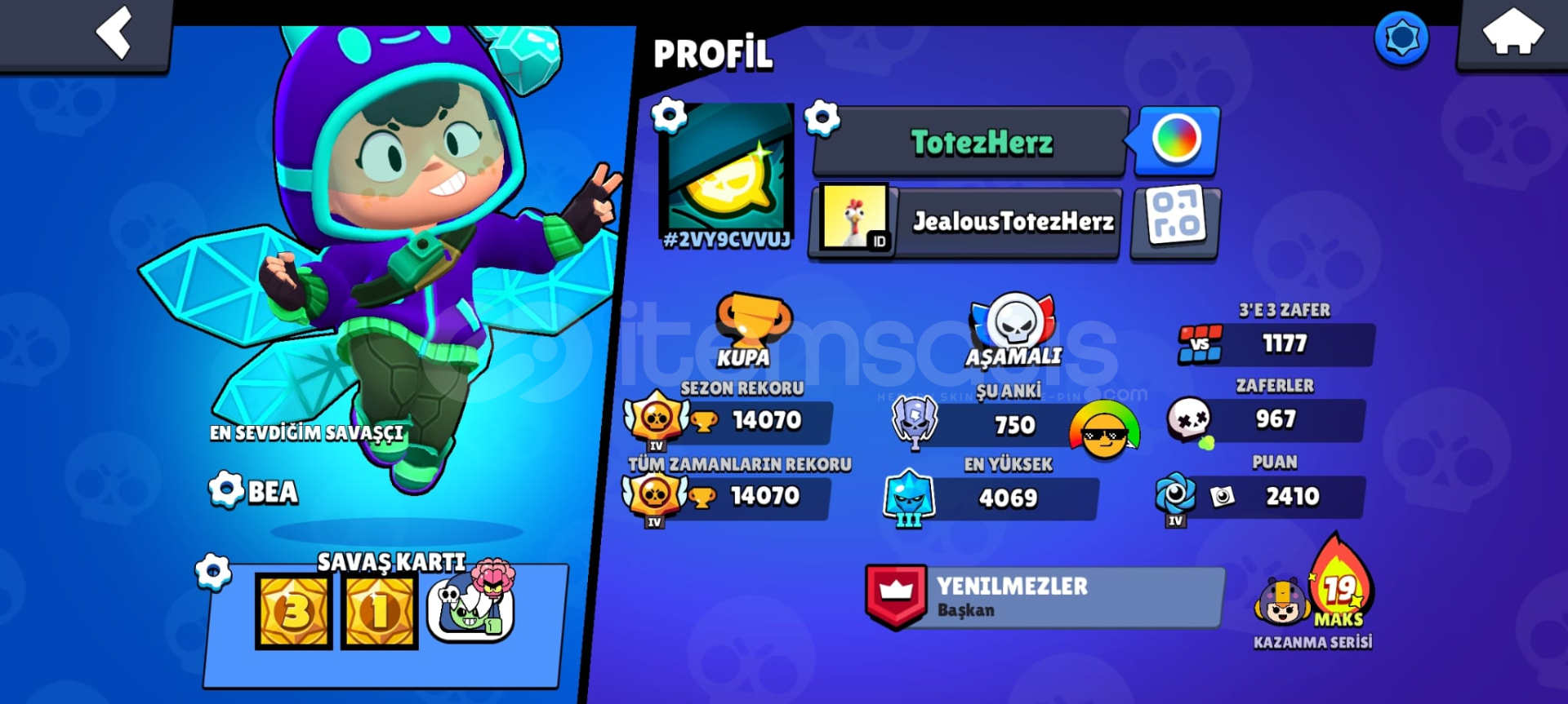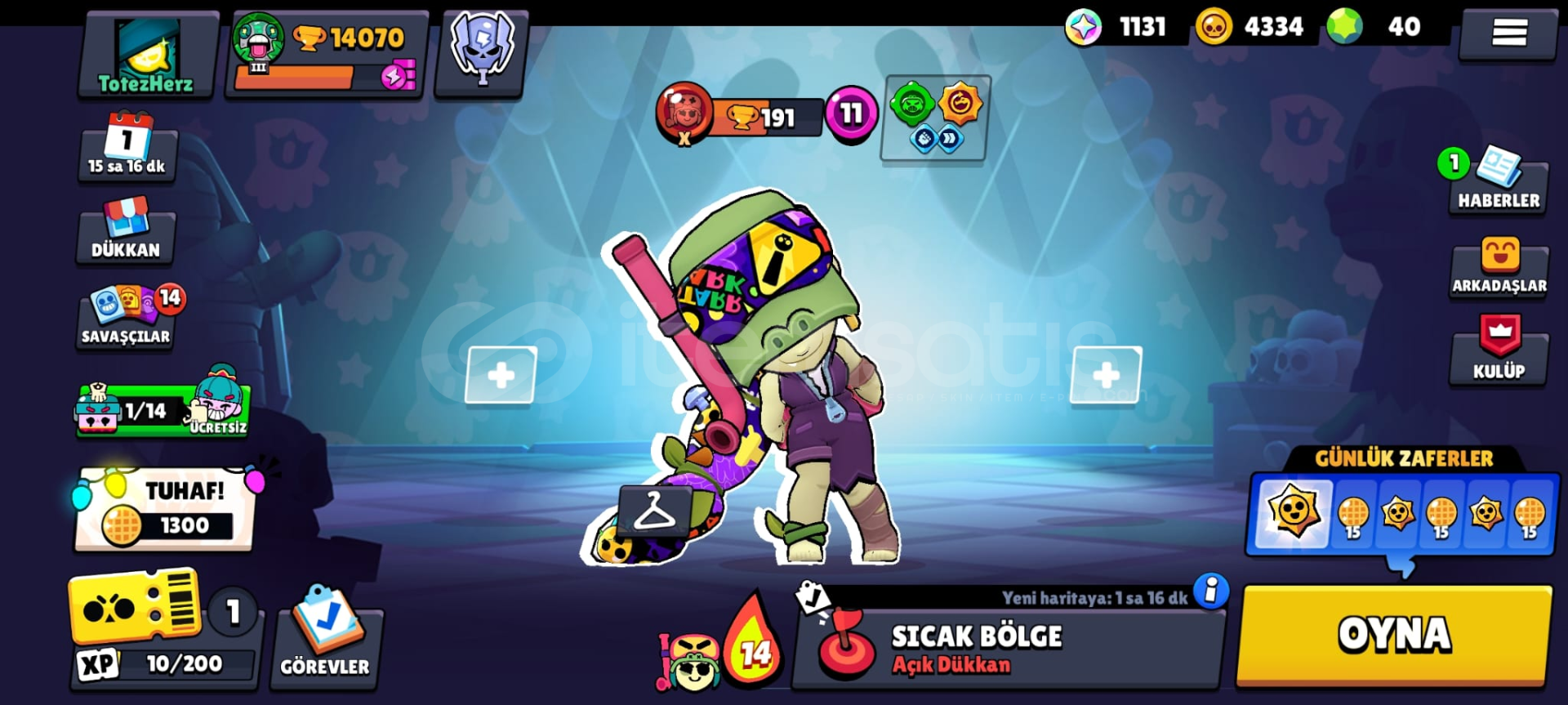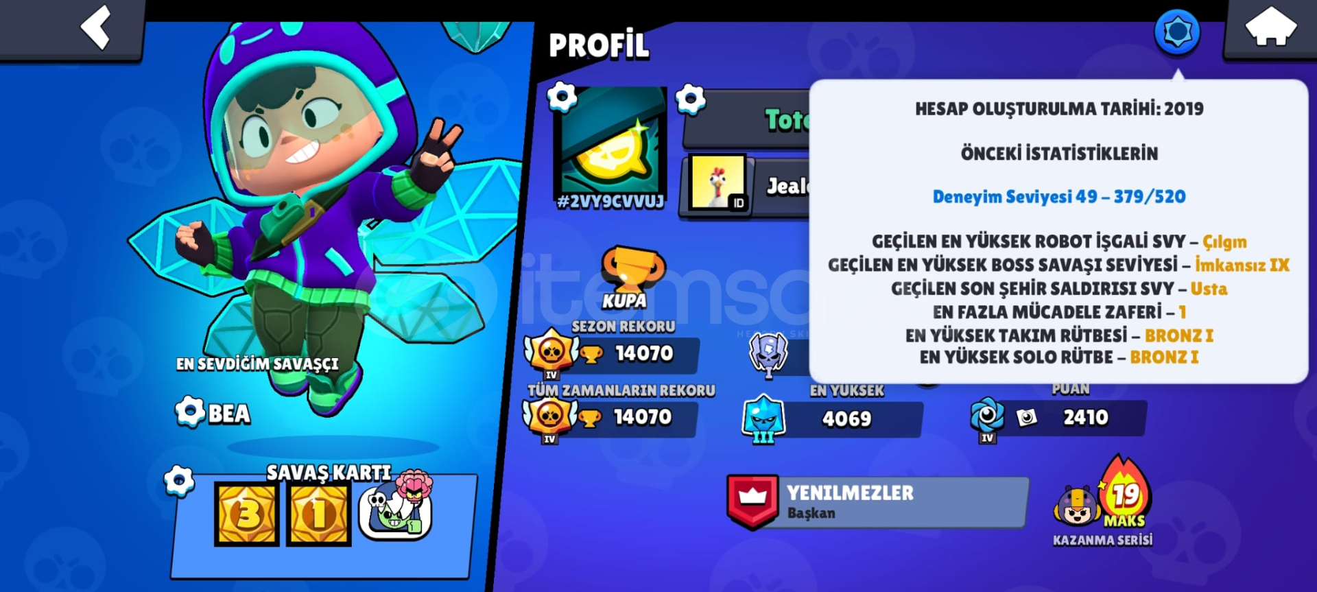 1 Efsanevi Kostüm1 Hiperşarj Kostümü3 Gizemli kostüm20 Destansı Kostüm26 Süper Ender Kostüm46 Ender Kostüm115 Koleksiyon Rozeti Açıktır14K kupada olup19 Hiperşarj açıktır12 MAKS karakter vardır#2VY9CVVUJ63 Karakter AçılmıştırHesap 6 Yıllıktır 6 yıl önce ben açmıştım bu yüzden değerli bir hesaptır. Alıcıs...