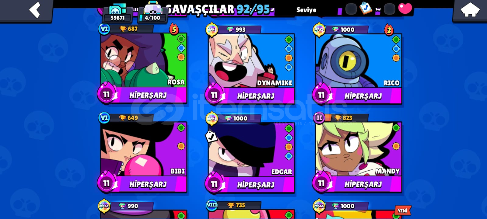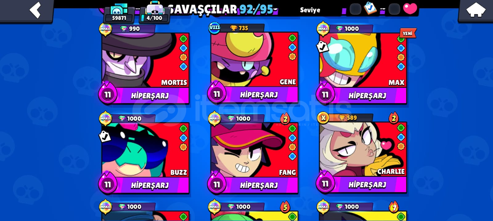 60K +160 SKINLI 4 ÖZEL ÜNVAN 92 KARAKTER MEVCUT 27 MAX 40 HİPERŞARJ KARAKTER 4000 MÜCEVHER VAR