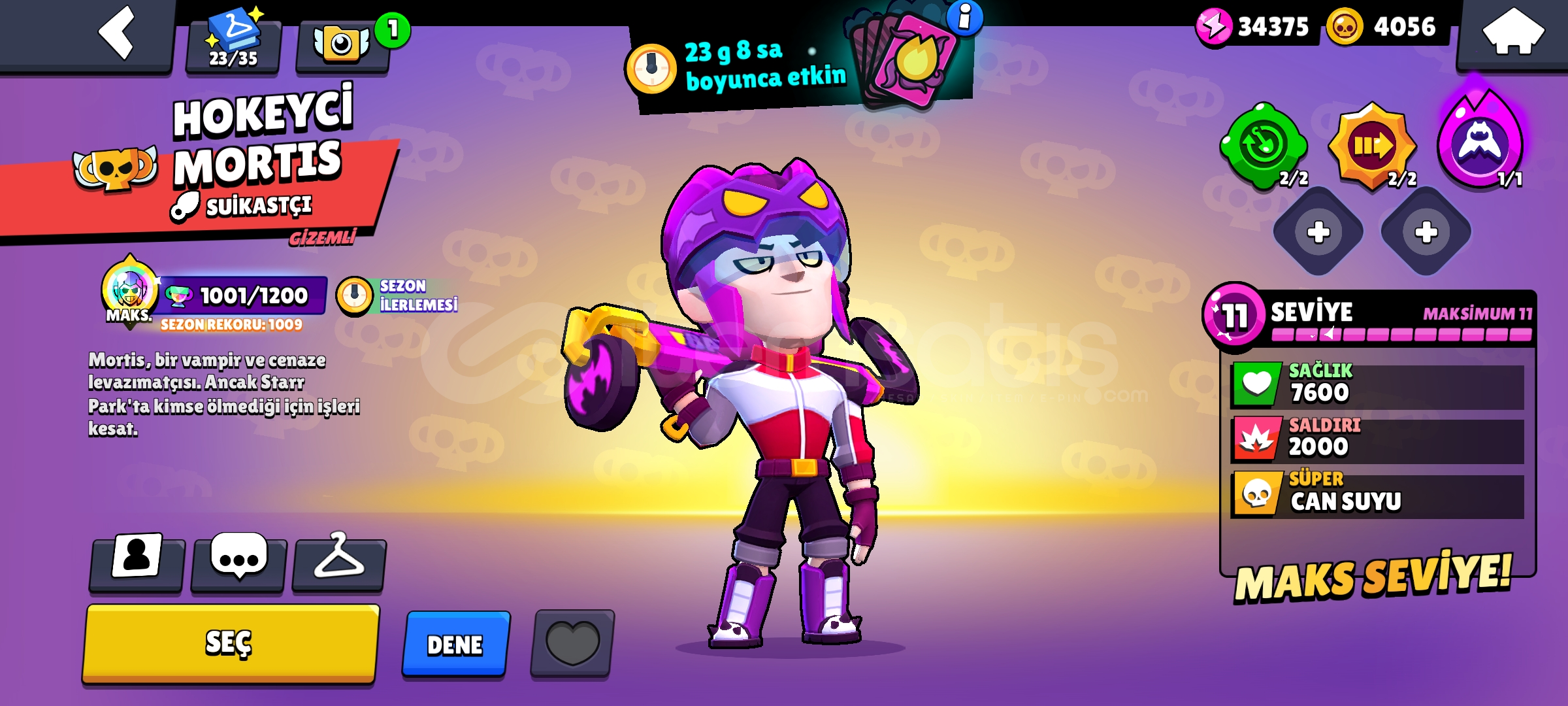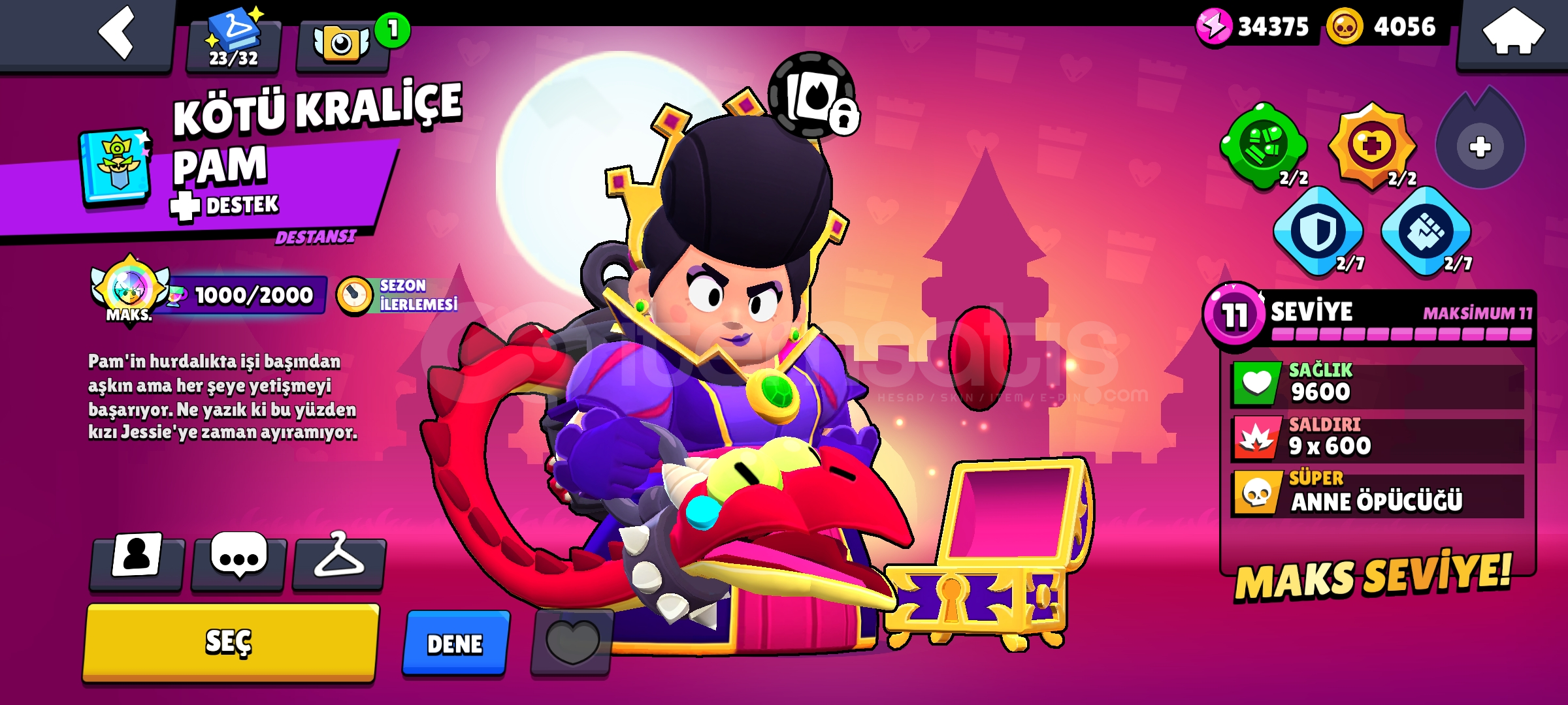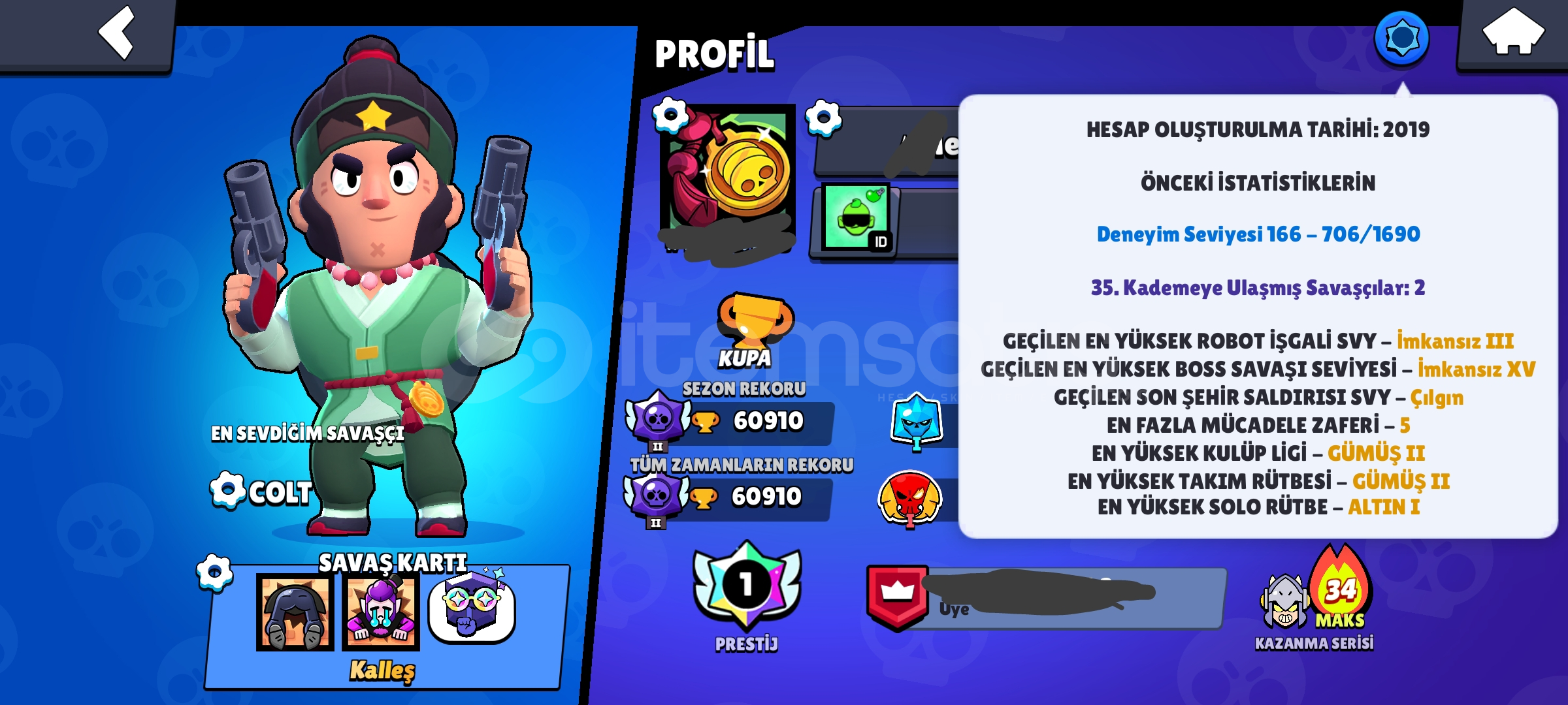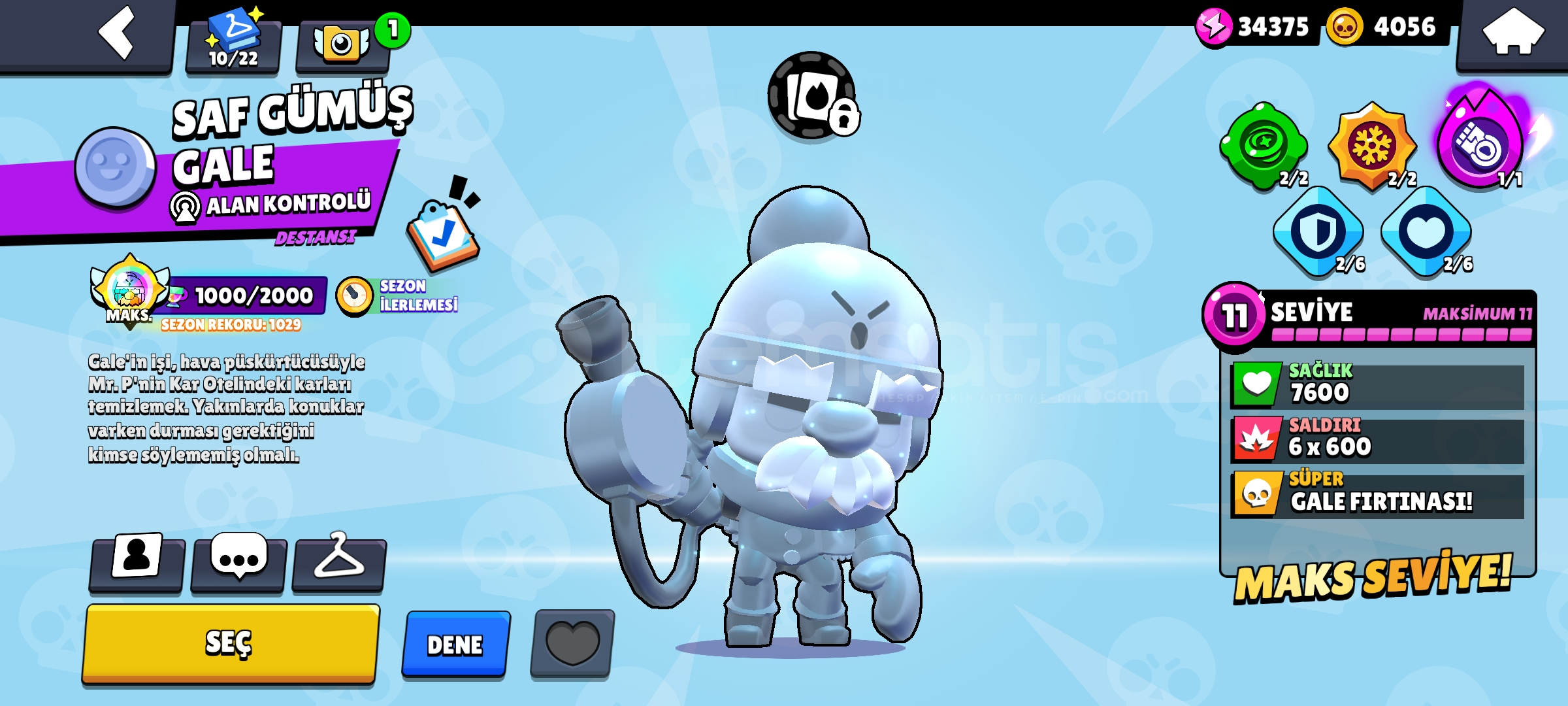 Hesap güncel olarak tüm zamanlarda Türkiyede pam de ilk 60 da gale de ilk 250 dedir.Gale da Türkiye birnciliği vardır!!indirim az da olsa vardır.35 Rank pini + matcherino spike pini vardır 74 ender 81 Süper ender90 destansı8 gizemli 6 efsanevi 5 hiperşarj kostümü vardır totalde 270 kostümü vardır.Daha fazla detaylı bilgi için dm.Hesap koruması aktif değildir.