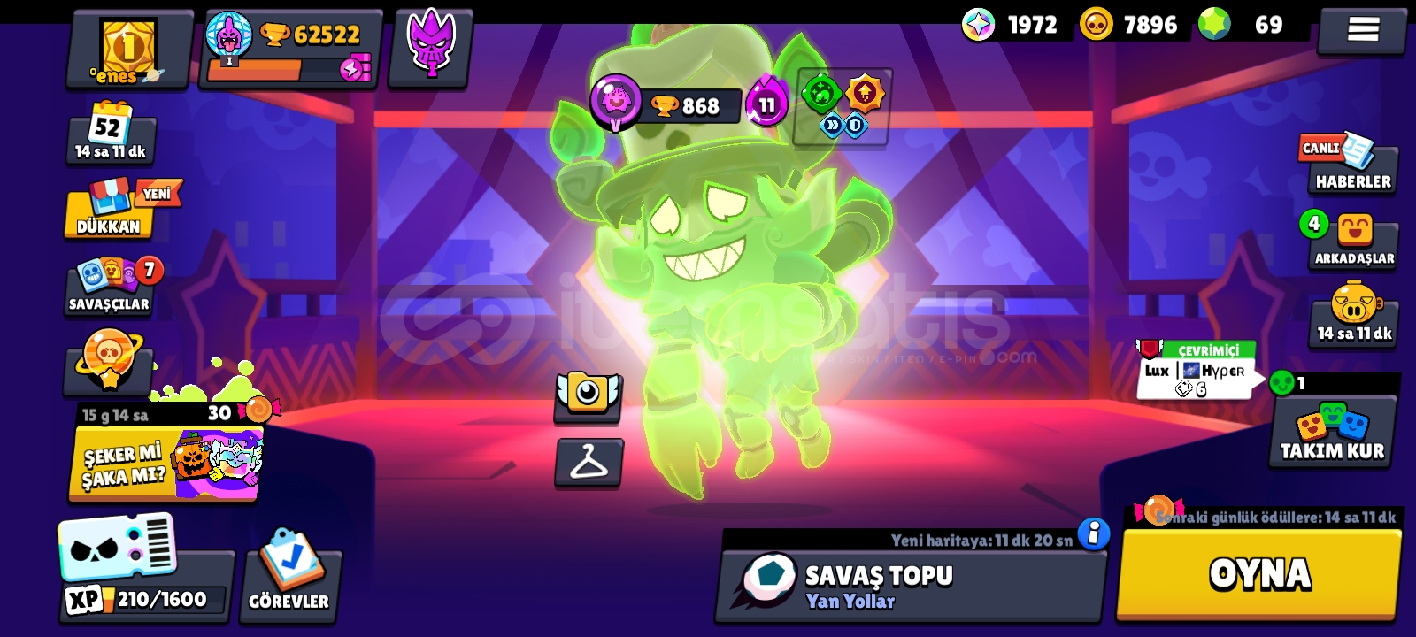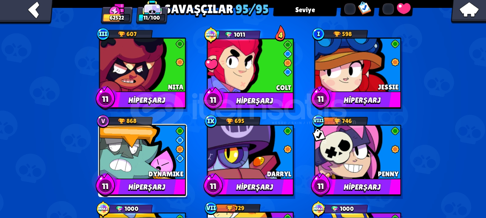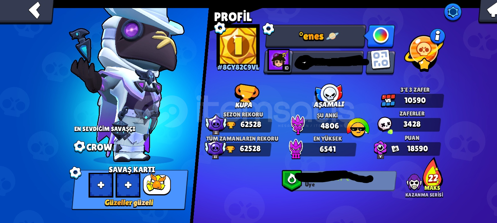 Hesapta dynamike için pro pas açıktır.Bu sezon ve bi önceki sezon pas plus açılıp maxlanmistir.Hesabin kupasi 62500+95 Karakterin 95i de var.Hesapta Mina karakteri haric her karakter 490 kupa ve üstüdür.Satürn şöhreti hesaptır.Bu sezon aşamalı gizemli rankidir.Hesapta Kahraman Bibi, Beyaz Meka Bo, Altın Meka Colt, Meka Colt, Bo peep Bibi ve çok dahası gibi güzel kostümler vard...