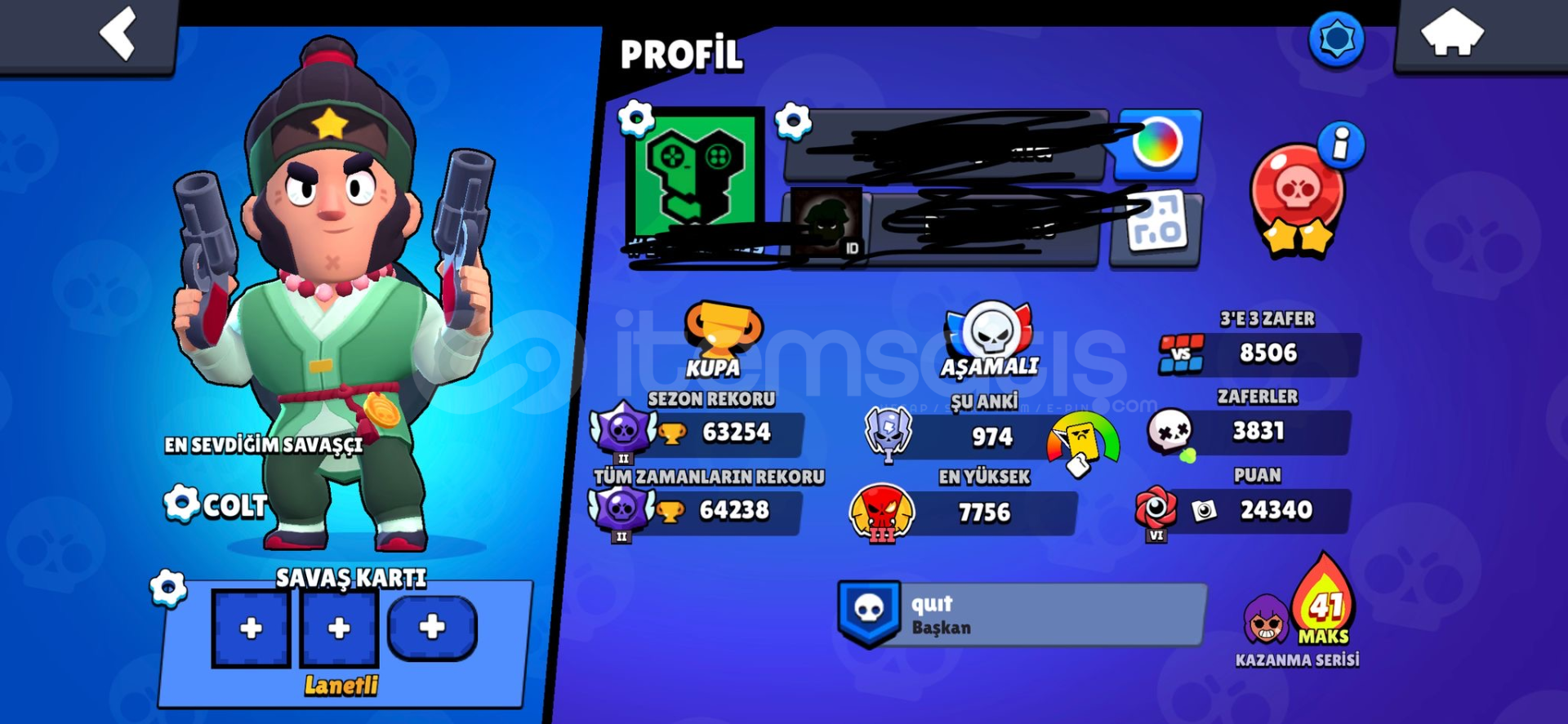 6 Sezon üst üste efsanevi atılmıştırMars 3 Şöhretine 3k kredi kalmıştır2020 hesabıdırShelly ile sıralamaya girilmiştir250+ kostüm32 hiper mevcutturİndirim Payı mevcutturDetaylar İçin mesaj atabilirsiniz.
