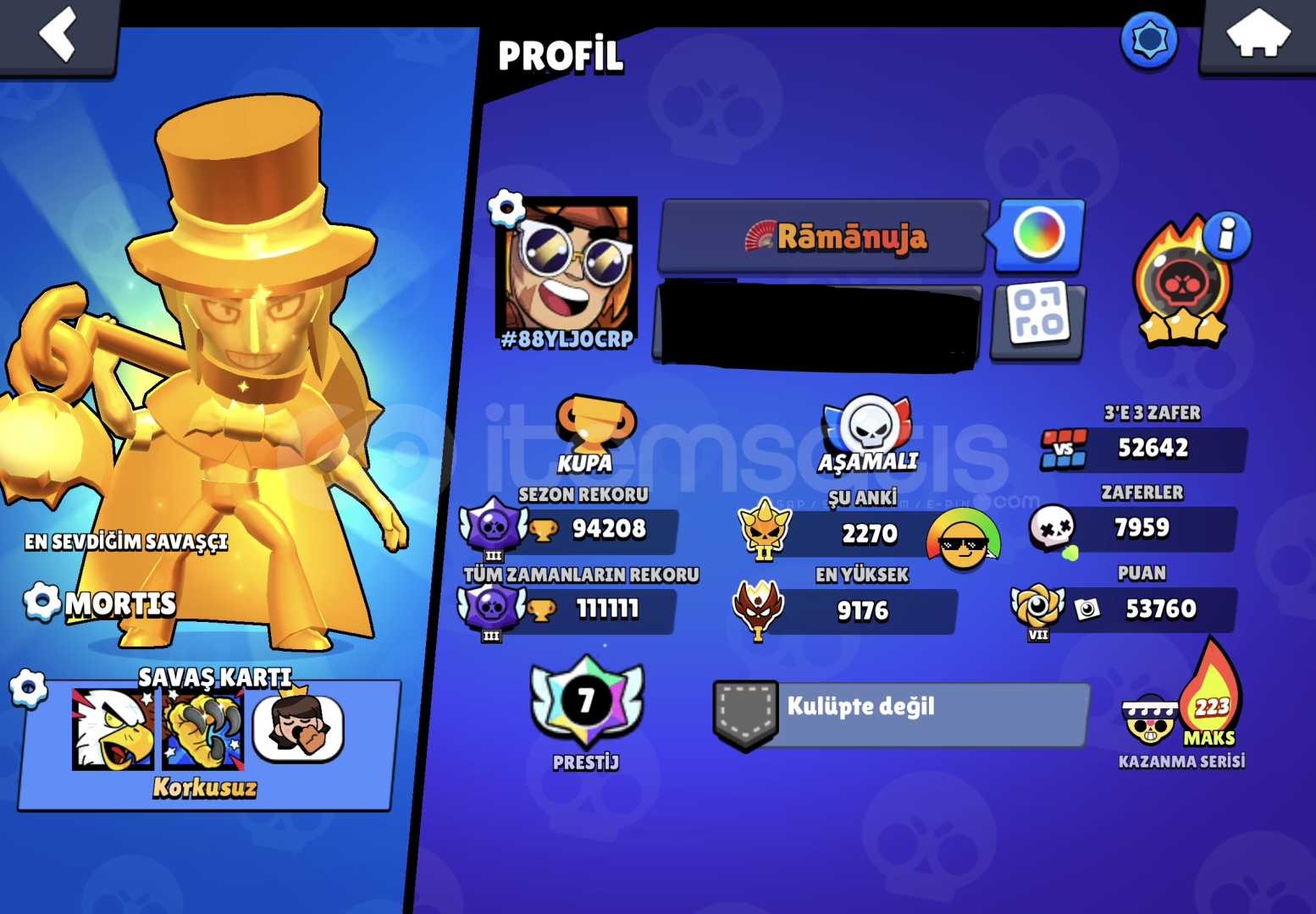 111k kupa53k 3v3 Zaferi8k Hesaplaşma ZaferiMaster 650+ Kostüm53k Kayıt Puanı7 Prestij2 Karakter 2000+Kupa Üstü17 Karakte...