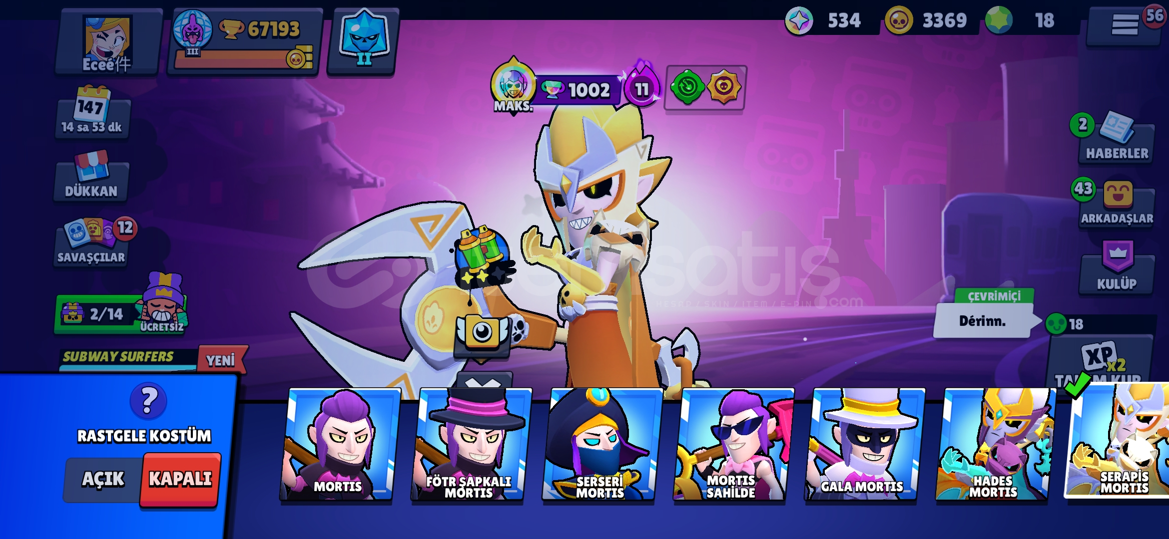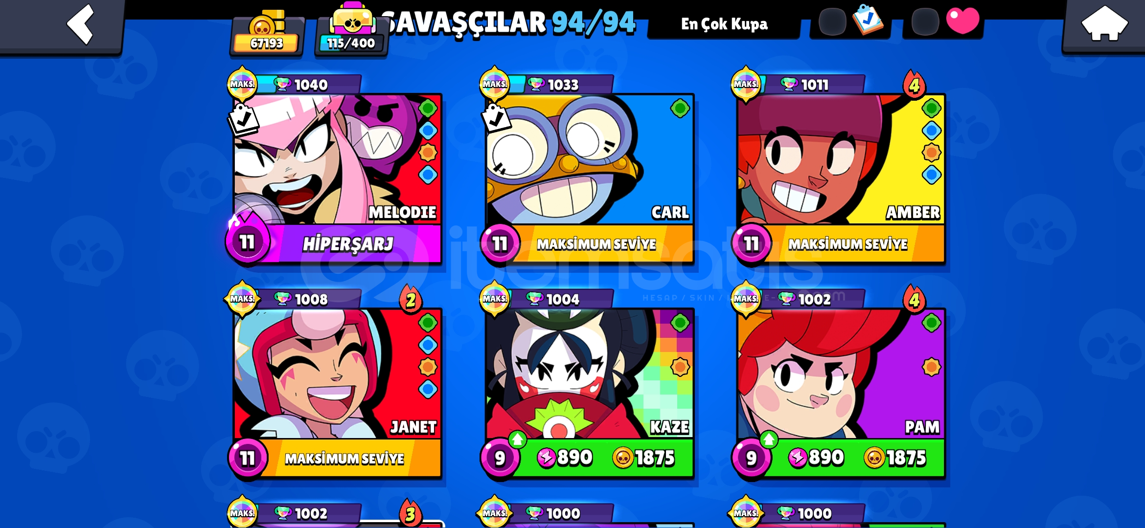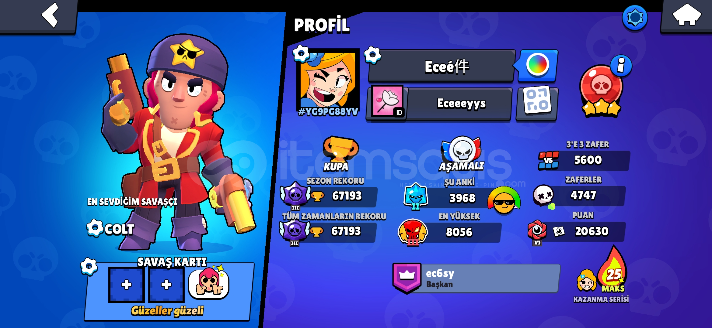 Oncelikle merhaba bu hesabın yanında +olarak 11.000 kupalı bir hesabı daha vermeyi dusınuyorum hızlıca satılmasını istedigim icin bu sekilde bir sey yaptim ek olarak hesap hakkında;Hesapta tüm karakterler mevcuttur.cokca sayıda kostüm bulunmaktadır asamalı seviyesi en fazla 8000 yani efsanevi 3 tür 2021 hesabıdır İyi günler..