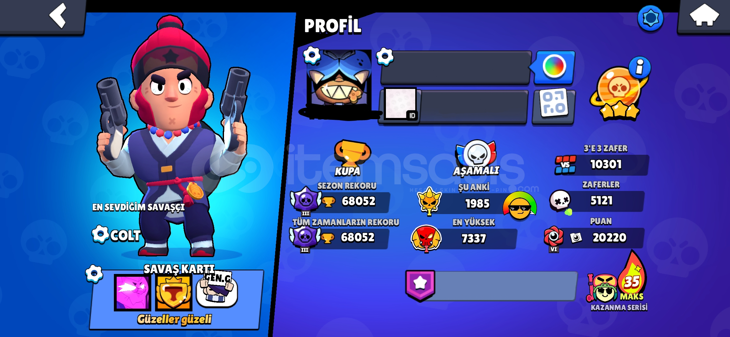 🔹 En Yüksek Kupa: 68052🔹 Güncel Kupa: 68052🔹 3v3: 10301🔹 Karakter Sayısı: 95🔹 11 Seviye Sa...