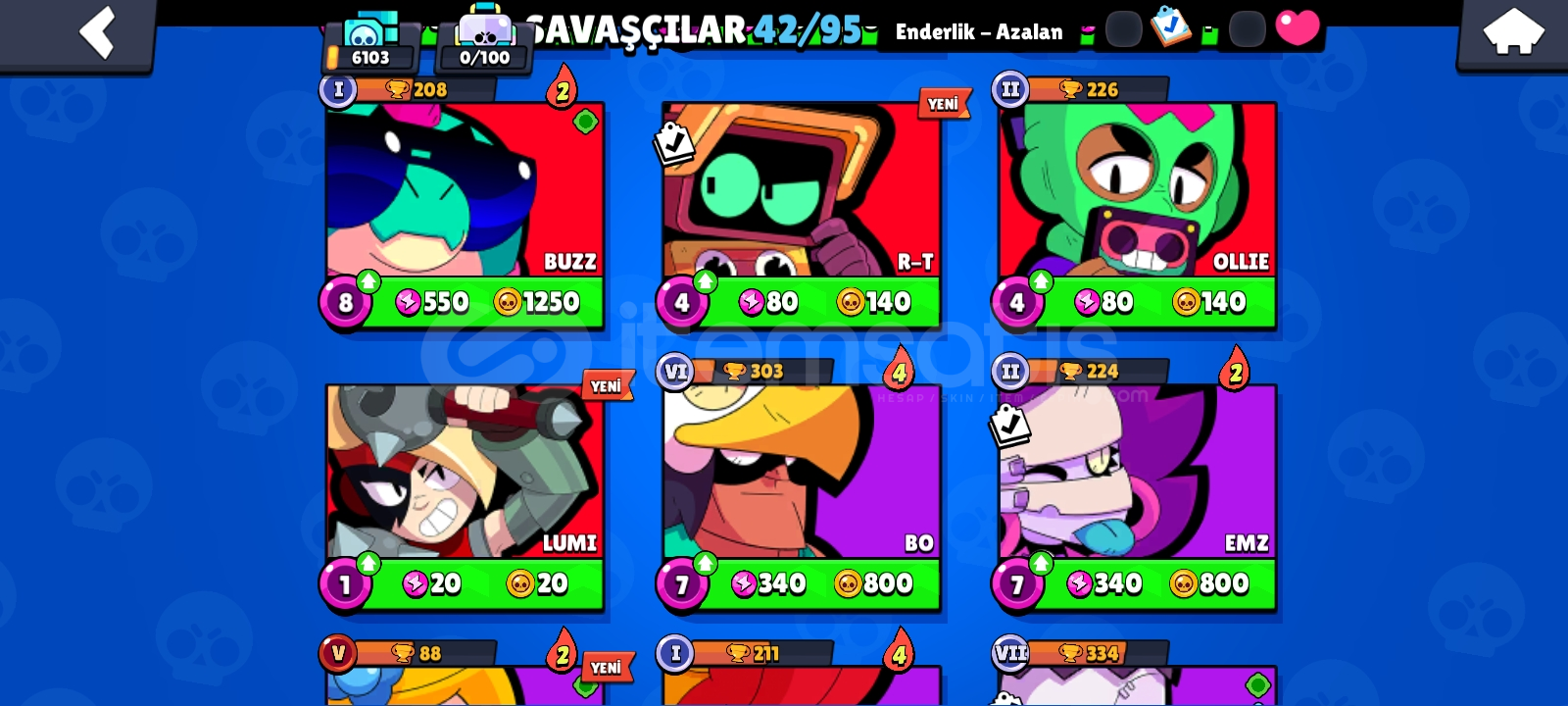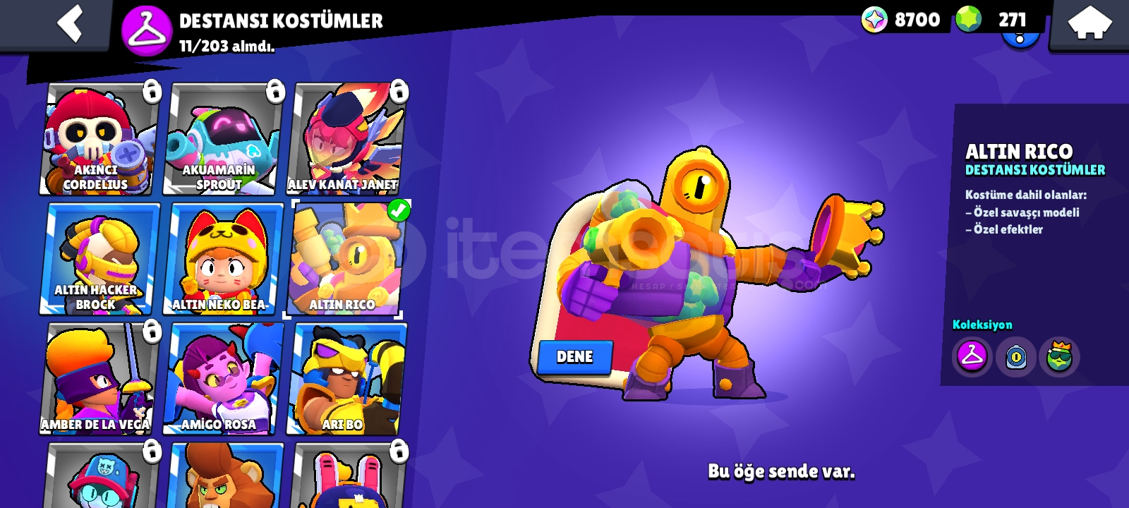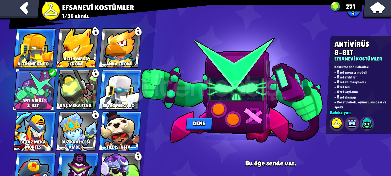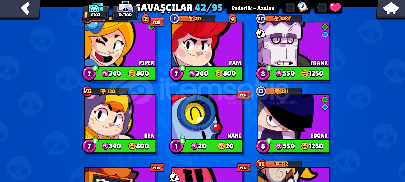 42 Karakter ve 6100 kupa içinde güzel kostümler var hiper şarj Edgar efsanevi 8 bit kostümü 40.000 altın 271 elmas 11.000 yükseltme şeyi çok güzel bir hesap