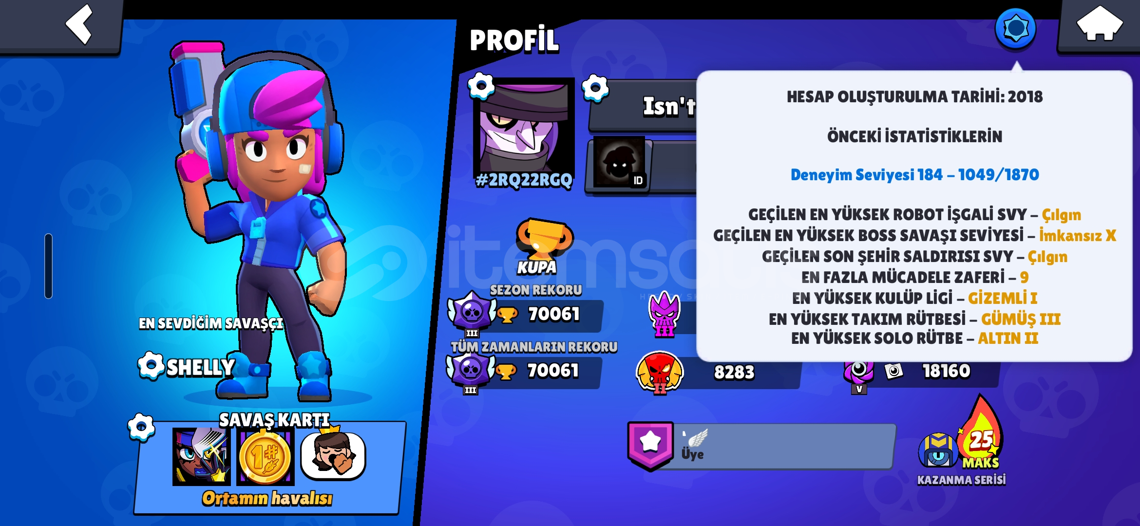 🔹 En Yüksek Kupa: 70.061🔹 Güncel Kupa: 70.061🔹 3v3: 15242🔹Tek/Çift Zafer : 4028🔹 Karakter Sayısı:95🔹 11 Seviye Sayısı: 25🔹 Kaç 1k Karakter: 31🔹 Aşamalı Bilgisi 2024 Efsanevi 4 yıldız/2025 Efsanevi düz🔹 Ünvan Sayısı (Bp\Ustalık): 6🔹Şöhret: Satürn Şöhret 1🔹Gmail değişimi açık /...