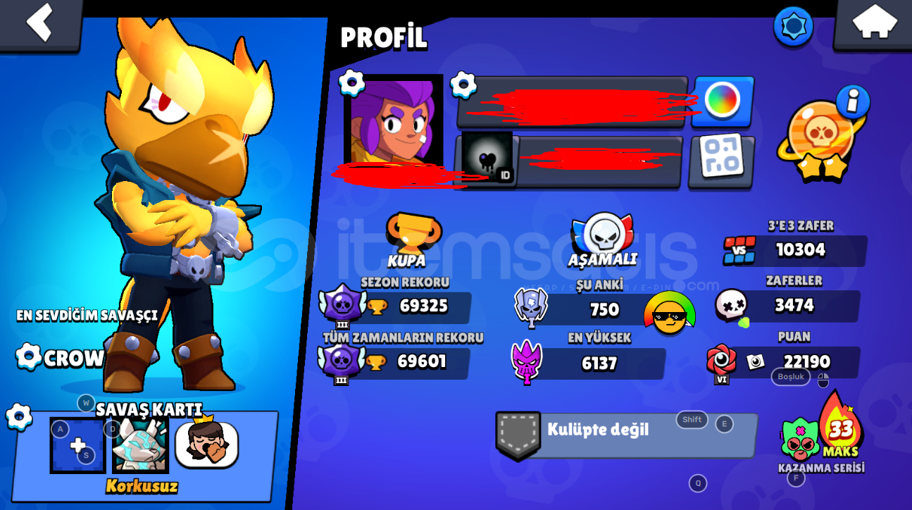 Brawl Stars hesap bilgileri;69k kupalıdır.95 karakterlidir. ( Zıggy karakteri dısında tüm karakterler vardır )276 köstümlüdür. ( 2 altın, 2 gümüş, 4 hiperşarj, 5 efsanevi, 11 gizemli, 78 destansı, 87 süperender, 86 ender adetindedir )55 adet hiperşarj vardır. 36 adet 11 seviye, 6 adet 10 seviye, 19 adet 9 seviye, 25 adet 8 seviyesinde karakter vardır.hesap satürn şöhreti 2 dir....