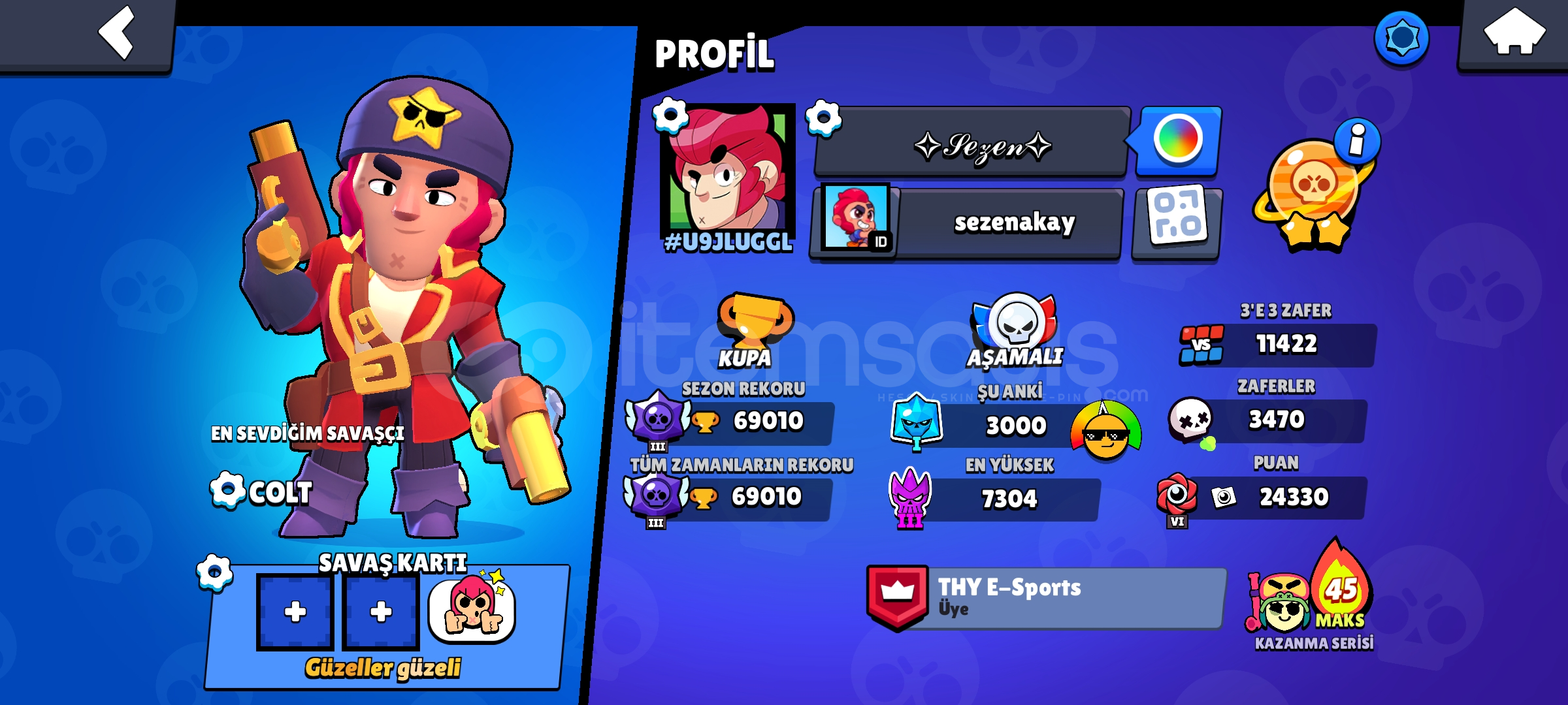 FOTOĞRAFLAR ESKİDİR YAKINDA YENİLEYECEĞİM!!!HESAPTA BULUNANLAR:•71 BİN KUPA •95 KARAKTER (FULL) •270 KOSTÜM (6 TANE HİPERŞARJ , 9TANE EFSANEVİ ,12 TANE GİZEMLİ KOSTÜM) •ŞÖHRET SEVİYESİ SATÜRN 3•2020 TARİHİNDE KURULDU •BİRKAÇ NADİR KOSTÜM(KORSAN COLT, WOODY COLT VB.) •14 ÜNVAN ...