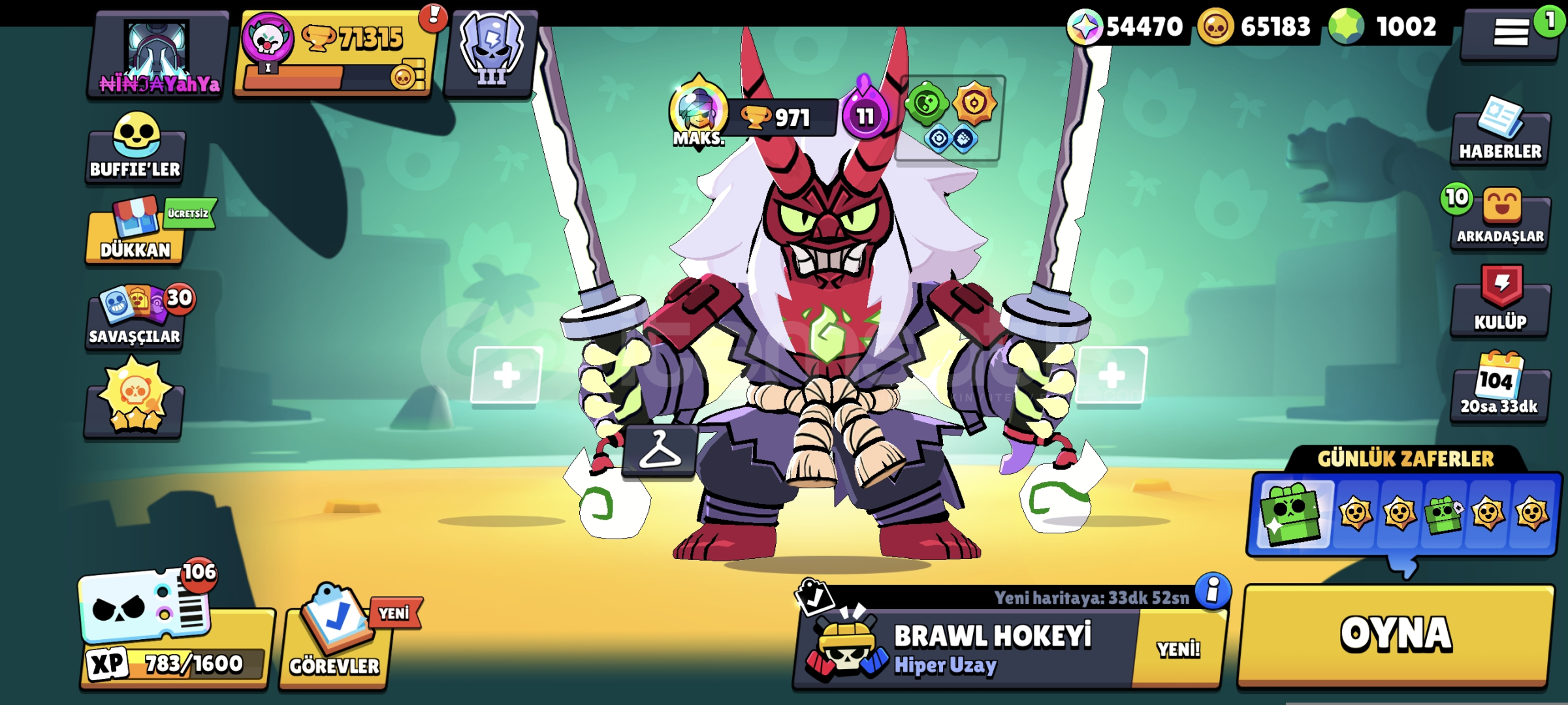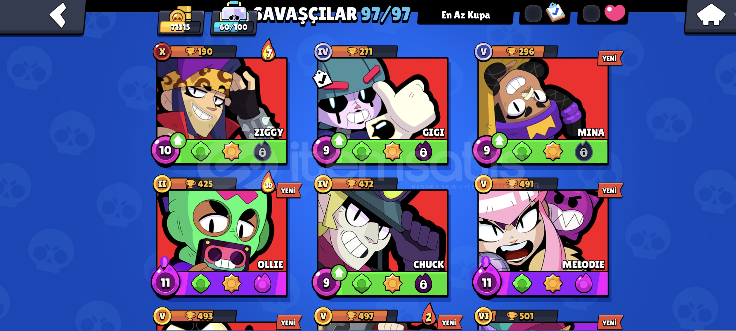 Hesap tamamen bana aittir.Supercell ID maili ile birlikte teslim edilecektir.97/97 tüm savaşçılar açıktır.71.000+ kupa, 1000+ elmas mevcuttur.Ban, uyarı, ceza yoktur.Sadece ciddi alıcılar yazsın.