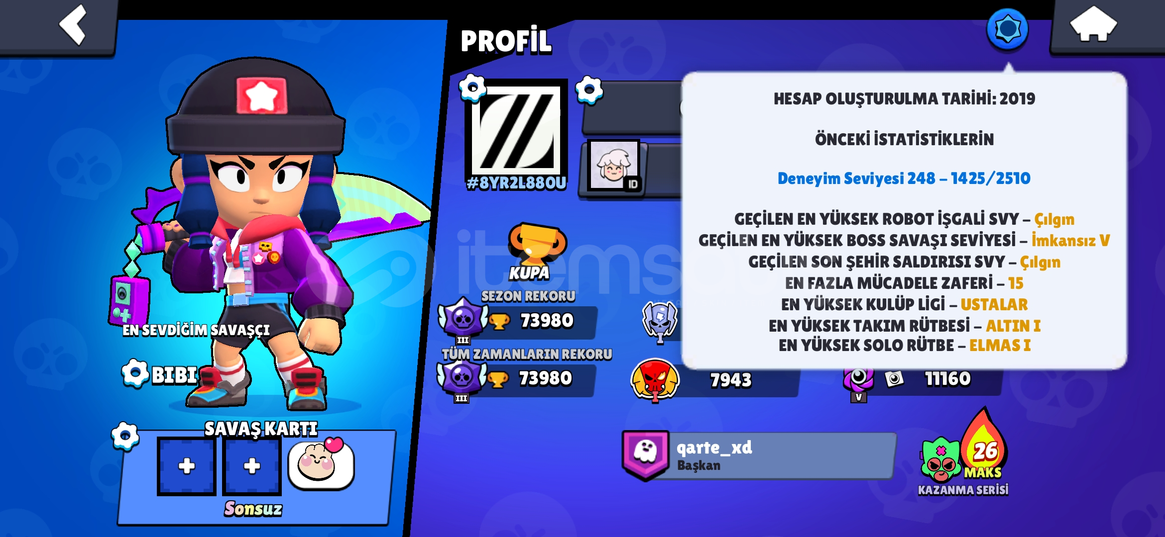 Hesapta 190 dan fazla kostüm bulunmaktadır, çoğu nadir kostüm.92 karakter bulunur.73 bin kupadır.2019 hesabıdır.En yüksek mücadele seviyesi 15 dir.Gerekli ve merak edilen şeyler resimlerde mevcuttur.Gmail değişimi yapılır.Bilgi için dm den bana yazabilirsiniz yardımcı olurum.