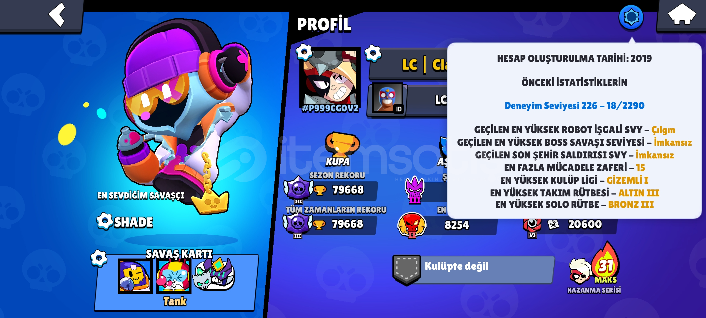 Hesabım 80000 kupa 95 karakter var 300 kostüm bulunmakta ölü fiyata bırakıyorum oyunu bırakmaya karar verdim. temiz...