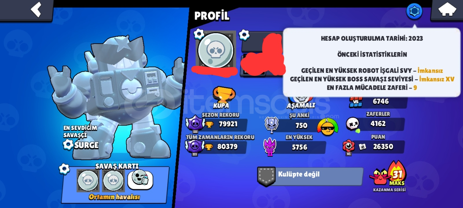 🔹 En Yüksek Kupa:80379🔹 Güncel Kupa:79921🔹 3v3:6746🔹 Karakter Sayısı:93🔹 11 Seviye Say...