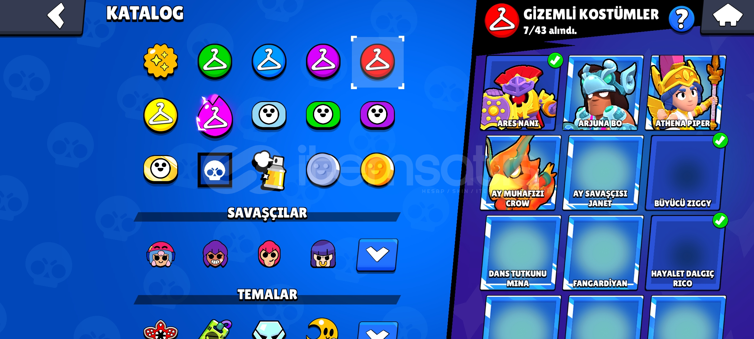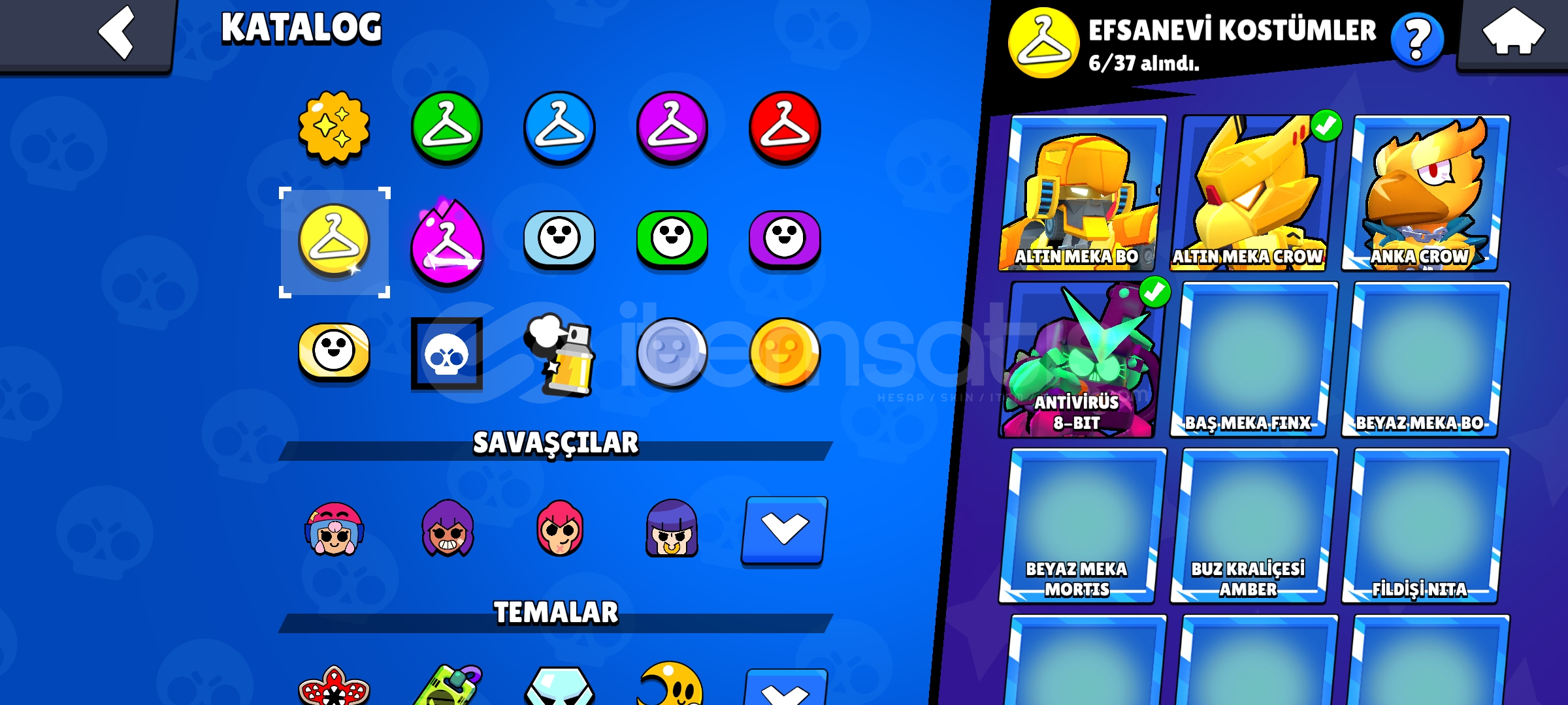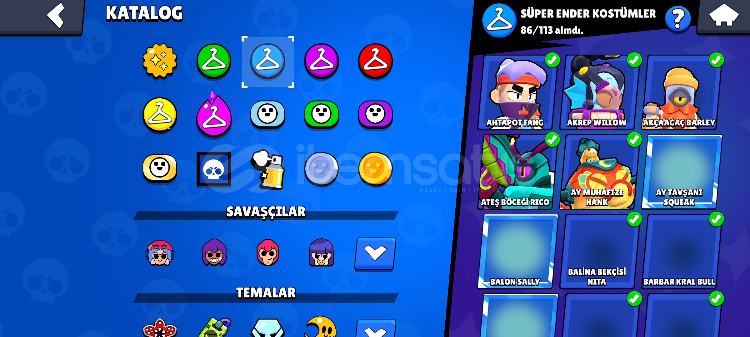 Hesapta Tam Tamına 320 Kostüm vardırKostümlerde Nadir Olanlarda Var Ve Çoğunlukla Destansı Kostümler vardır82.000 Kupa Ve Kasılacak Birsürü Düşük Kupa Karakterler Vardır Onlarda Kasılınca Rahat 85.000 Kupaya GelebilirsinizHesabın İsmi 90 Elmasa DeğiştirilebilirNeredeyse Her Karakterde Kostüm VardırHesap 2020 KurulumludurHesapta 25 Karakterden Fazla 1.000 Kupa Vardır Kara...
