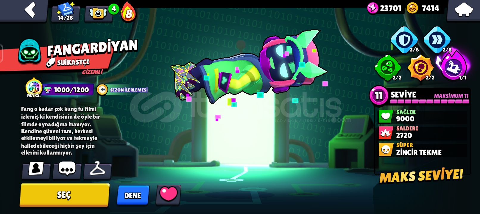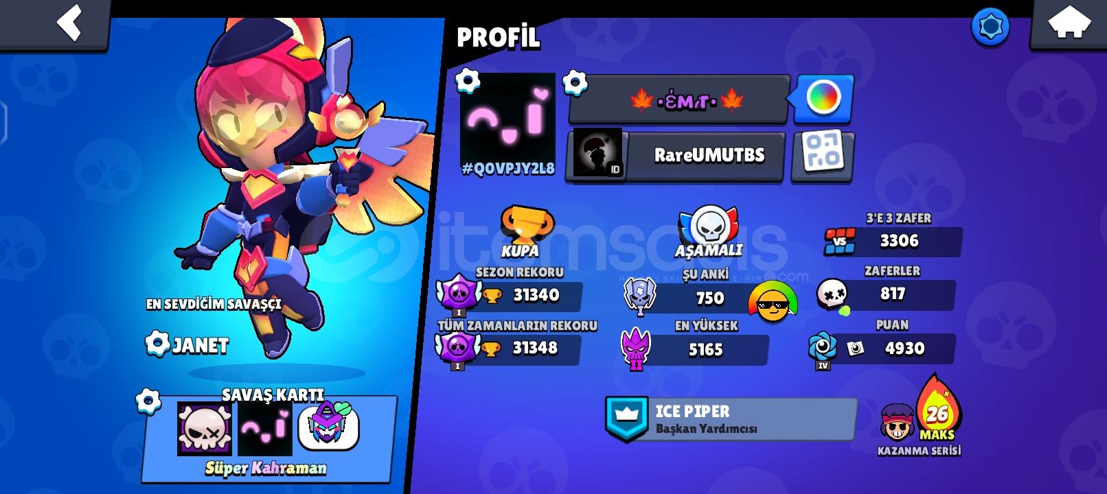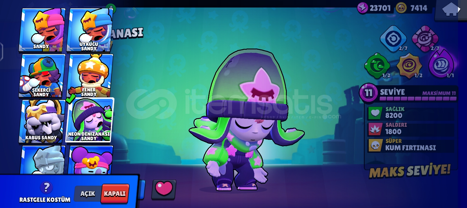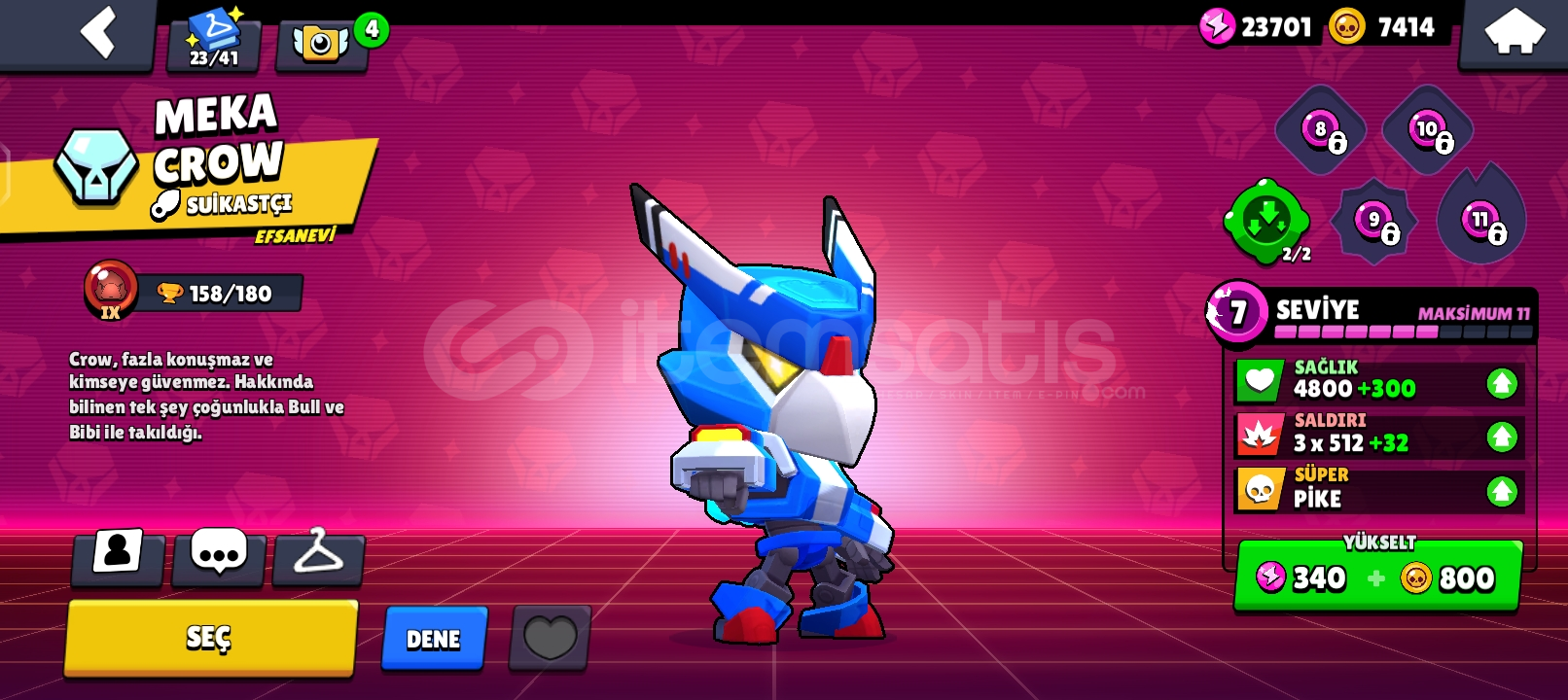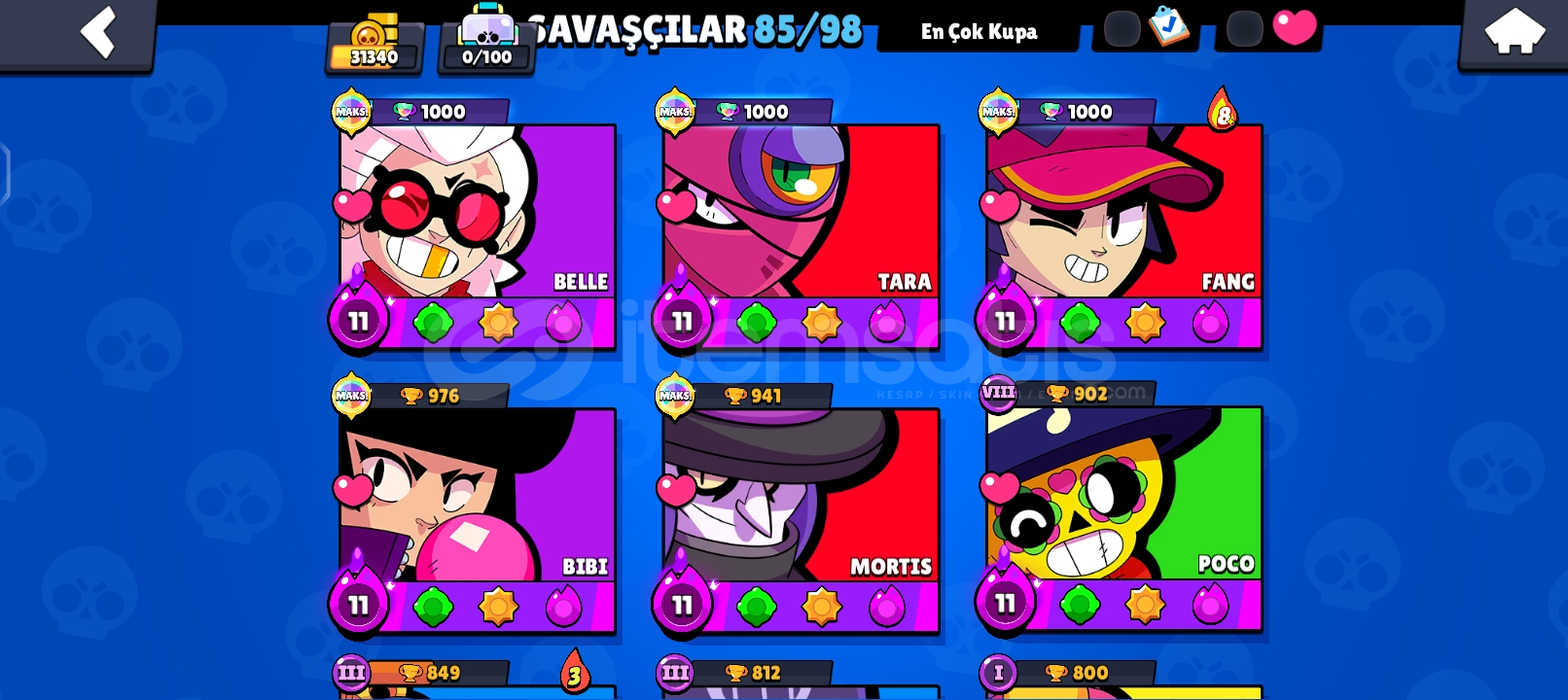 🌟 HESAP GENEL ÖZELLİKLERİ 🌟👤 Karakter Sayısı: 85 (Neredeyse Full!)🏆 Kupa: 31.000+⚡ Hiperşarj Sayısı: 15 ADET (Oyunun en güçlü karakterleri hazır!)🎭 DEV KOSTÜM KOLEKSİYONU (170+ ADET) 🔥 EFSANEVİ: Meka Mortis & Meka Crow🌈 HİPERŞARJ KOSTÜMÜ: 4 ADET...