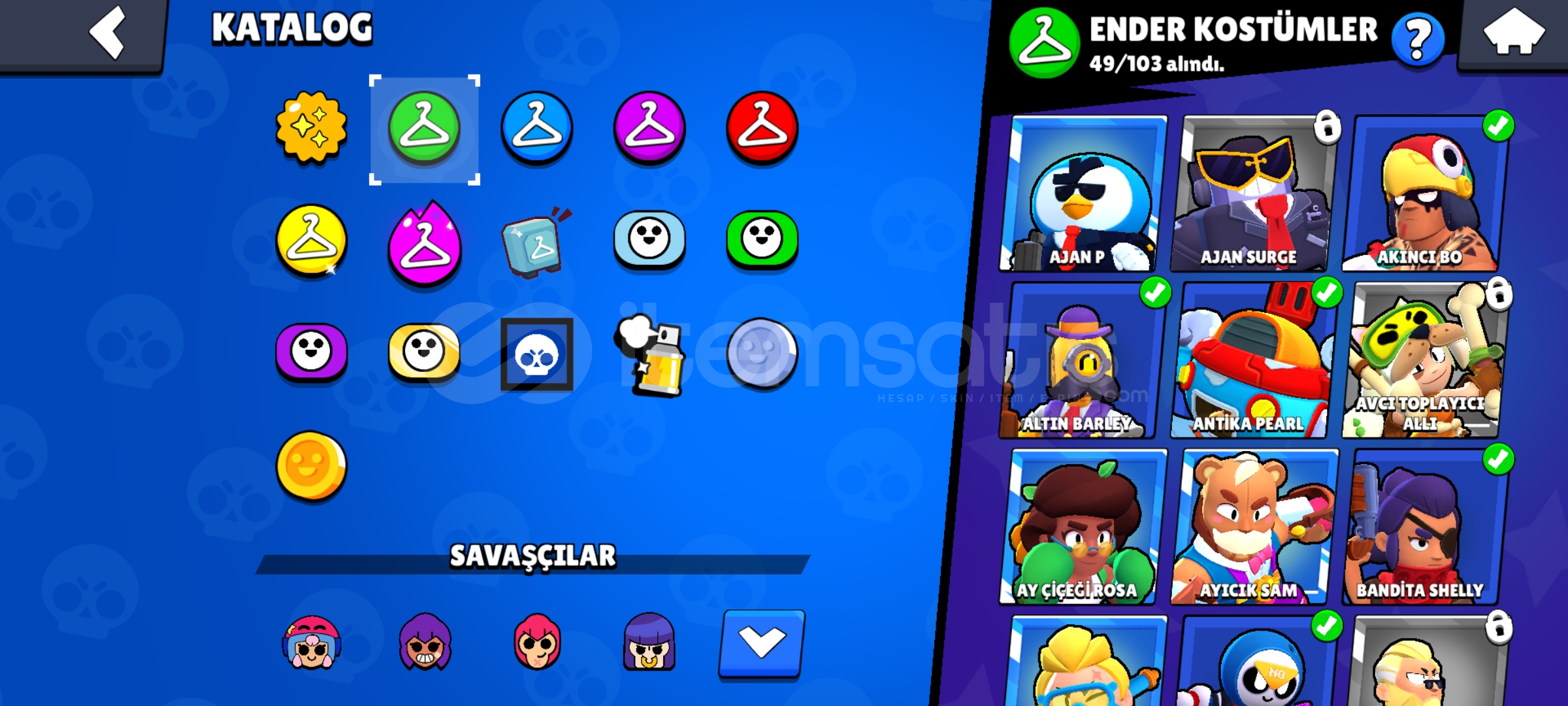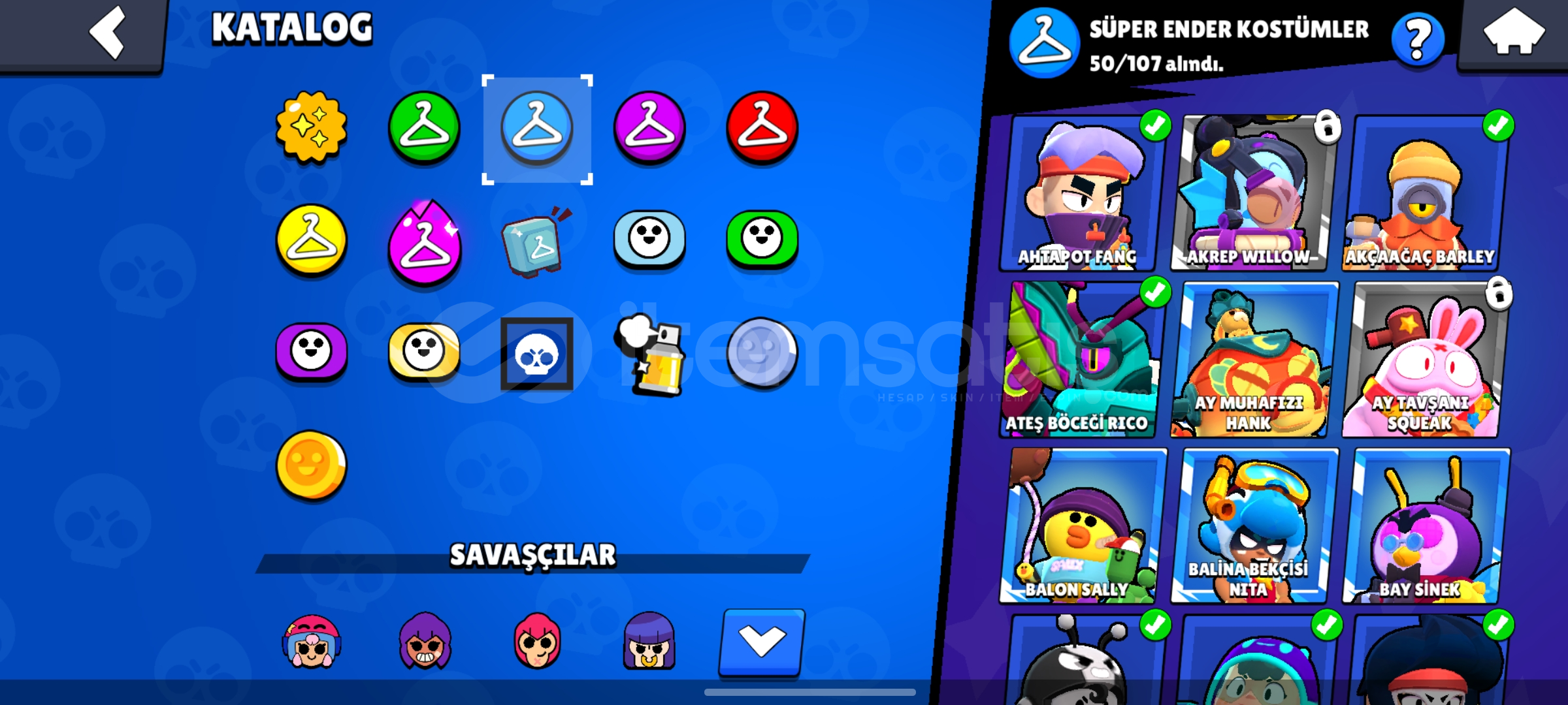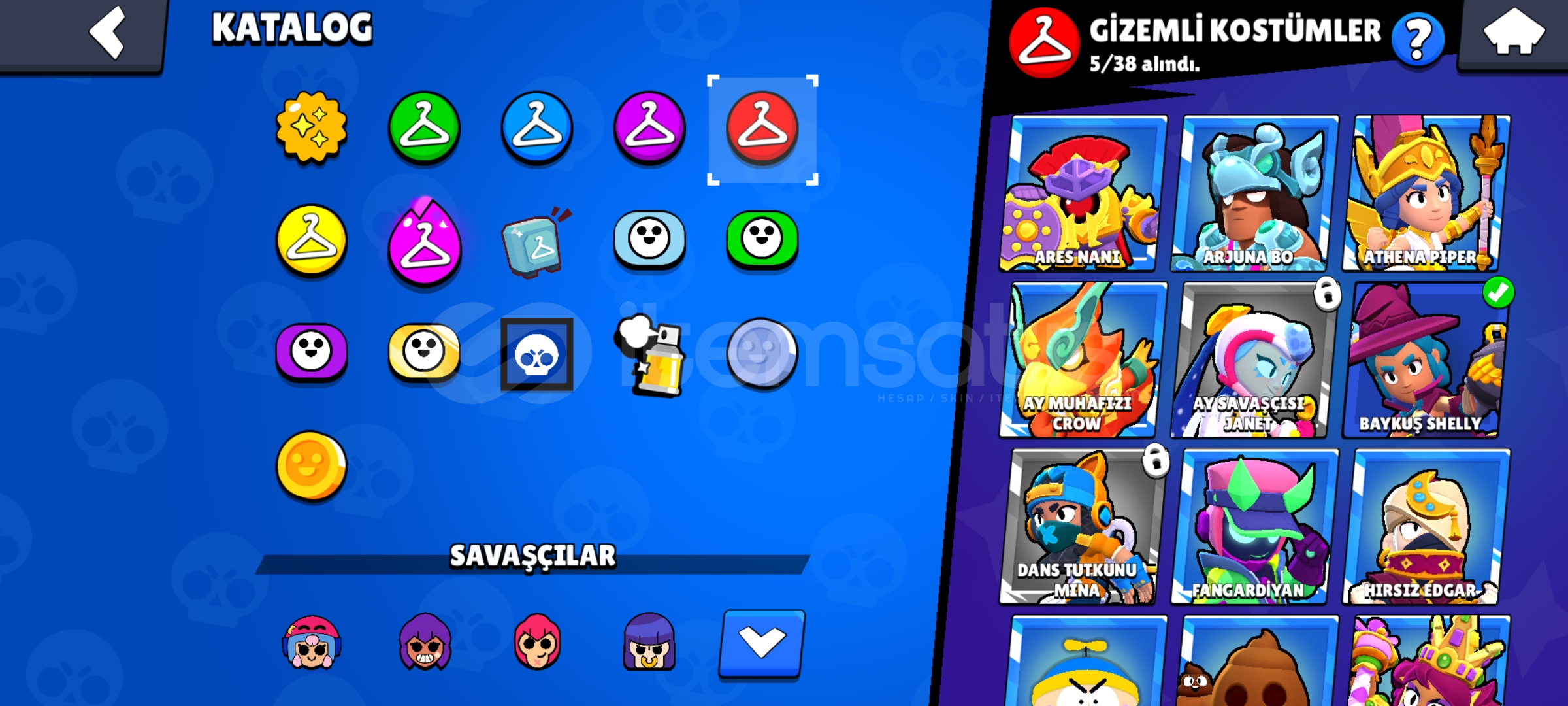 KOSTÜM SAYILARIEnder:49S.Ender:50Destansı:31Gizemli:5Efsanevi:2Hiperşarj Kostümü:4Hesapta 2 brawlpass açılmışBaşsız Stu,Baykuş Shelly ve Hiperşarj kostumleri gibi nadir ve güzel skinler vardırMail verilecektirKüçük bir indirim olur detaylı bilgi için DMSohbet bani var 2 haftalikAlmadan önce mesaj atın